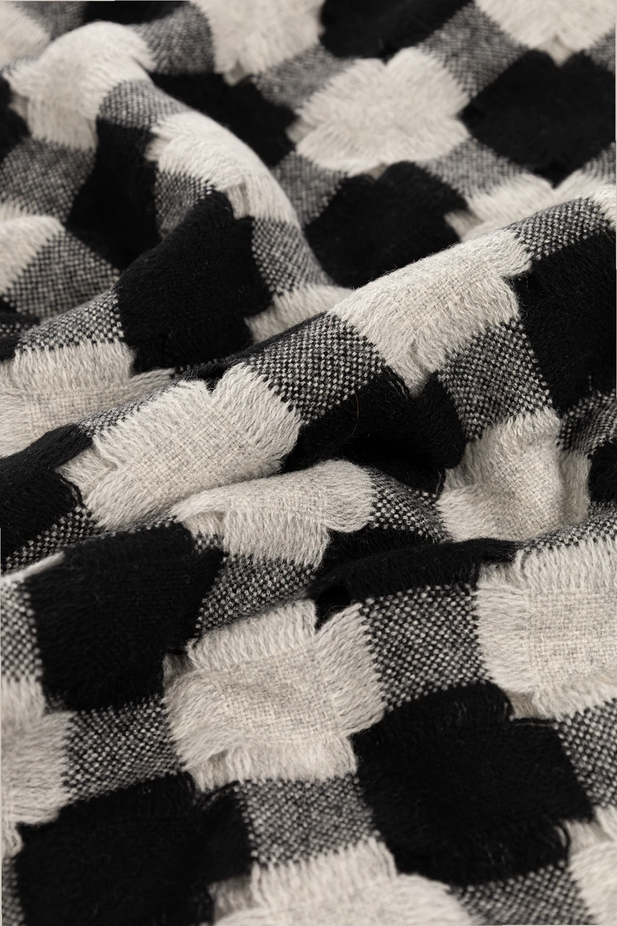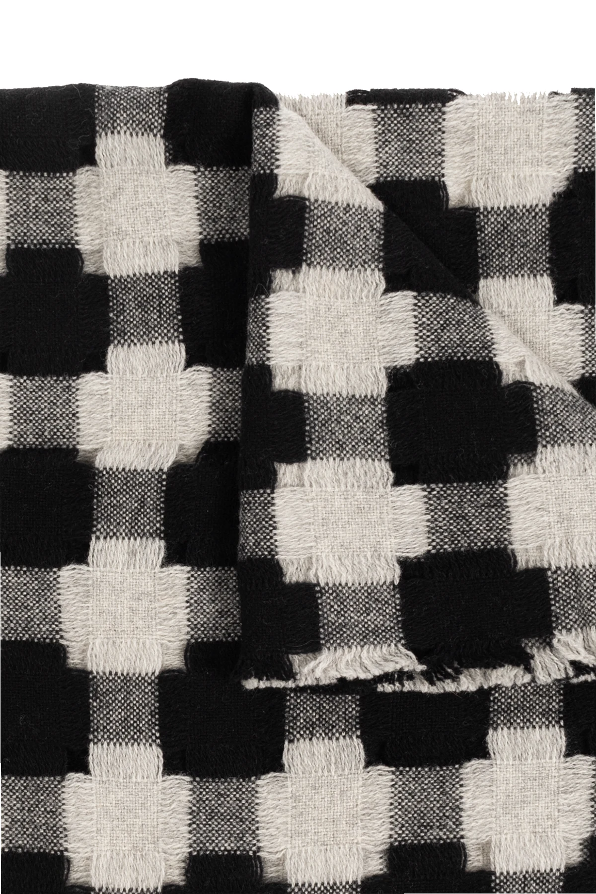 Szaro-czarny szal Issey Miyake Pleats Please. Wykonany z wełny. Ozdobiony wzorem w kratę.