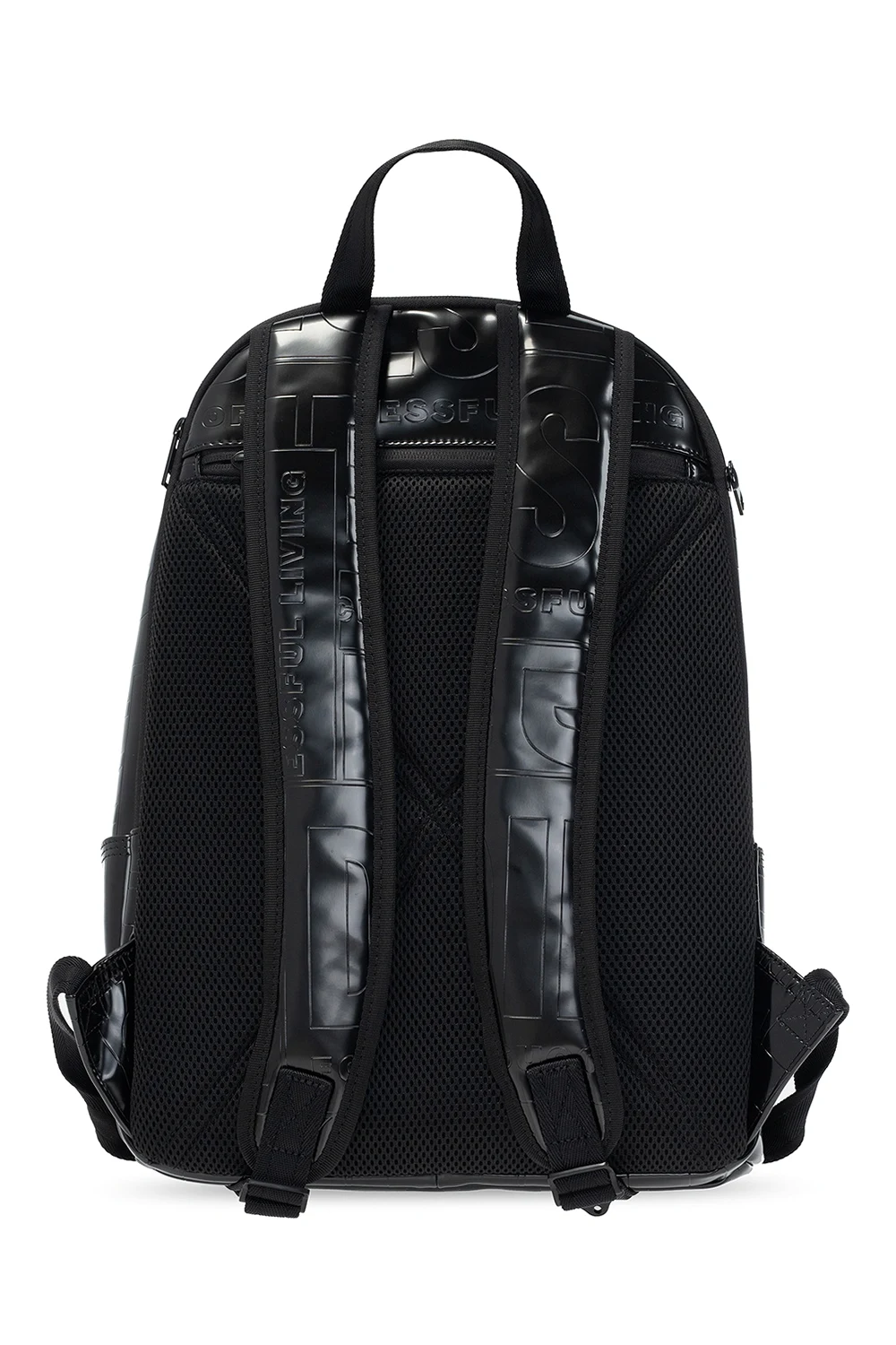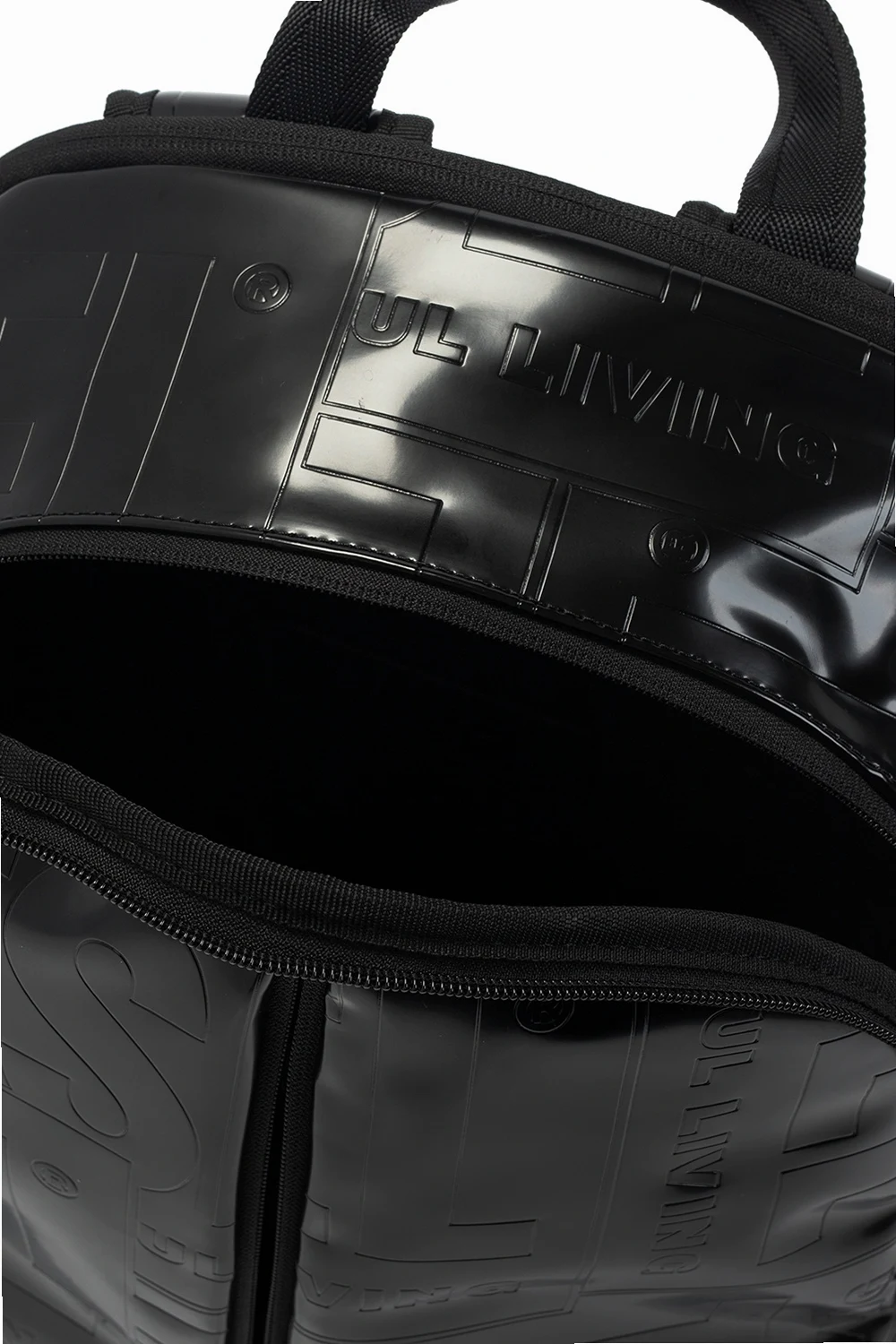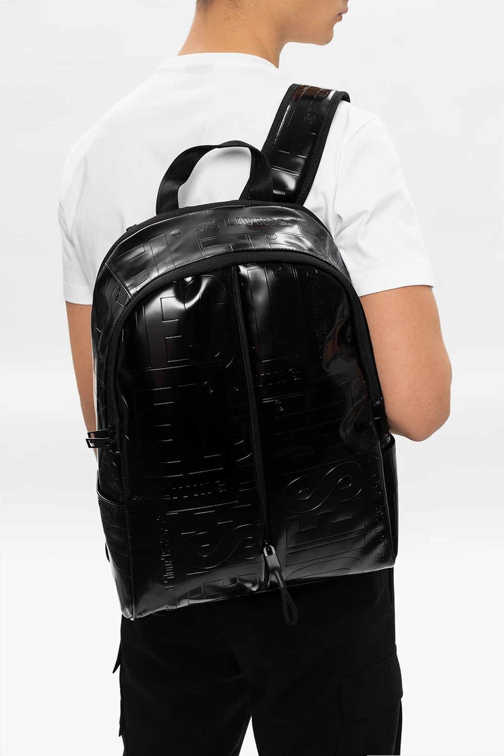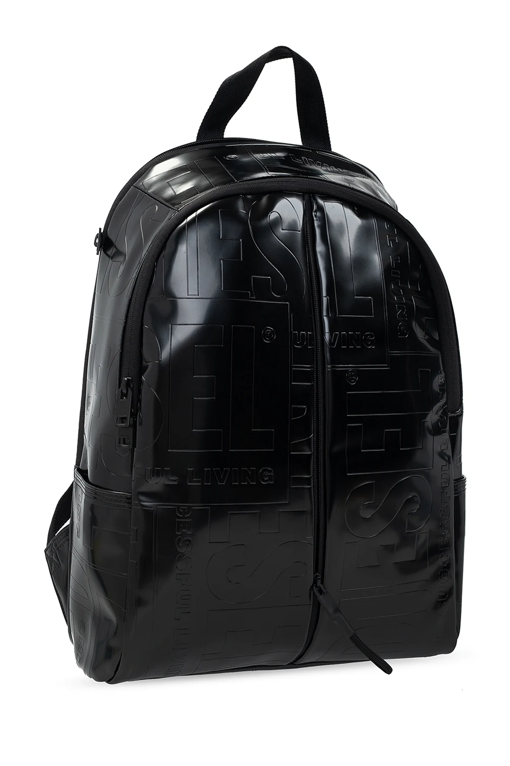 Czarny plecak Diesel. Zamykany na dwa dwubiegunowe zamki. Ozdobiony wytłoczonym wzorem z logo. Z przodu kieszeń zamykana na zamek. Po bokach dwie wsuwane kieszenie. Z tyłu zamykana na zamek. Półokrągła rączka. Regulowane szelki. Wewnątrz dwie przegrody – w jednej kieszeń zamykana na zamek.