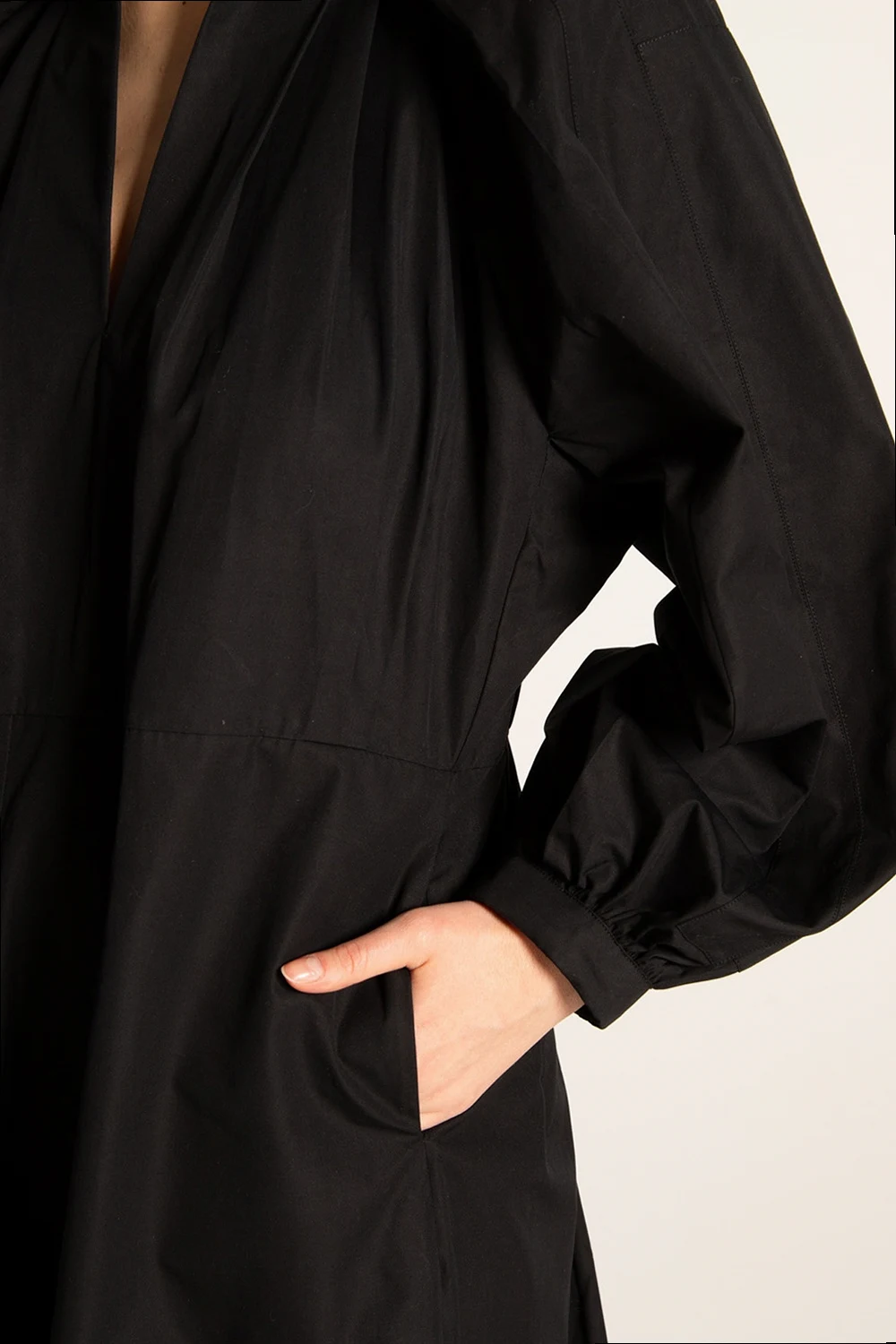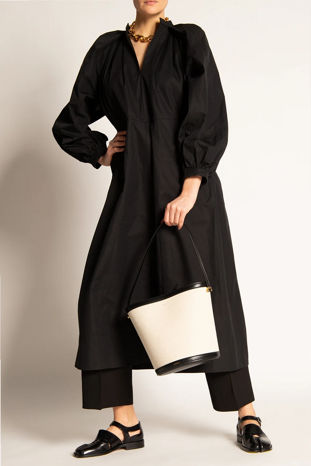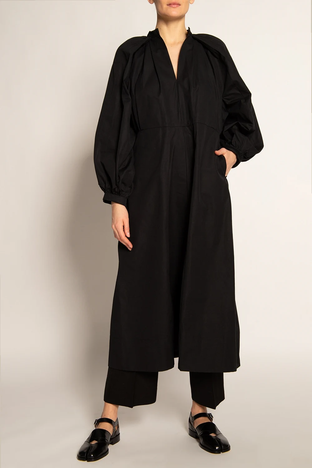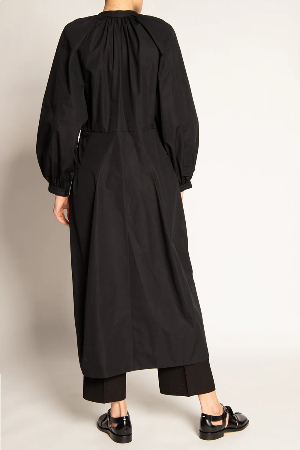 Czarna, bawełniana sukienka ze stójką Jil Sander. Ozdobiona przeszyciami oraz marszczeniami. Długie, bufiaste rękawy. Z przodu dwie wsuwane kieszenie.