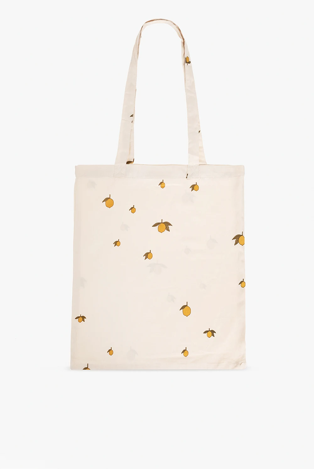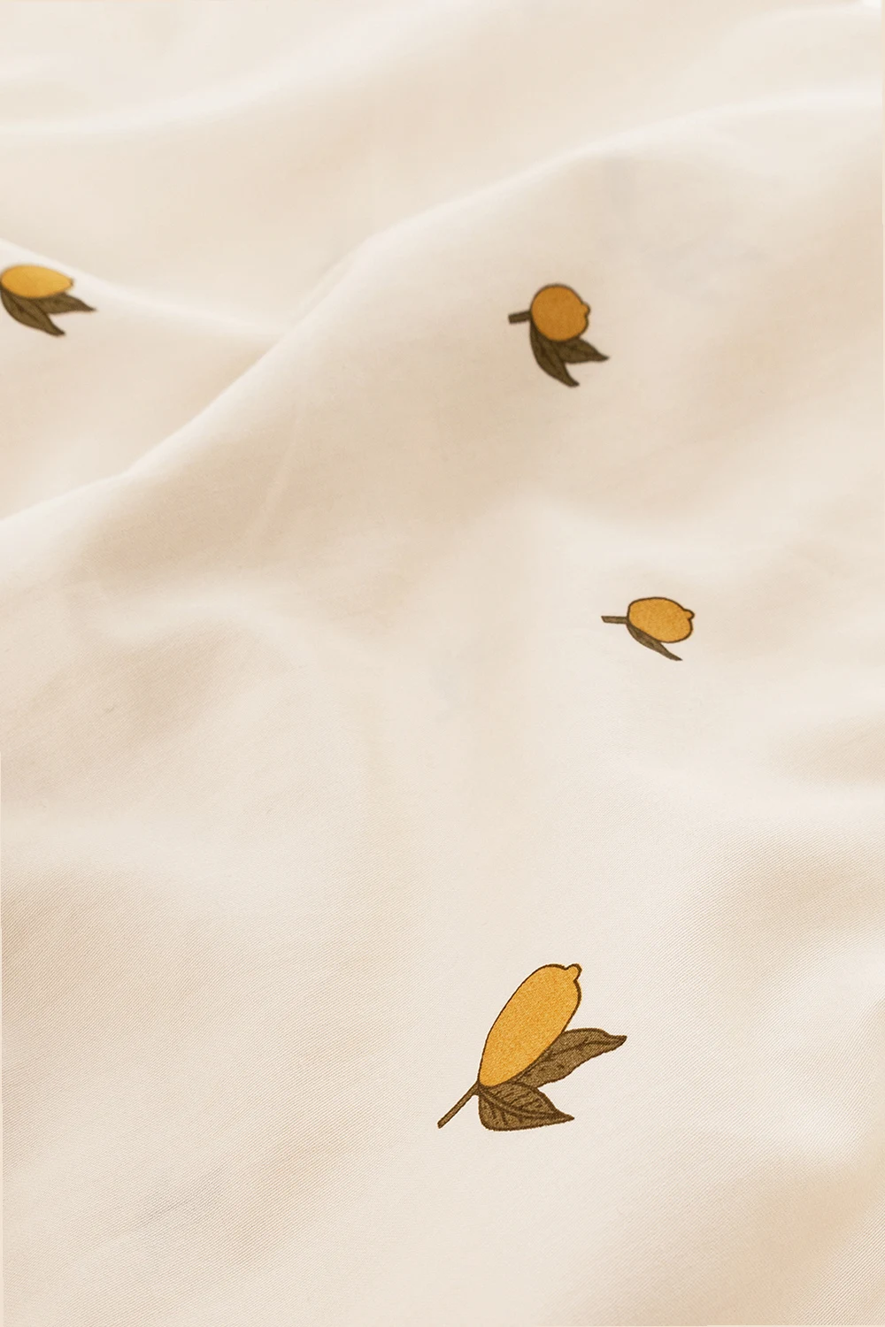 Kremowy komplet pościeli Konges Slojd. Zapinany na zamek. Wykonany z bawełny organicznej. Wzór z motywem cytryn. Dołączona torba płócienna.