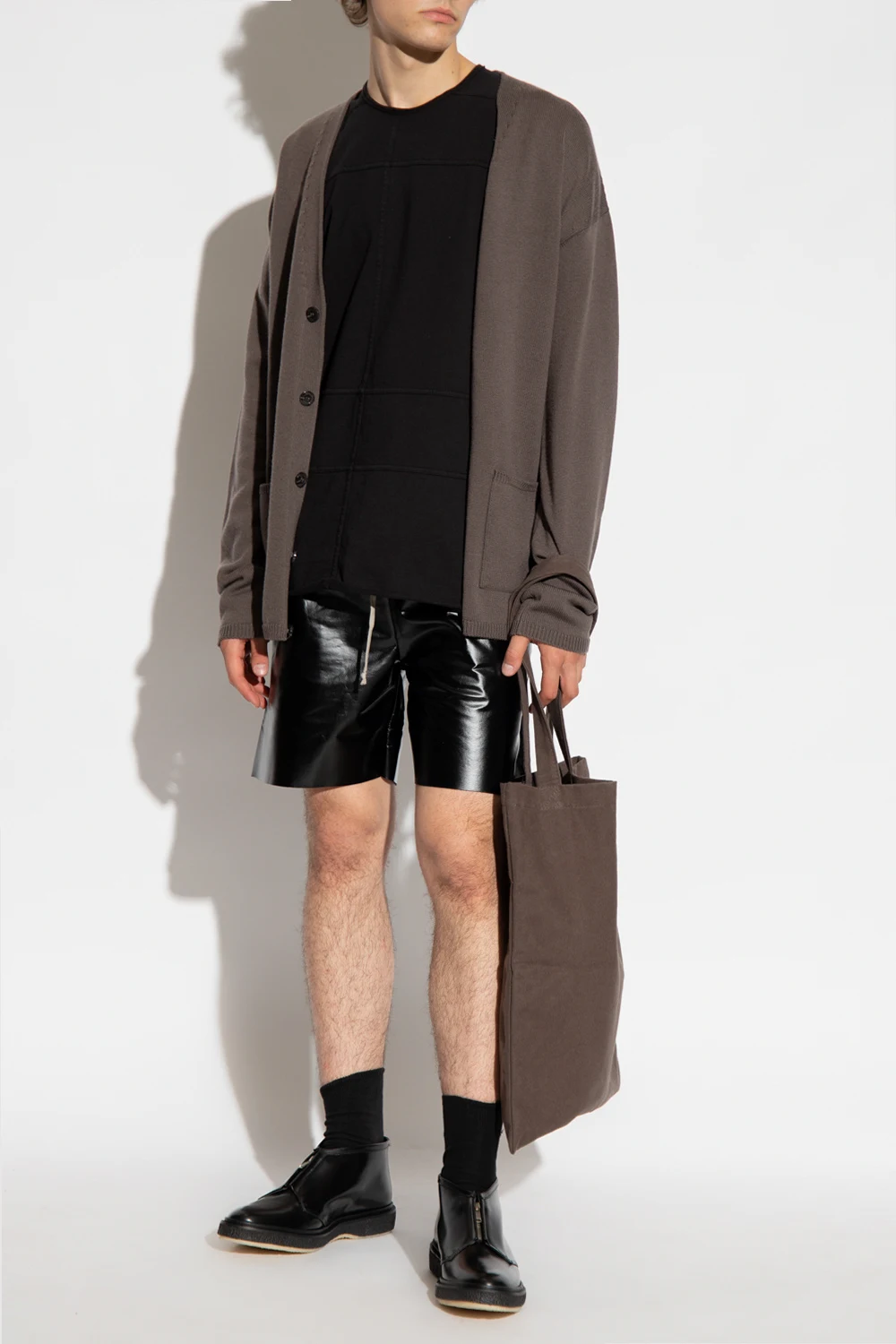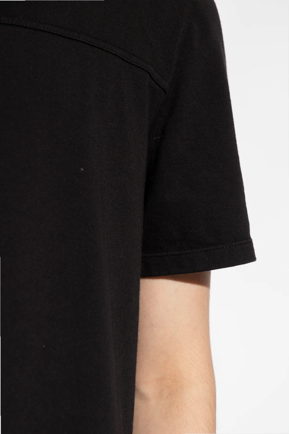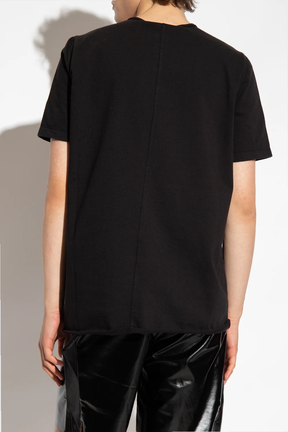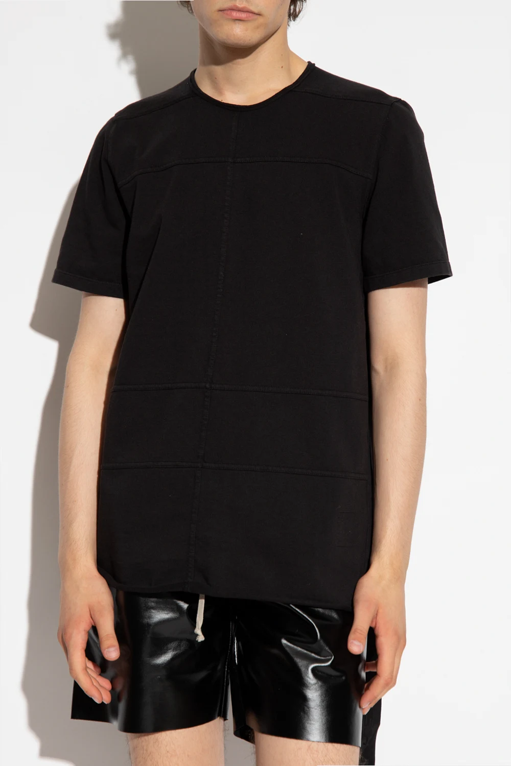 Czarny, bawełniany t-shirt o luźnym kroju Rick Owens DRKSHDW. Dekoracyjne przeszycia, okrągły dekolt wykończony lamówką oraz krótkie rękawy. Wewnątrz wszyty charakterystyczny dla marki pasek w kolorze czarnym.