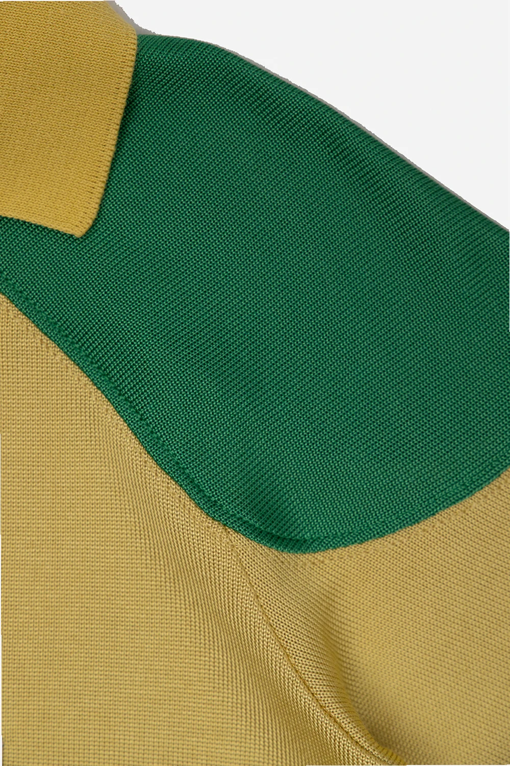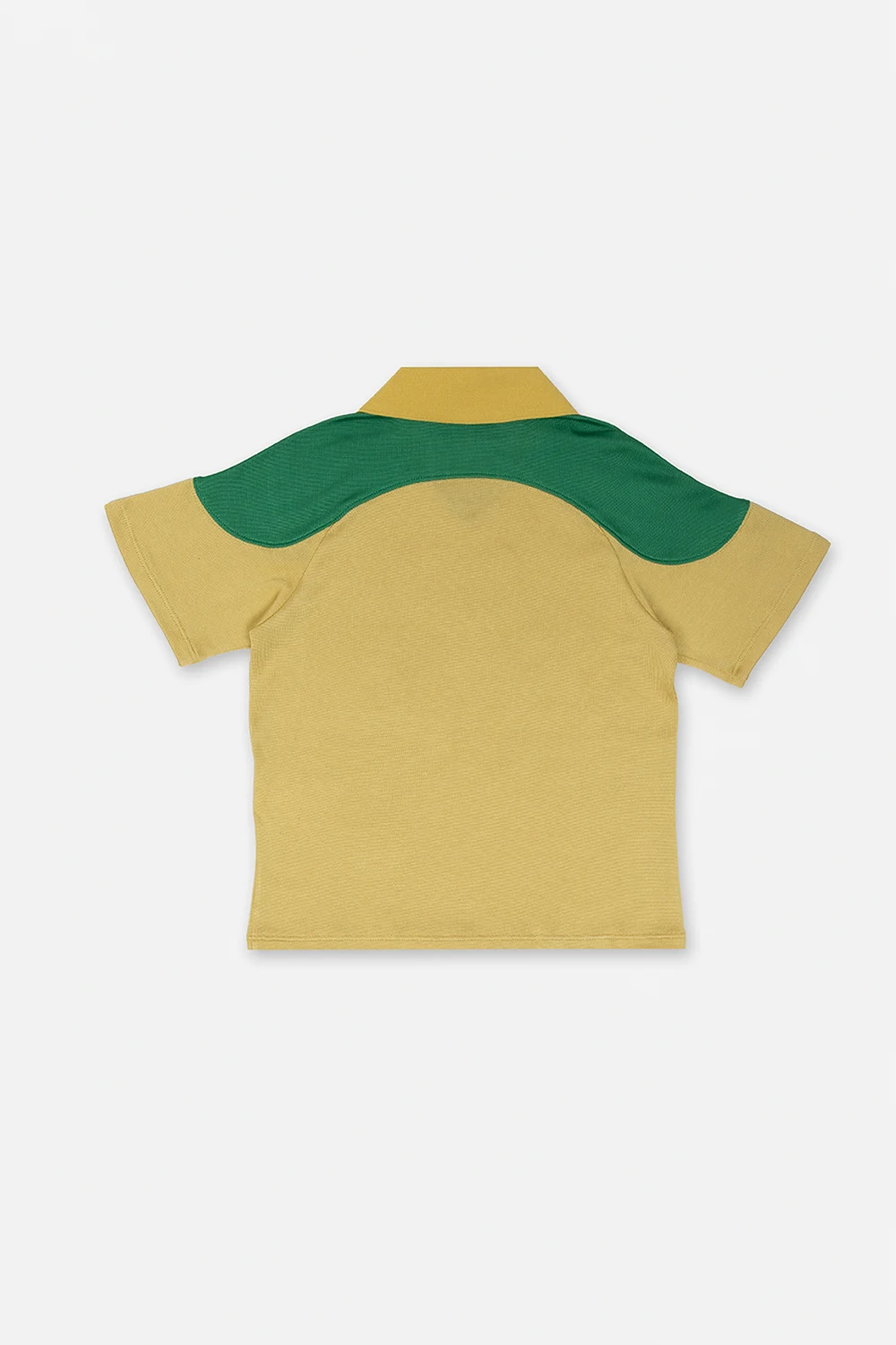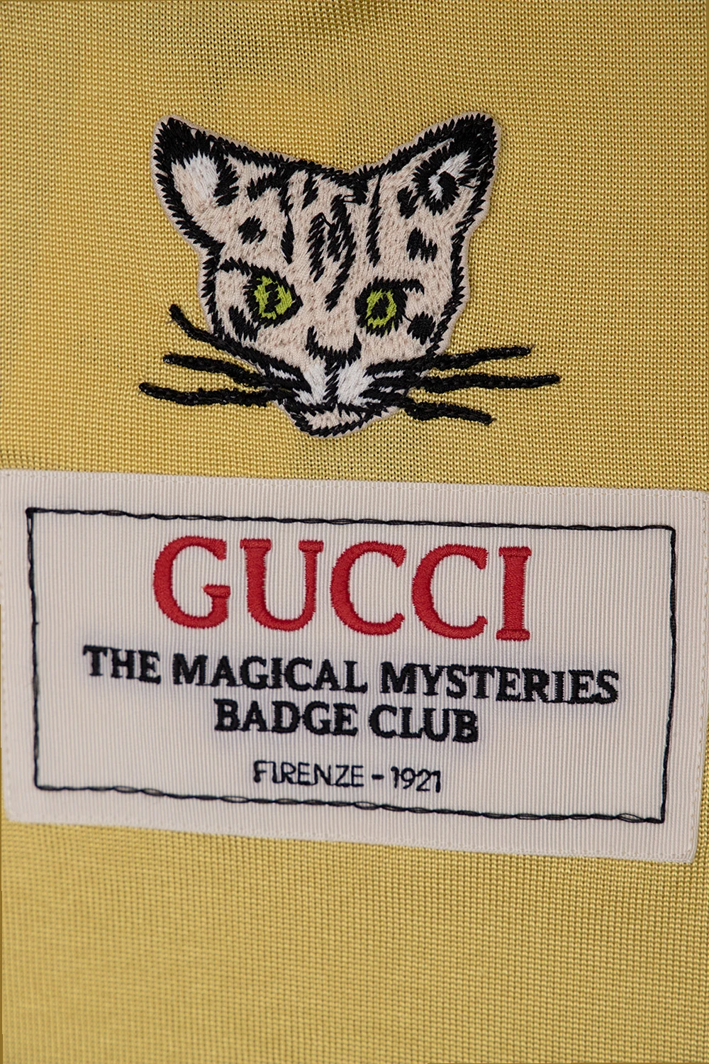 Żółto-zielone polo Gucci Kids. Z przodu ozdobione kolorowym nadrukiem i naszywkami z logo. Krótkie rękawy.