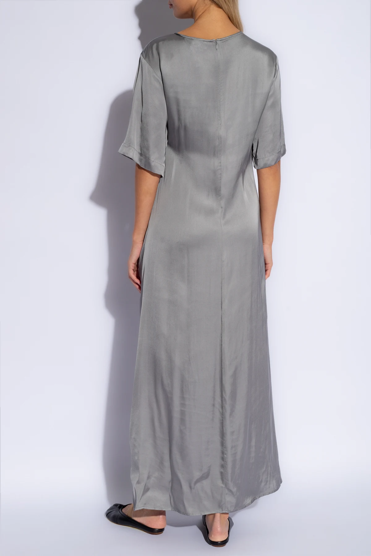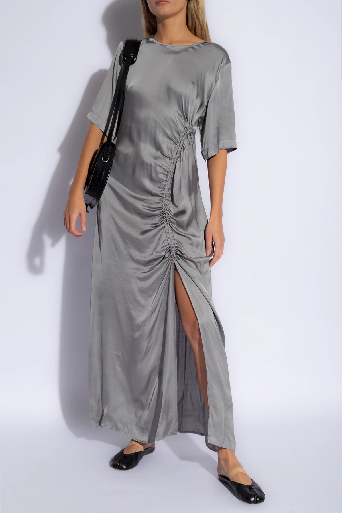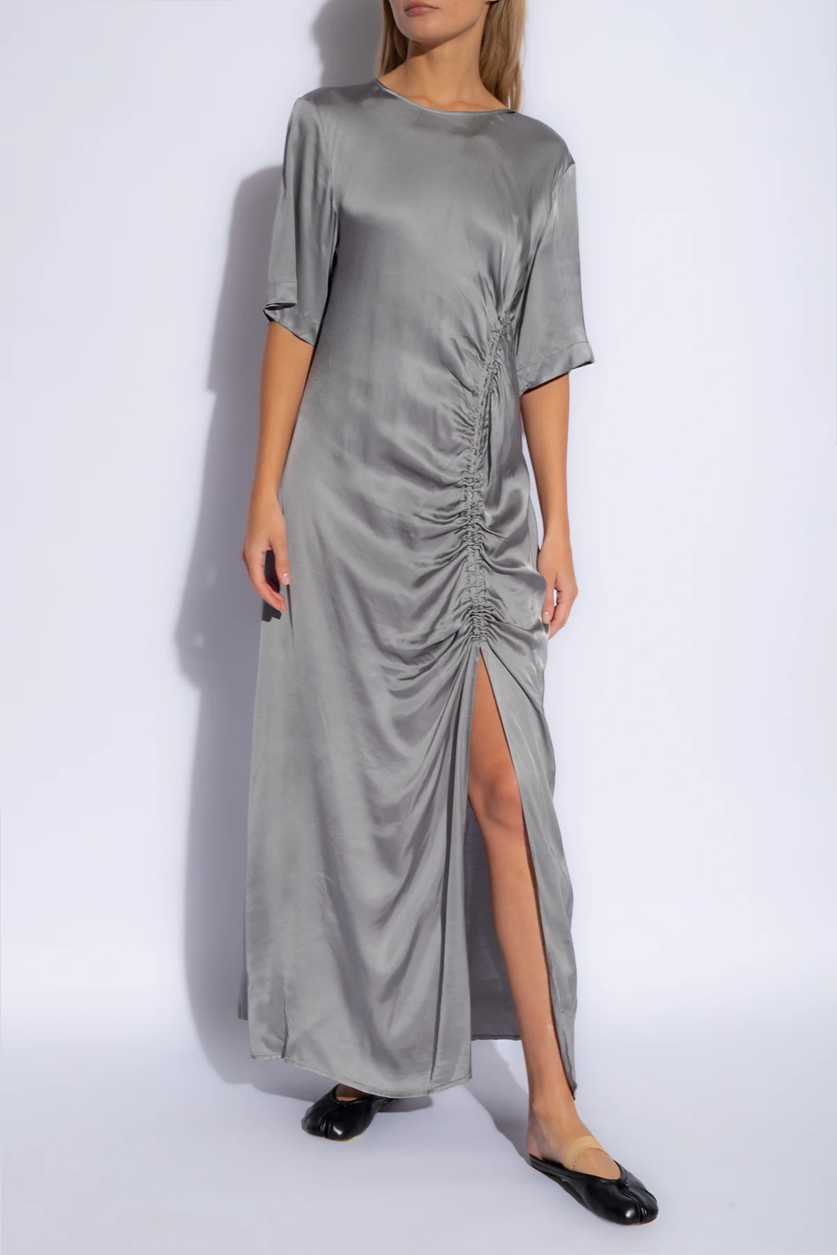 Charakteryzująca się długim krojem, sukienka delikatnie opada na podłoże, tworząc wokół noszącej ją aureolę tajemniczości. Długie, luźno opadające rękawy kończące się w połowie przedramienia, nadają kreacji lekkości, zaś okrągły dekolt subtelnie eksponuje szyję. Marszczenia na przodzie sukienki, wykonane z niezwykłą starannością, nie tylko wprowadzają element struktury, ale również modelują sylwetkę, dodając jej gracji. Z kolei wysokie rozcięcie z lewej strony odsłania nogę, wnosząc nutę zmysłowości do tej ponadczasowej kreacji.