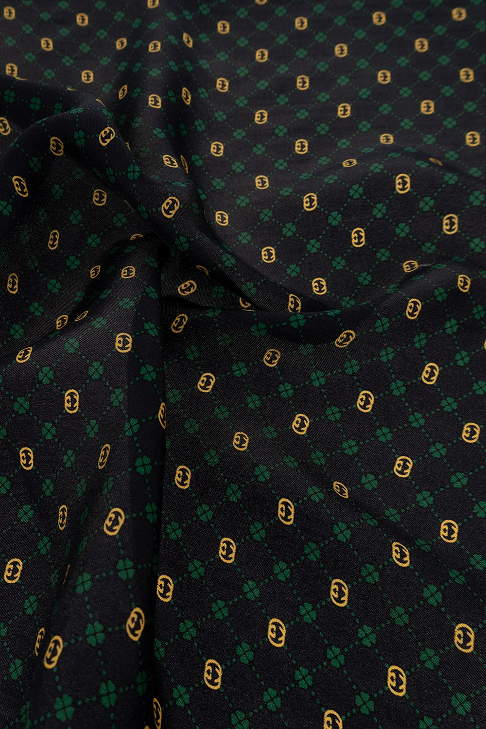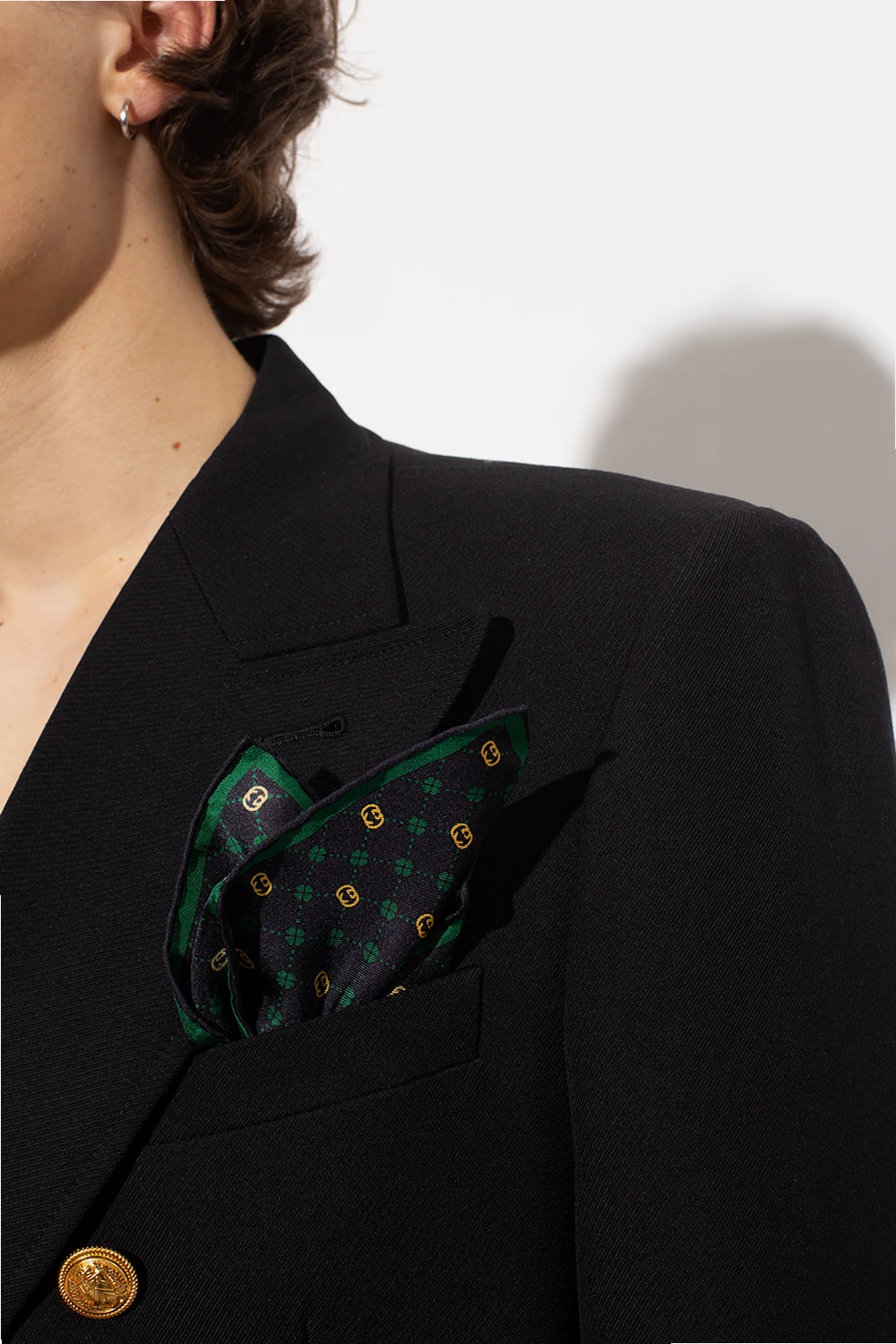 Granatowa, jedwabna poszetka Gucci. Ozdobiona żółto-zielonym nadrukiem ze wzorem ‘GG’ i czterolistnej koniczyny.