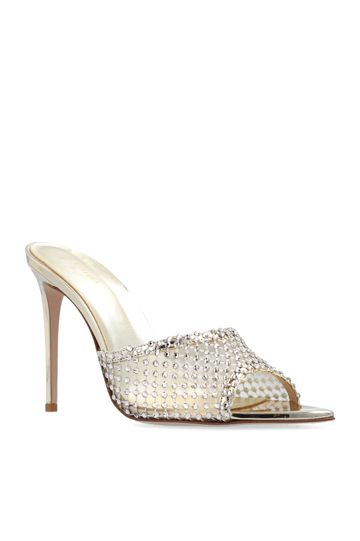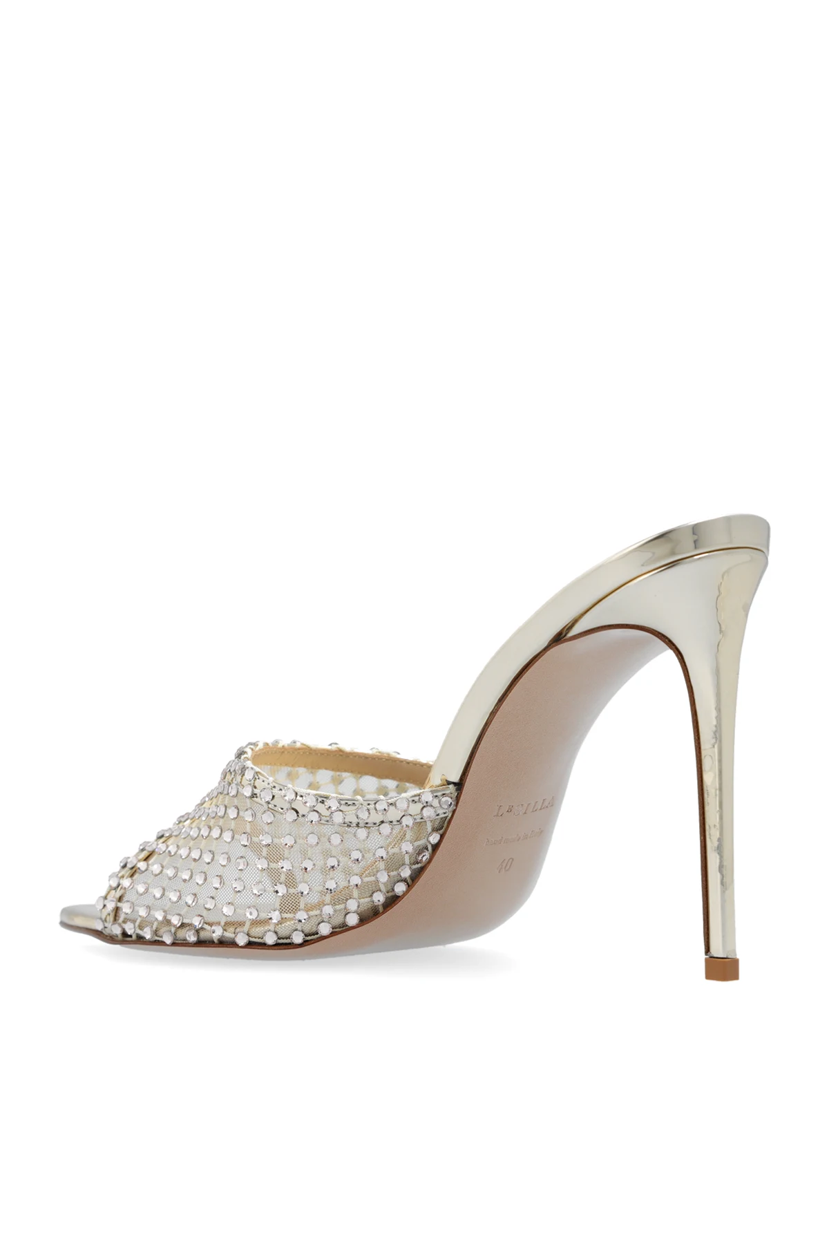 Charakteryzują się one wysokim, smukłym obcasem typu szpilka, co w połączeniu z otwartymi palcami podkreśla ich stylowy charakter. Cholewka, pokryta wieloma małymi, lśniącymi detalami, nadaje butom efekt glamour, idealny do formalnych zgromadzeń lub letnich wieczorów. Wnętrze buta, wykończone w złotym odcieniu, zapewnia komfort noszenia przy jednoczesnym zachowaniu wysokiej estetyki. Dodatkowo, złote logo projektanta na wewnętrznej podeszwie stanowi dyskretny, lecz istotny element identyfikacyjny dla marki. Elegancki, metaliczny wygląd obcasa kontrastuje z bogactwem zdobień, tworząc harmonijną całość.