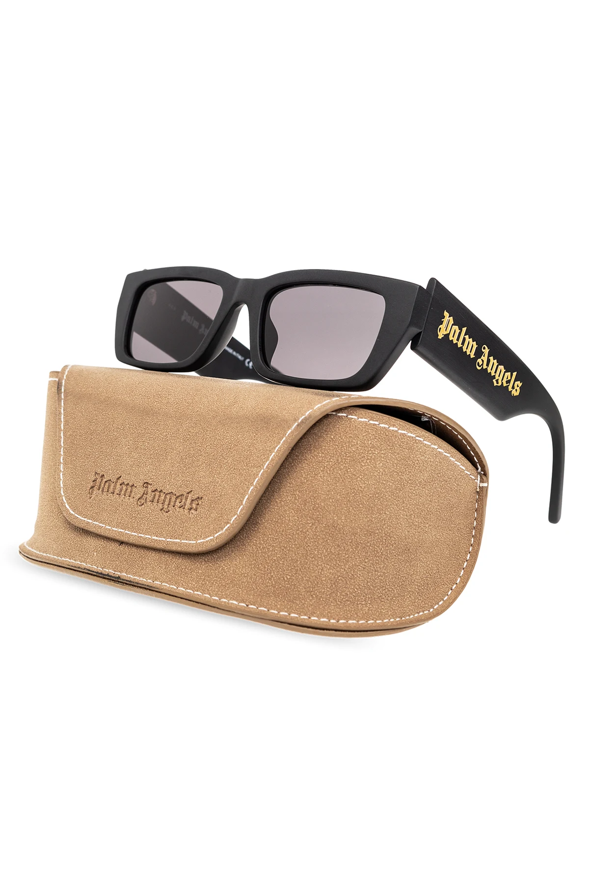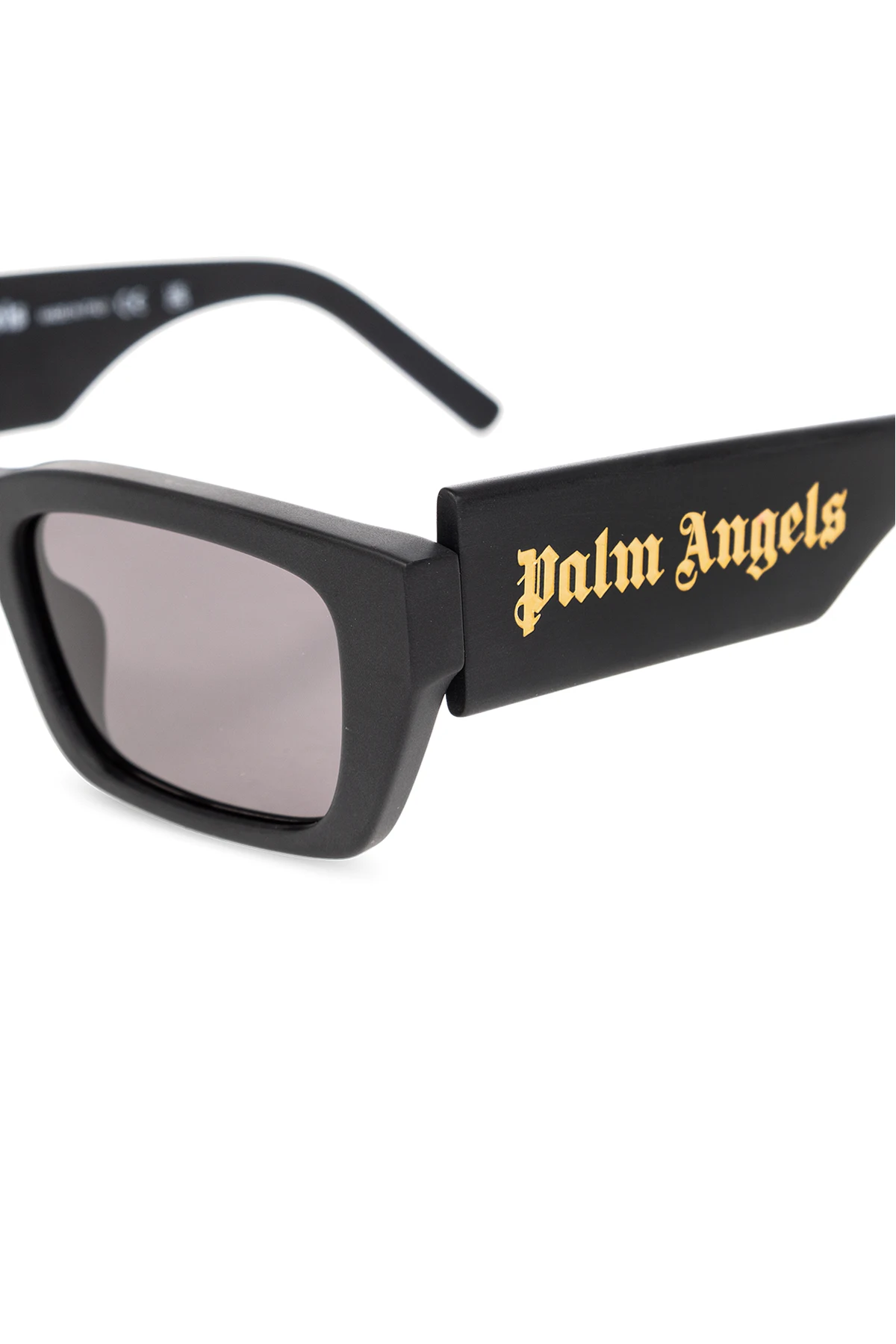 Czarne, matowe okulary przeciwsłoneczne, model ‘Pam’ Palm Angels. Prostokątne oprawki. Zauszniki ozdobione wytłoczonym logo w kolorze złotym. Szare soczewki ze 100% ochroną przed promieniowaniem UV. Dołączone etui.
