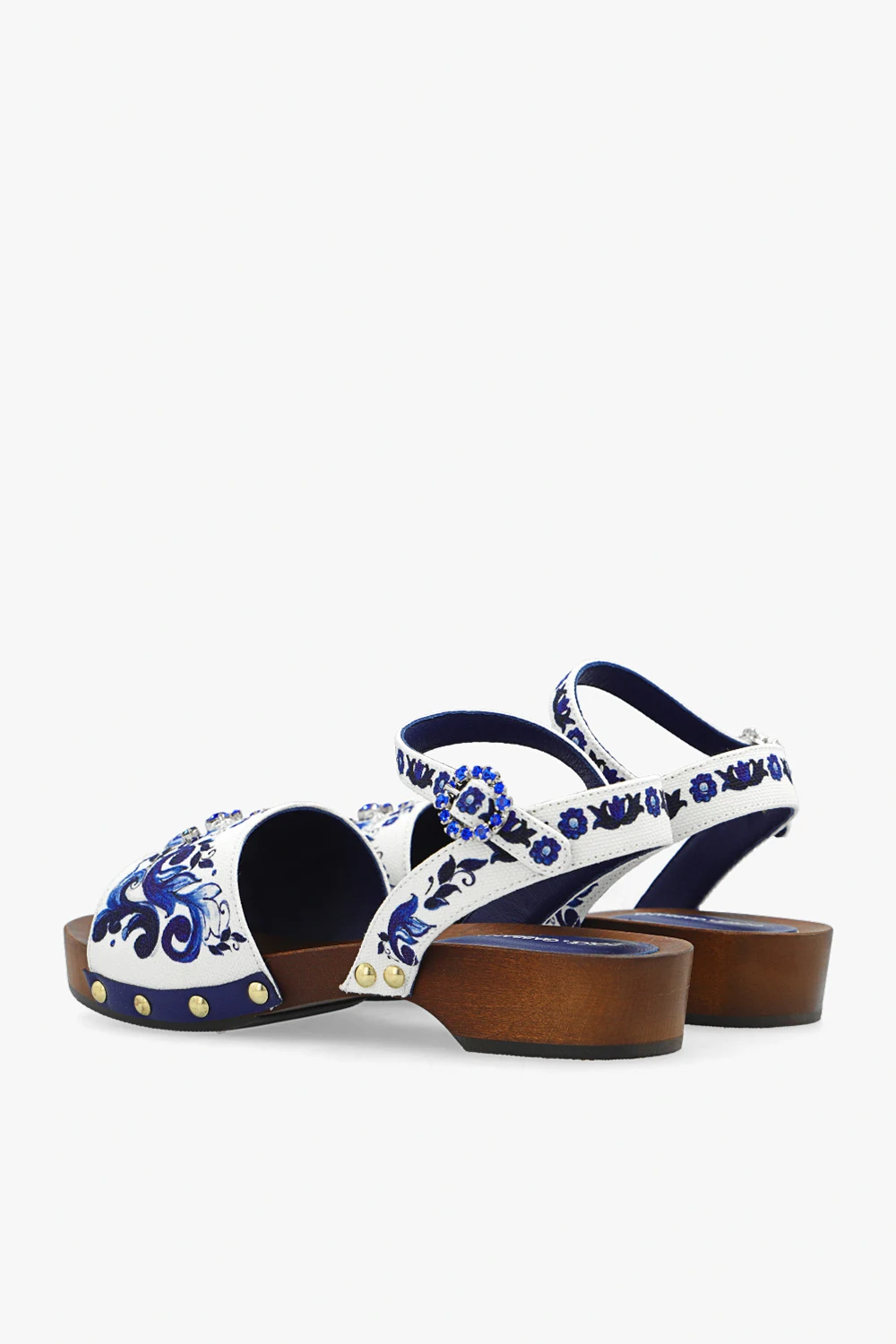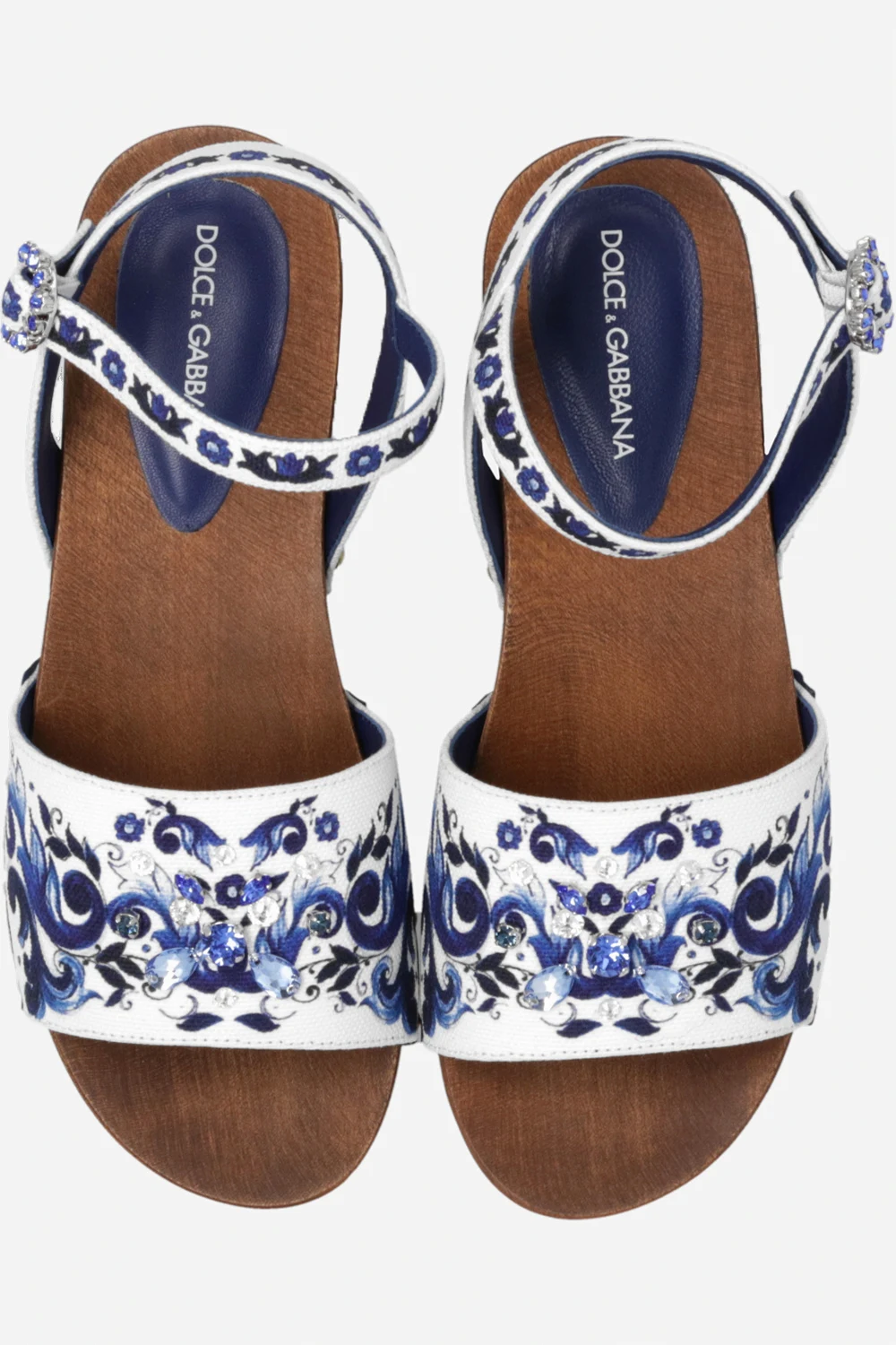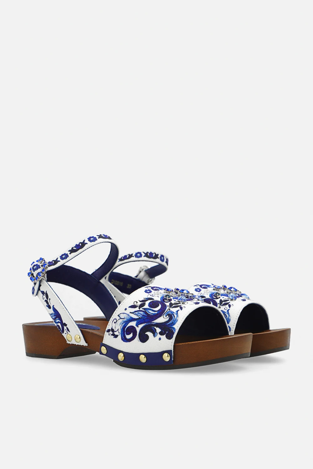 Białe sandały Dolce & Gabbana Kids. Wykonane z płótna i wykończone skórą, Zapinane wokół kostki na regulowany pasek z dekoracyjną klamrą. Ozdobione niebiesko-granatowym, malarskim wzorem z motywem roślinnym oraz połyskującymi kamieniami. Brązowa, drewniana podeszwa wykończona gumą.