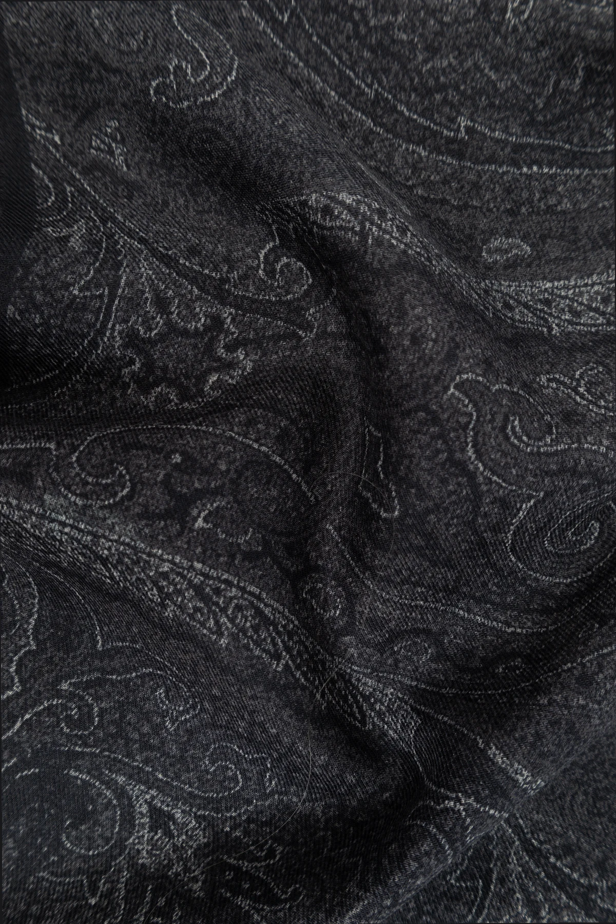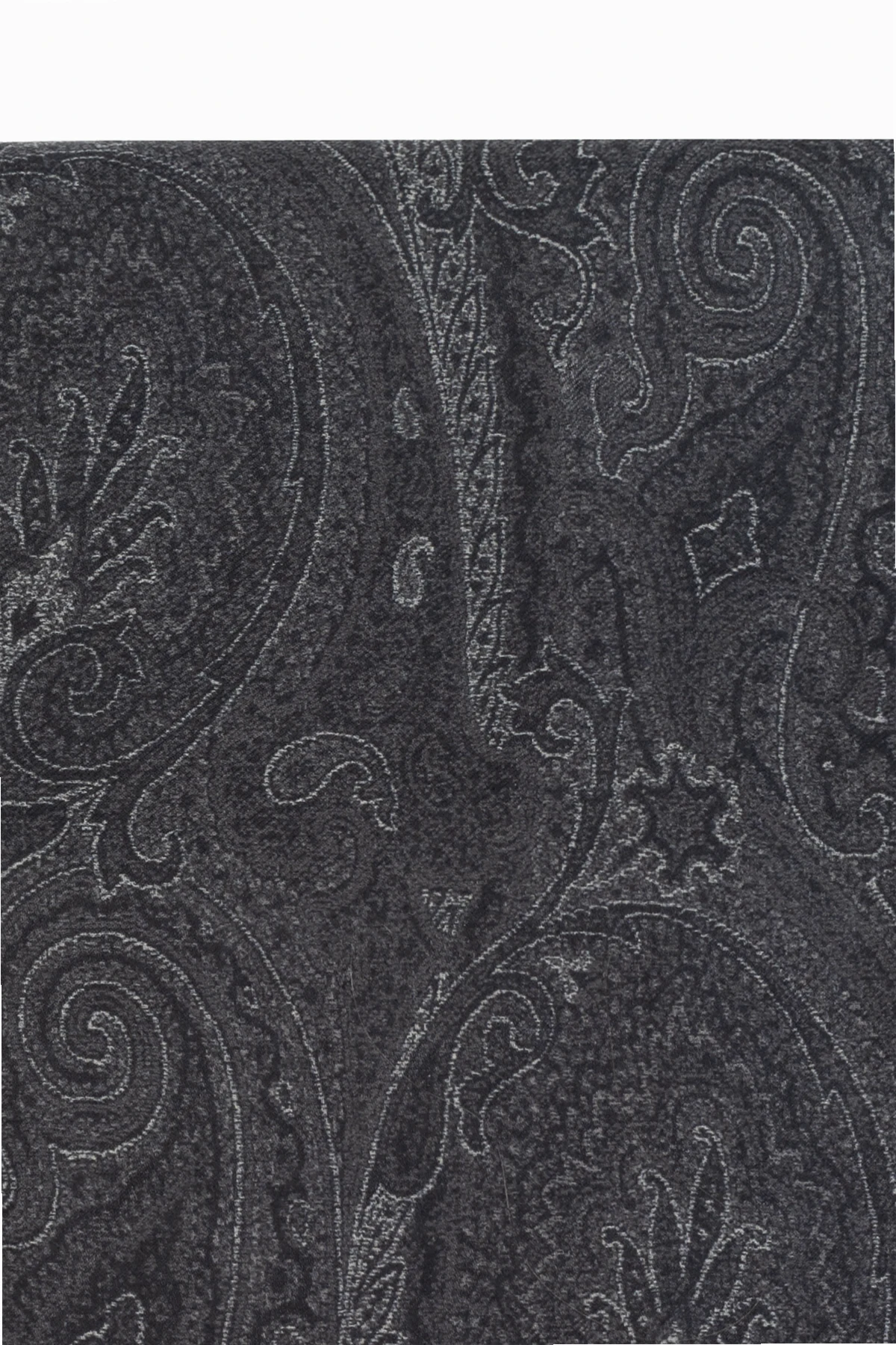 Prezentujemy Państwu ekskluzywny szal męski od Etro , który łączy w sobie kunsztowny wzór paisley z wysokogatunkową mieszanką modalu i kaszmiru . Dominujący granatowo-jasnoszary kolor oraz subtelne motywy przypominające kształty liści lub kropli, splecione w harmonijną całość, nadają temu akcesorium eleganckiej, lecz niekrzykliwej prezencji. Delikatna faktura tkaniny, wzbogacona o lekki połysk, podkreśla luksusowy charakter szala.