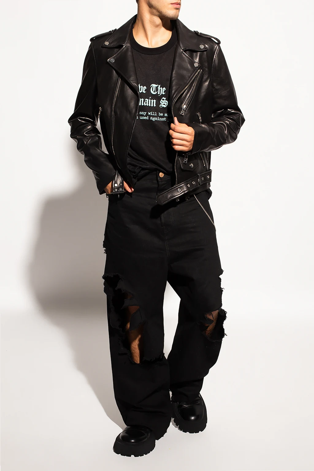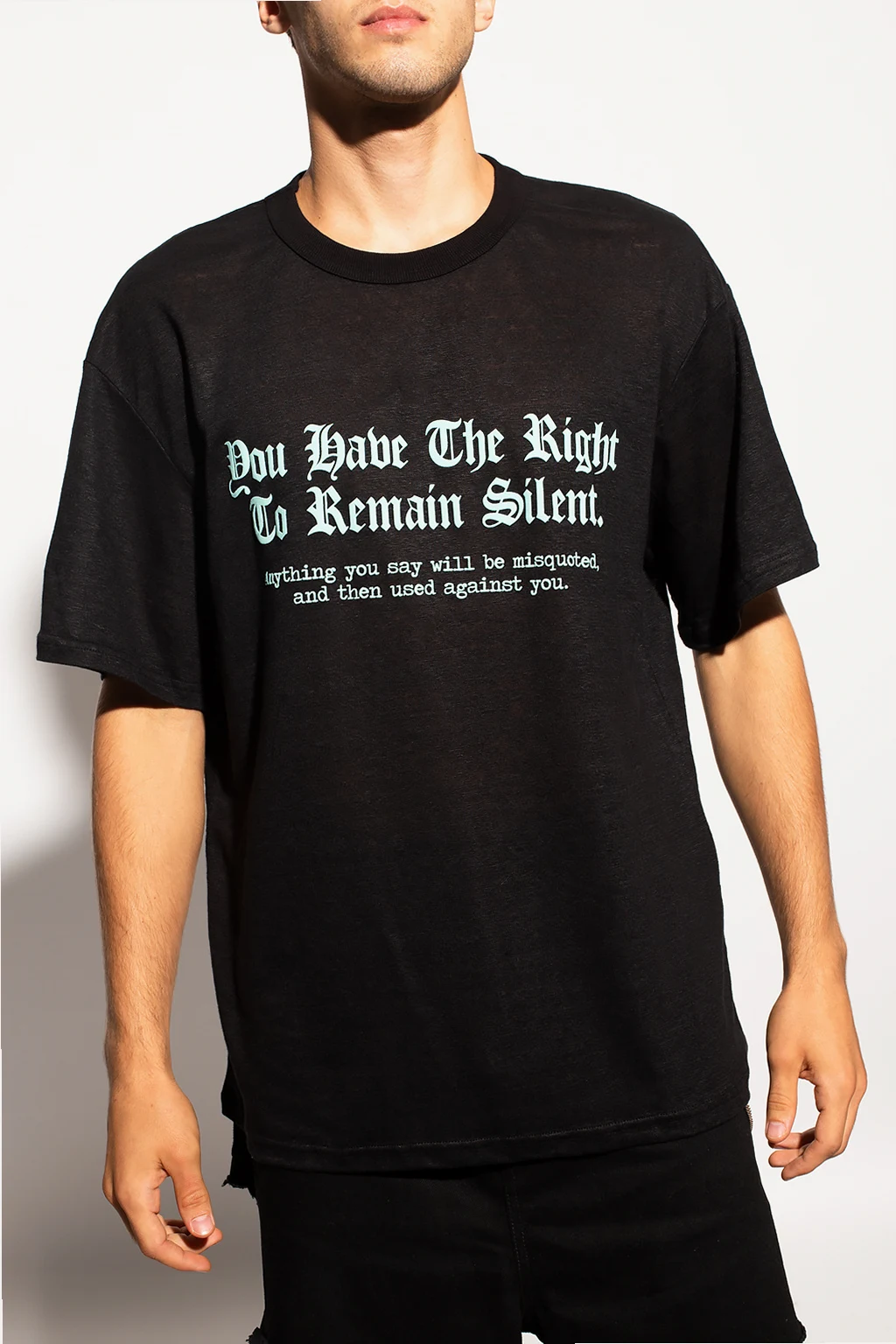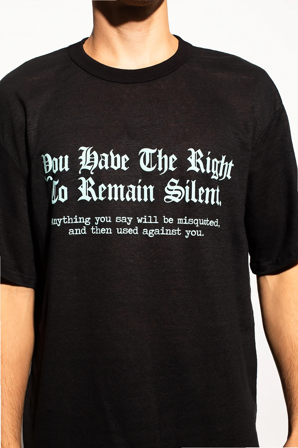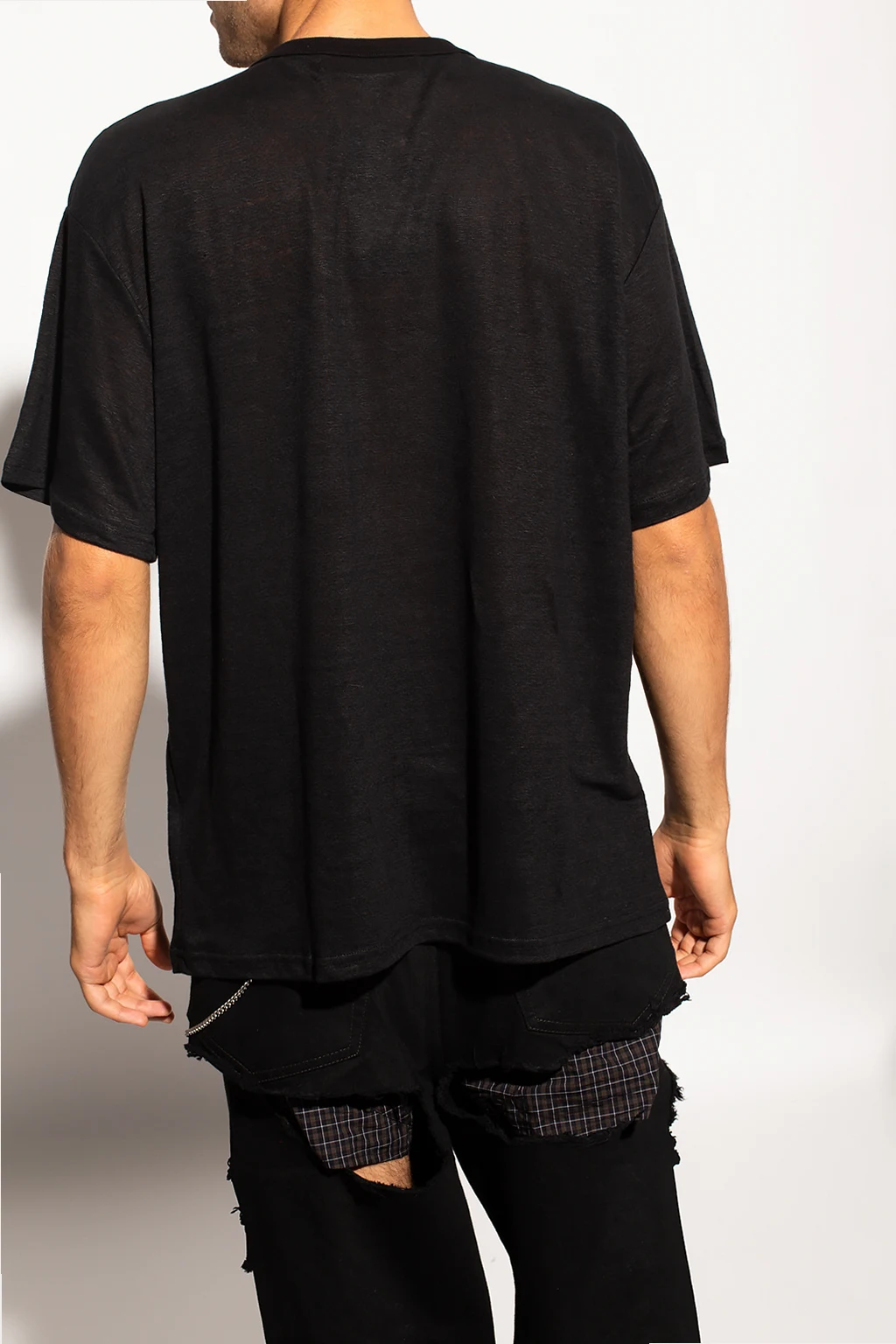 Czarny t-shirt MISBHV. Wykonany z lnu. Ozdobiony nadrukowanym wzorem z logo w kolorze jasnoniebieskim. Okrągły t-shirt wykończony ściągaczem. Krótkie rękawy.