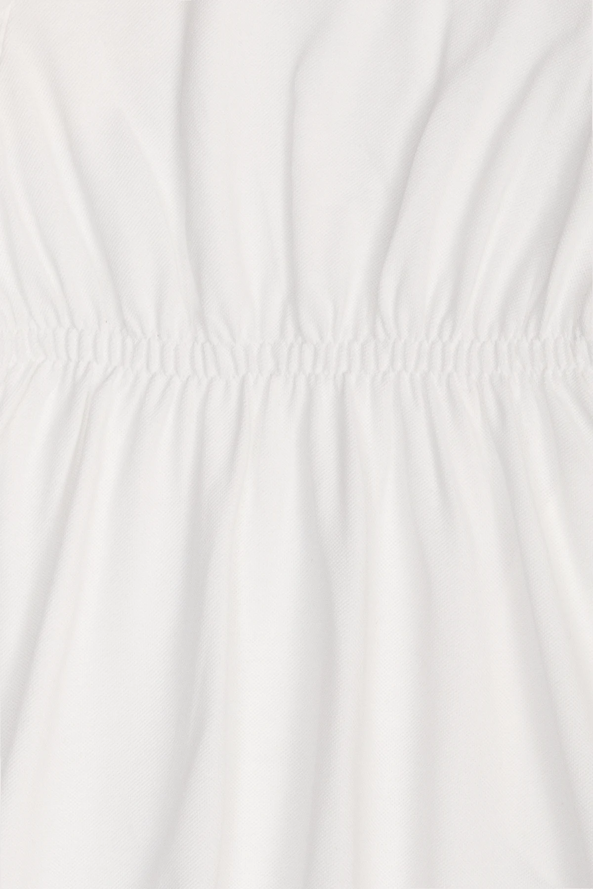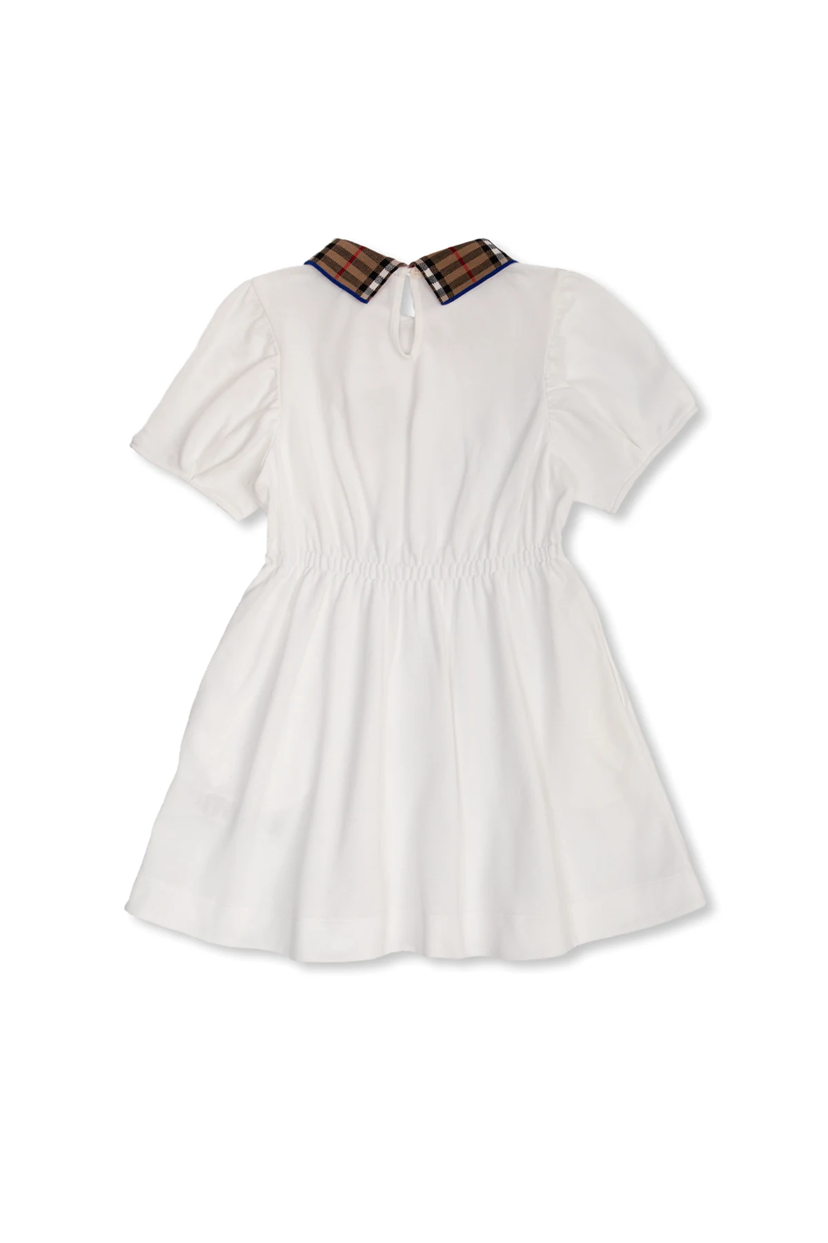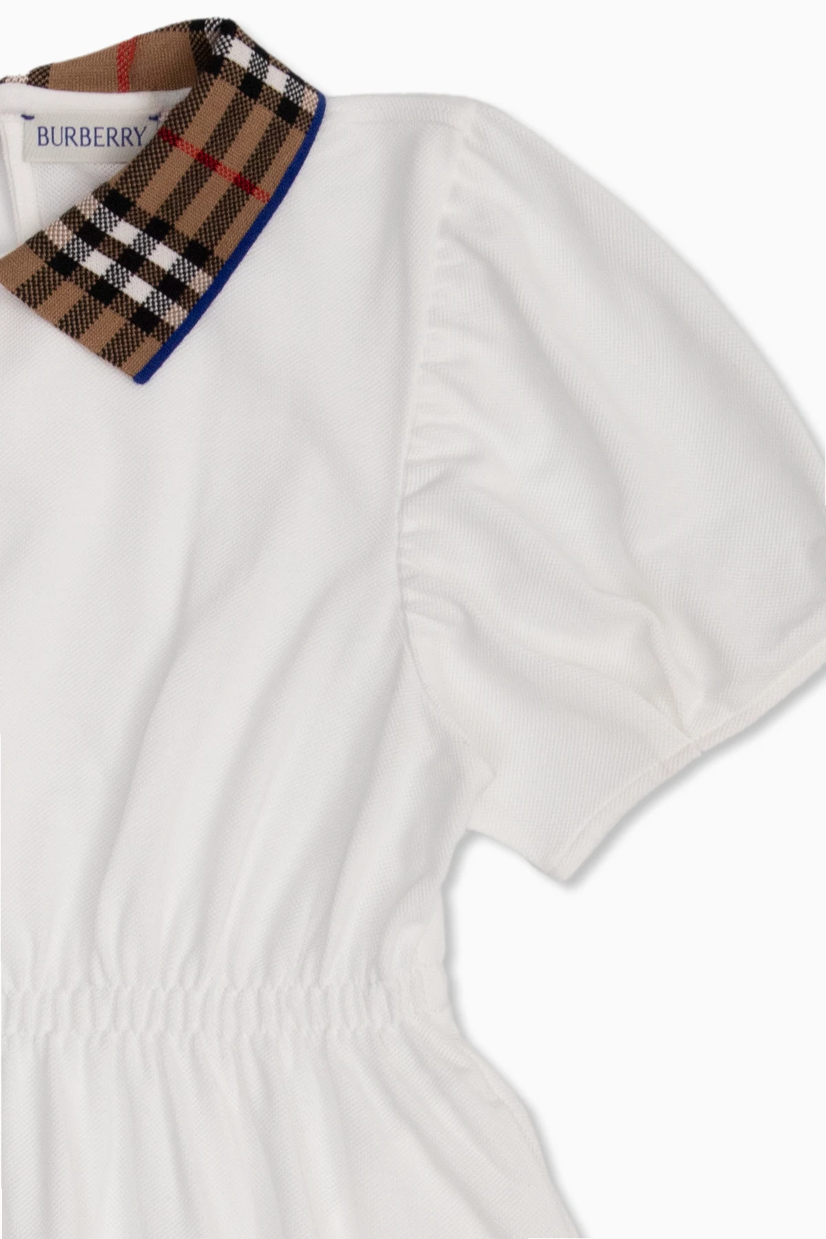 Biała, bawełniana sukienka Burberry Kids. Zapinana z tyłu na guzik. W pasie szyta guma. Dekolt z beżowym kołnierzem ozdobionym wzorem w kolorową, charakterystyczną kratą. Z przodu wyszyte logo. Krótkie rękawy. Po bokach kieszeń.