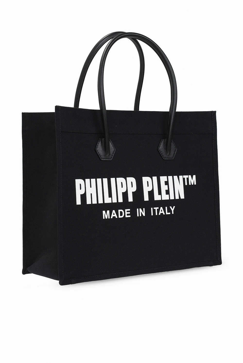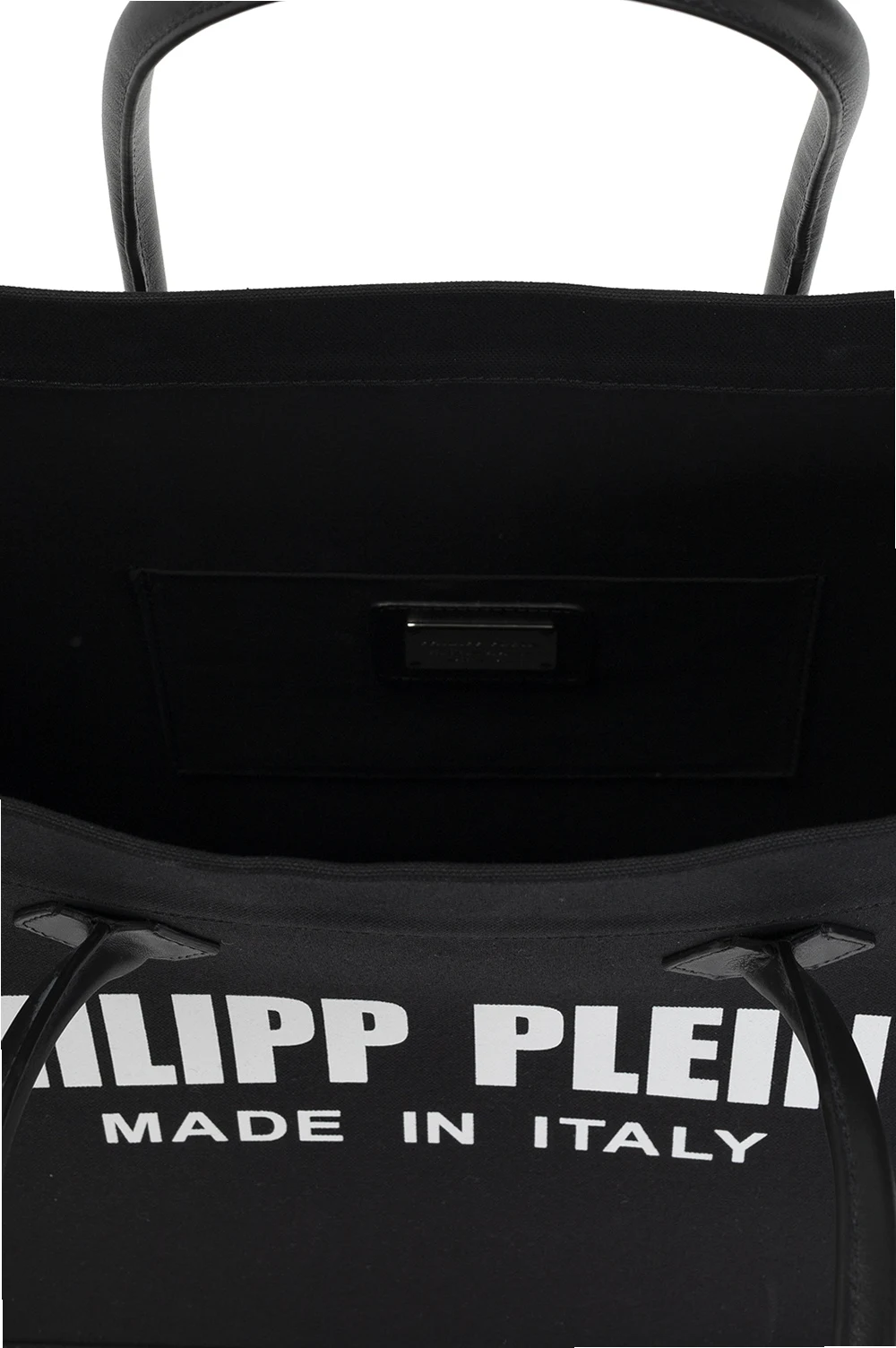 Czarna torba typu ‘shopper’ Philipp Plein. Wykonana z bawełny. Ozdobiona nadrukowanym wzorem z logo w kolorze białym. Dwie półokrągłe rączki. Wewnątrz komora oraz dwie wsuwane kieszenie. Skórzane wykończenie.