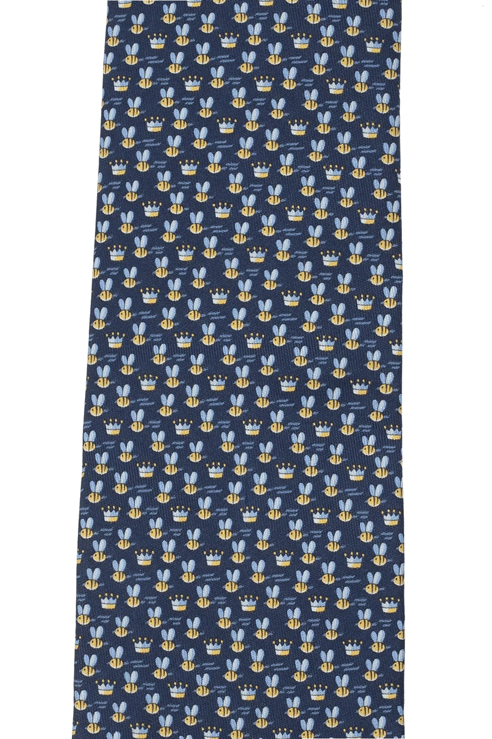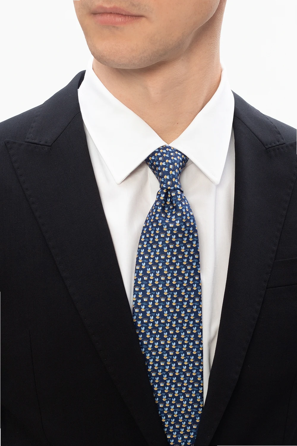 Granatowy krawat Salvatore Ferragamo. Wykonany z jedwabiu. Ozdobiony niebiesko-żółtym wzorem.