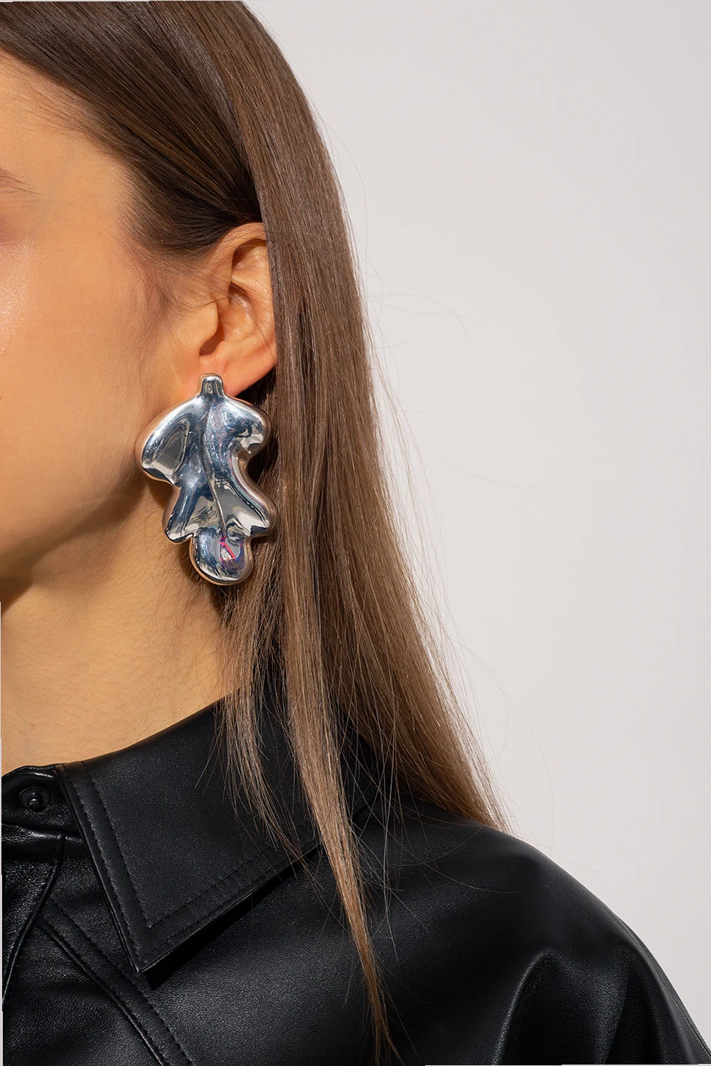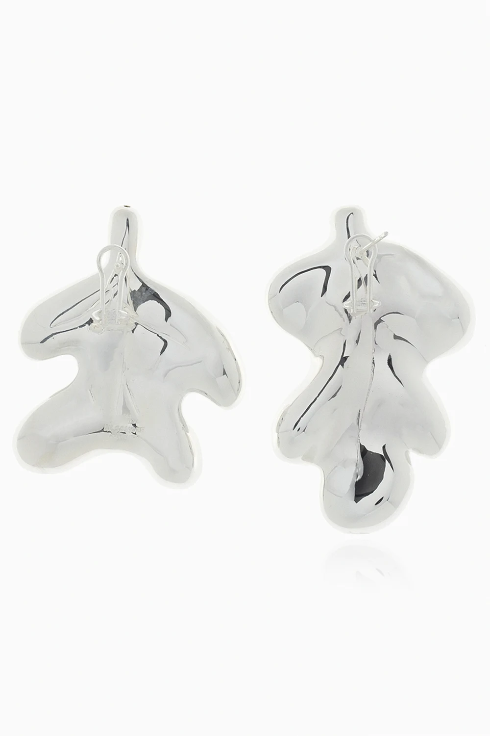 Kolczyki w kolorze srebrnym w kształcie asymetrycznych liści Jil Sander. Wykonane z miedzi.