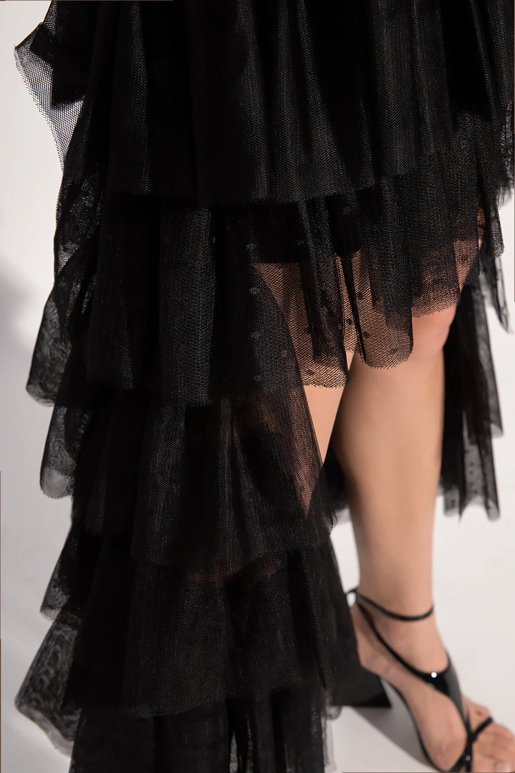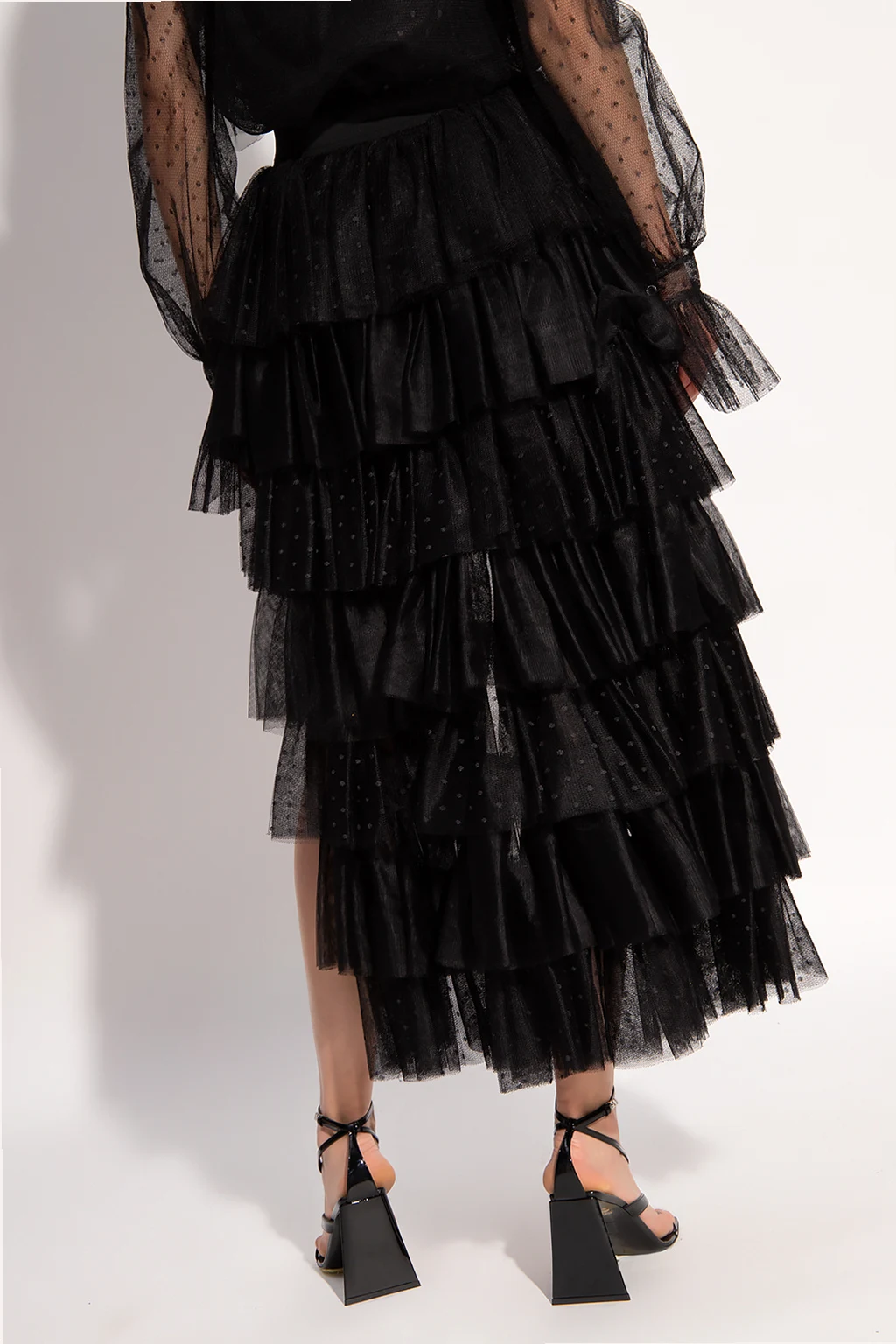 Czarna, tiulowa, asymetryczna spódnica Red Valentino. W pasie wszyta guma. Ozdobiona wzorem z motywem kropek.