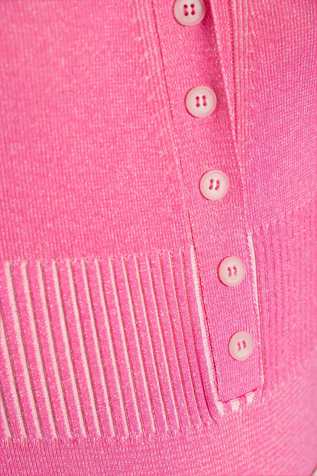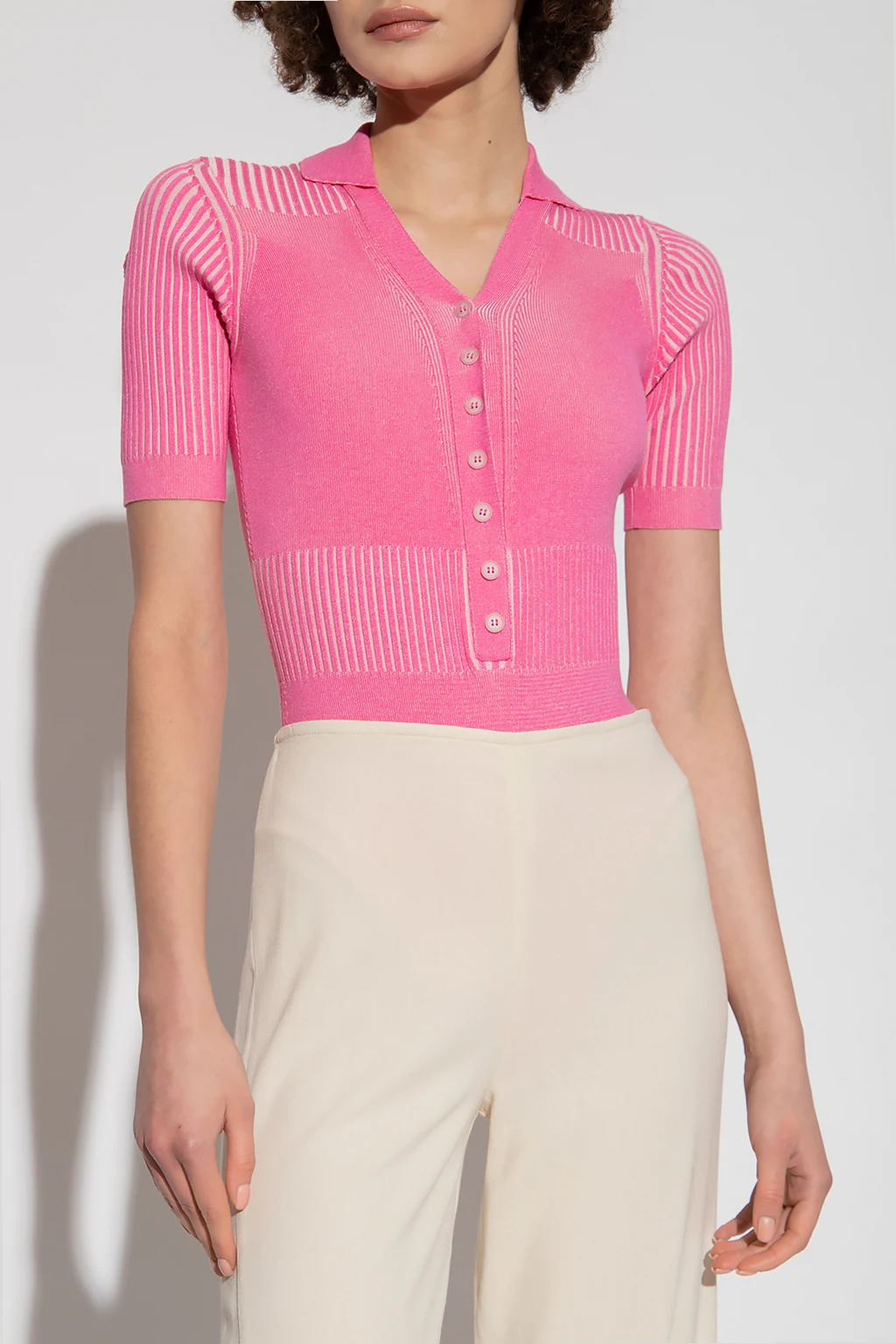 Różowe body, model ‘Yauco’ Jacquemus. Zapinane na guziki. Prążkowane wstawki. Krótkie rękawy.