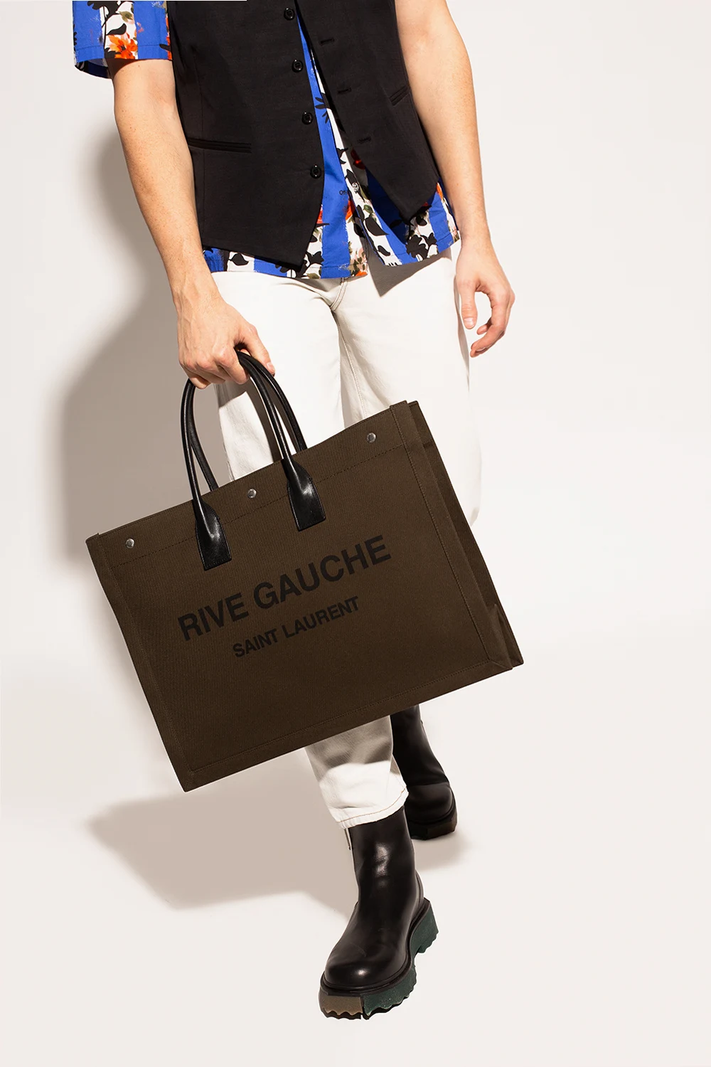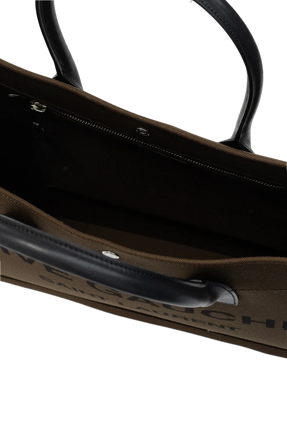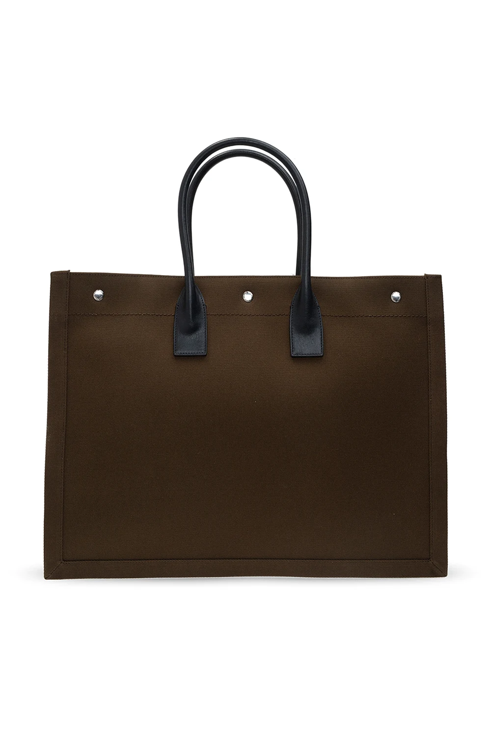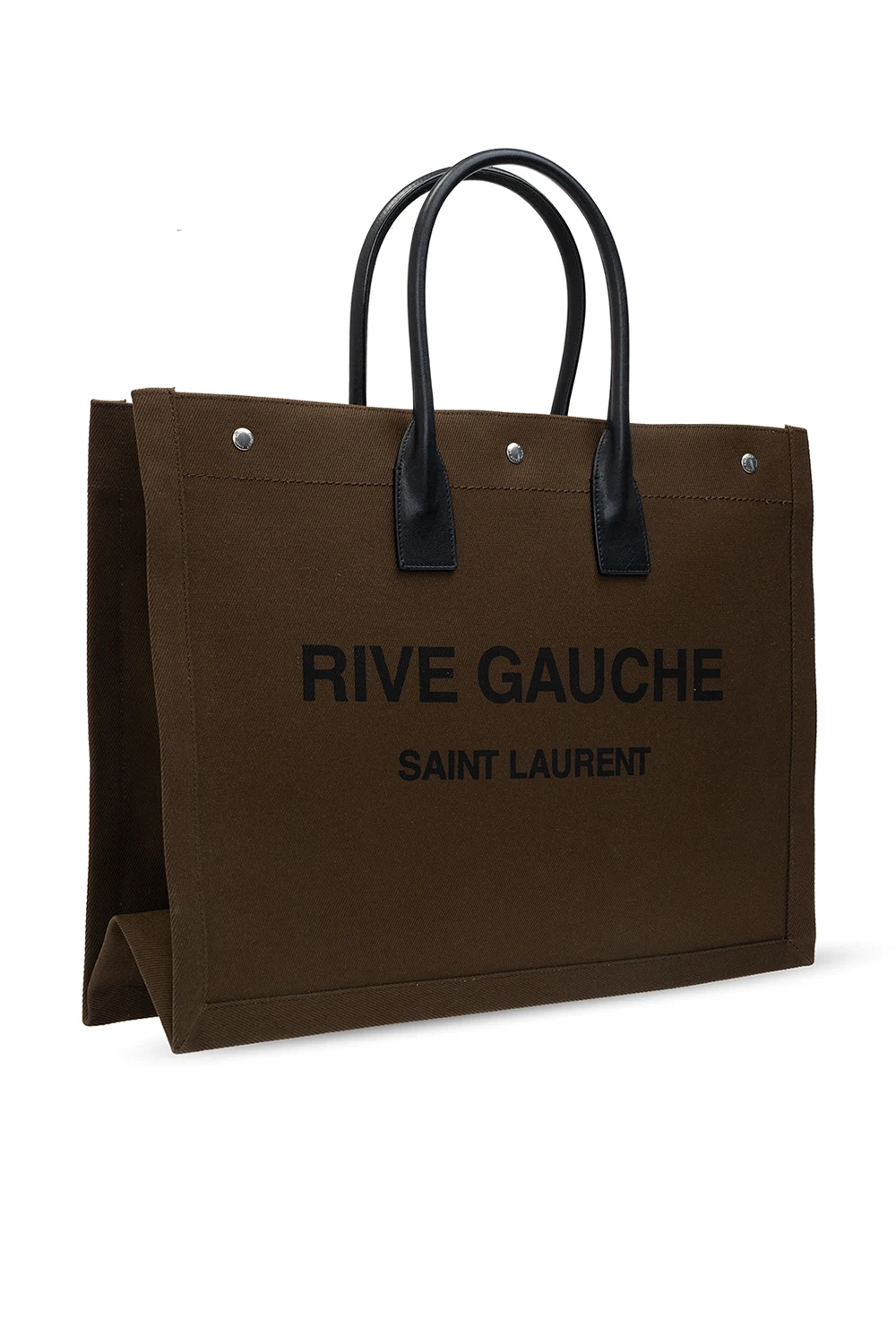 Zielono-czarna, bawełniana torba typu ‘shopper’, model ‘Noe’ Saint Laurent. Wykończona skórą cielęcą. Zamykana na zatrzaski. Ozdobiona czarnym nadrukiem z logo. Dwie półokrągłe, skórzane rączki. Wewnątrz komora i kieszeń zamykana na zamek. Metalowe wykończenie w kolorze srebrnym. Z boku wszyte zatrzaski umożliwiające zwiększenie pojemności torby.