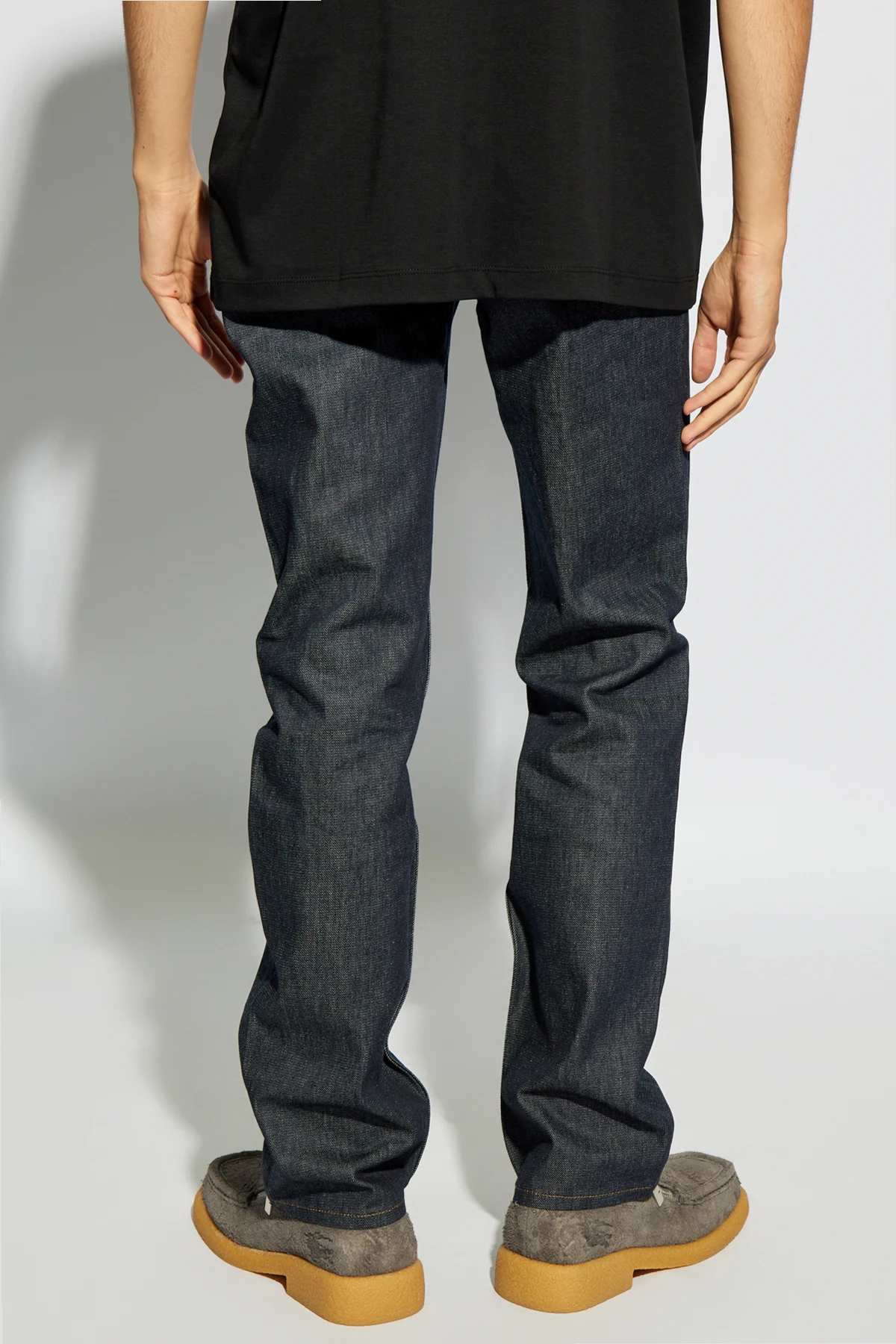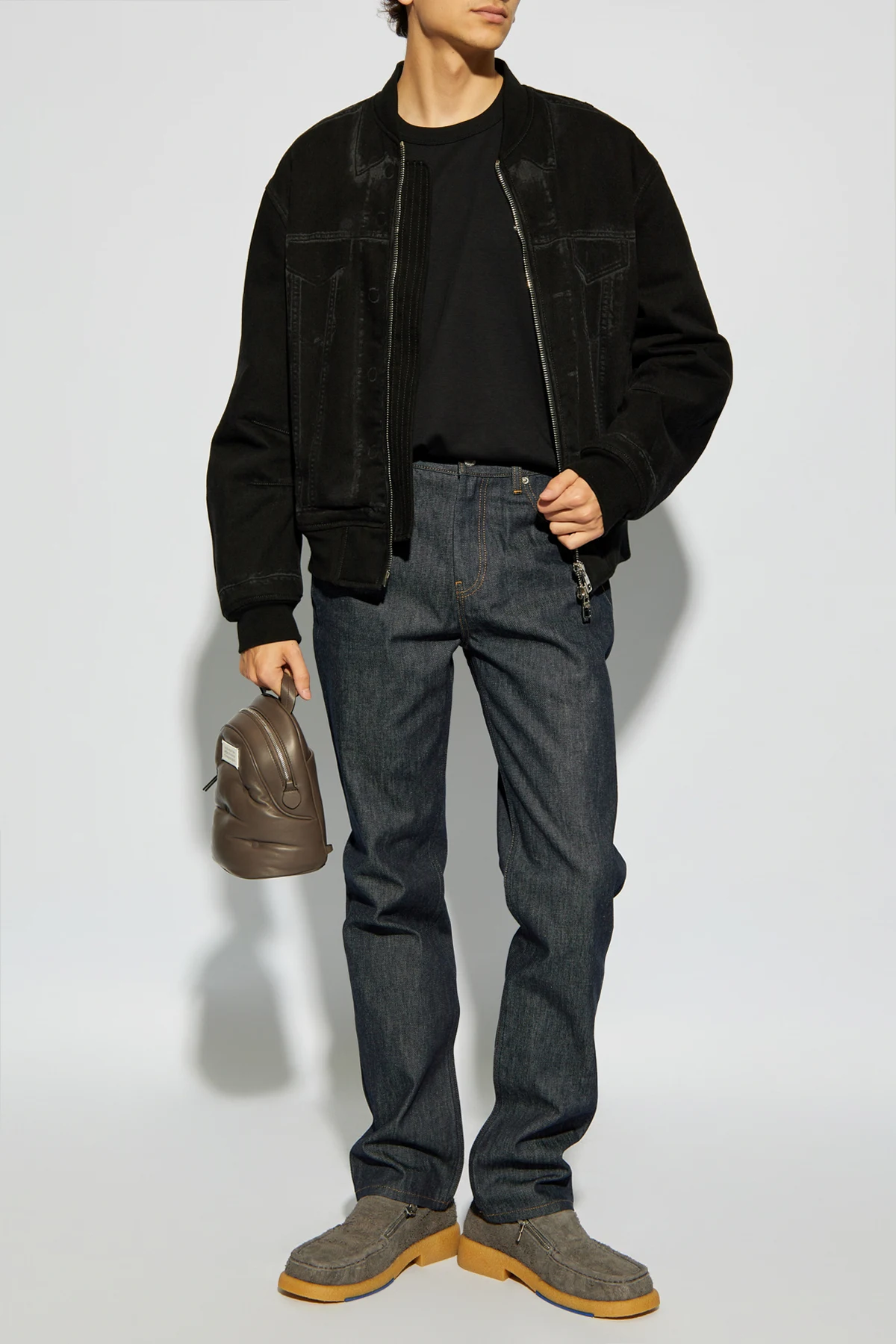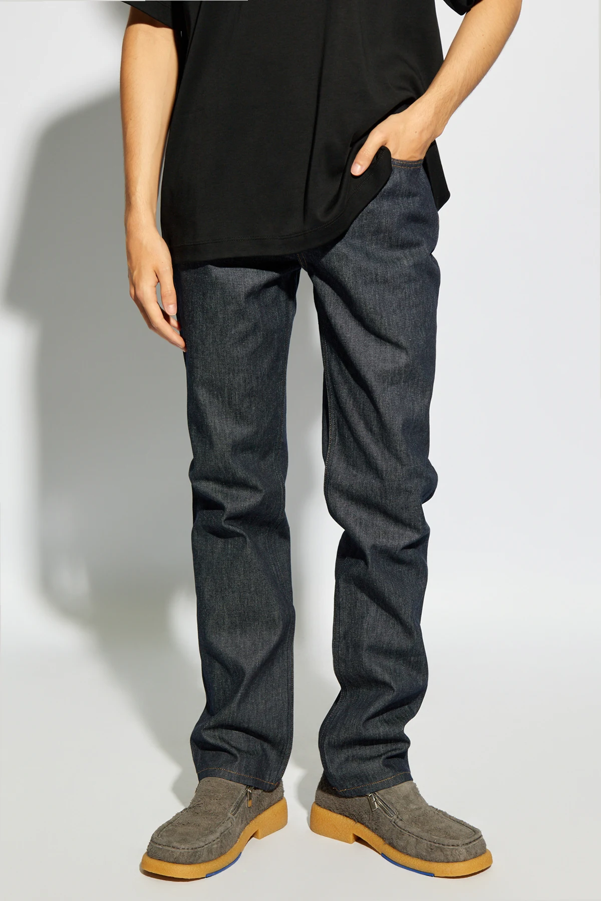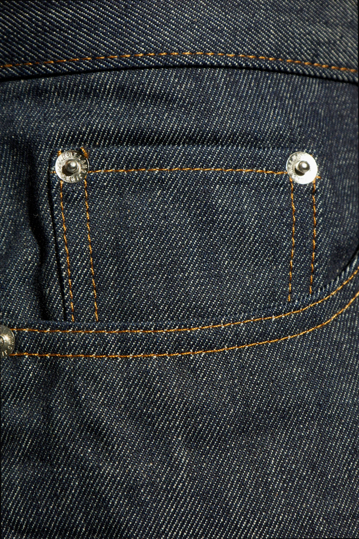 Kontrastowe, pomarańczowe przeszycia i srebrne, metalowe detale, takie jak nity i guziki, nadają tym jeansom unikalnego charakteru, podkreślając ich wysoką jakość i dbałość o szczegóły. Spodnie zapinane są na zamek i guzik, co zapewnia wygodę oraz funkcjonalność. Ich prosty krój nogawek gwarantuje swobodę ruchów, a brak nadmiernego brandingowania akcentuje minimalistyczne podejście projektanta do mody.