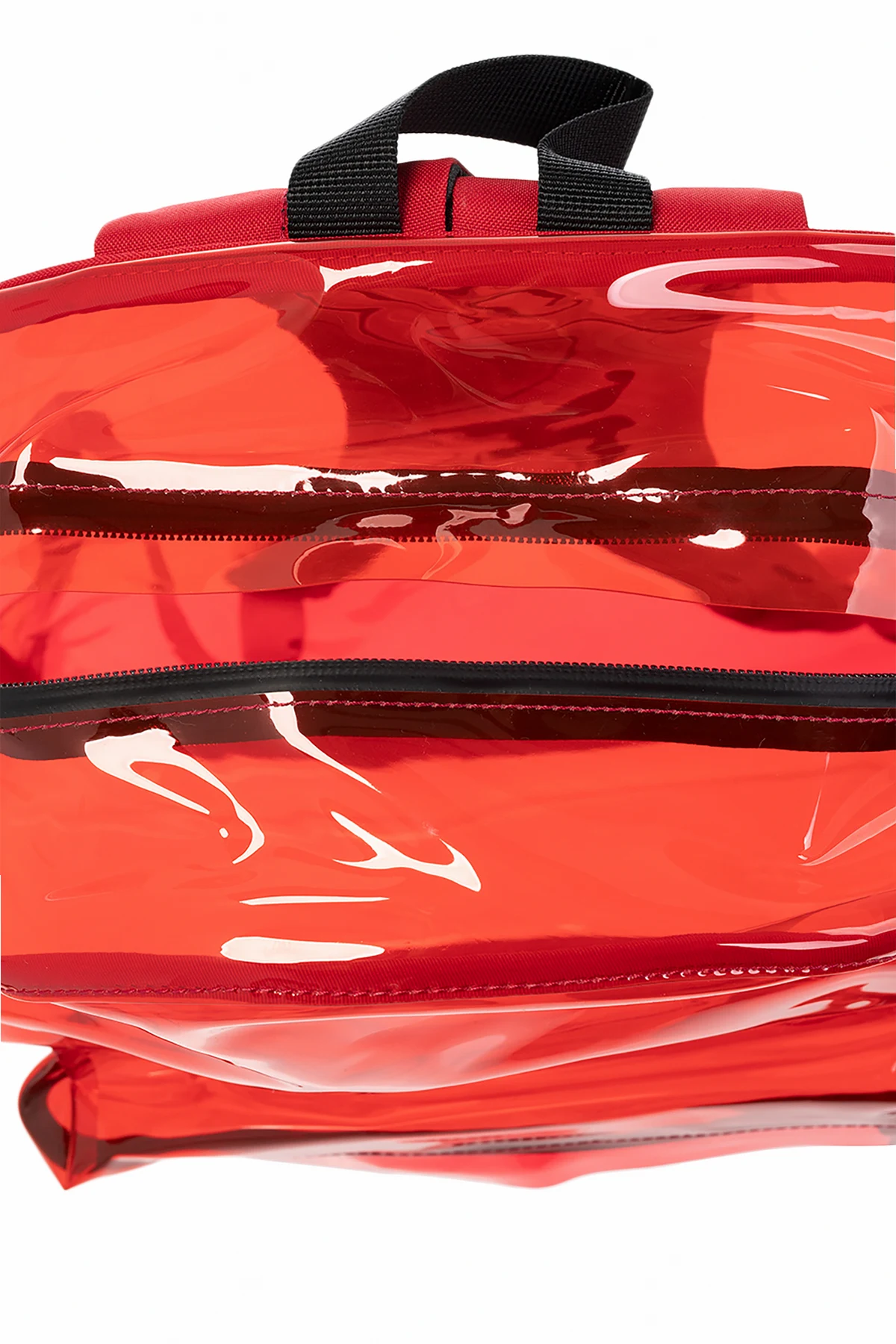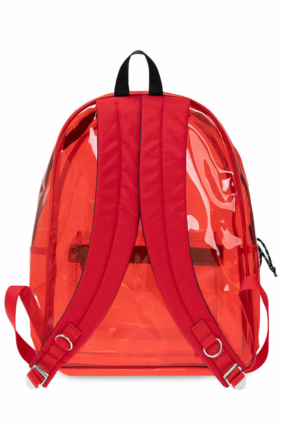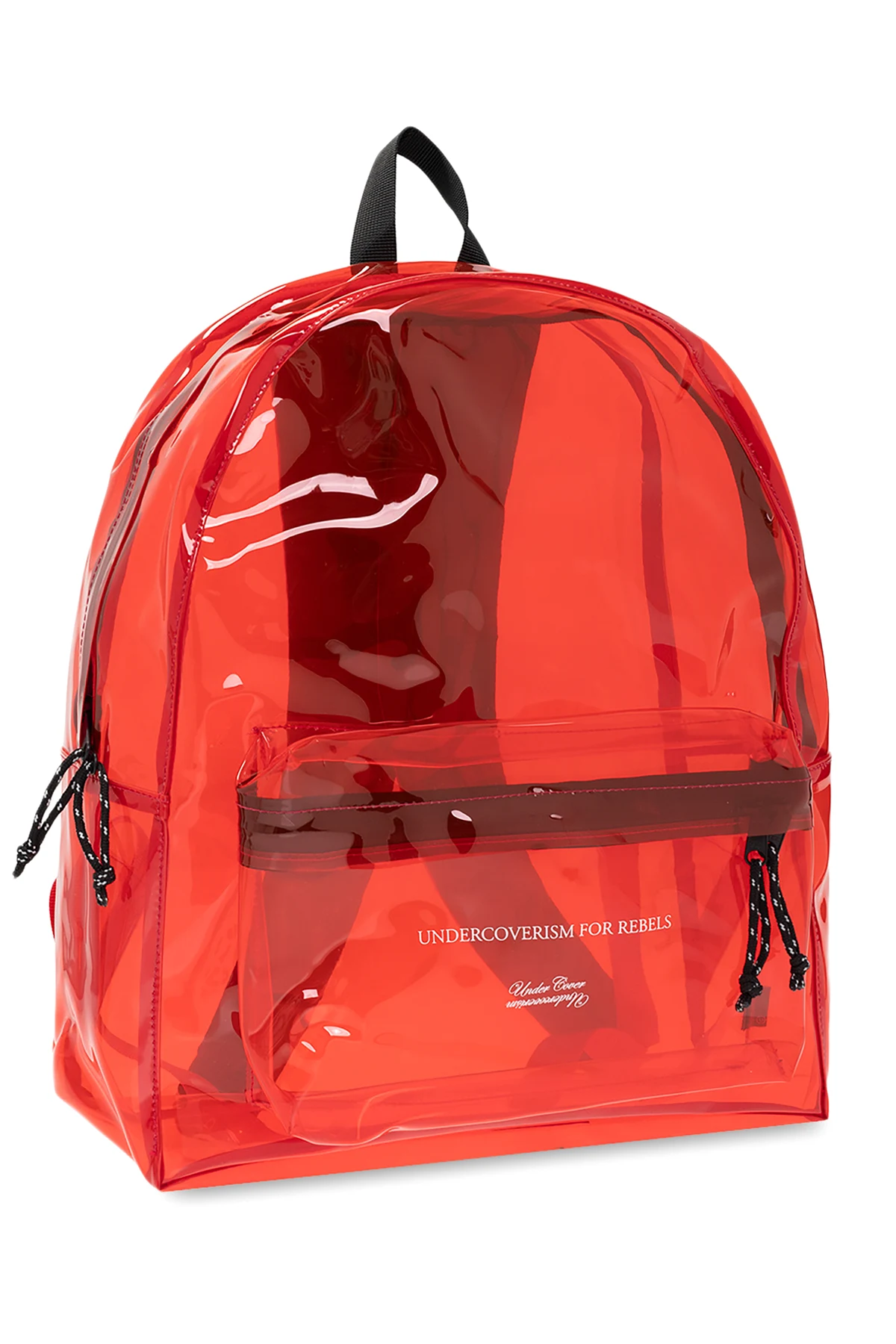 Czerwono-czarny, transparentny plecak Undercover. Zamykany na zamek. Ozdobiony nadrukiem z logo w kolorze białym. Z przodu kieszeń zamykana na zamek. Dwie szelki z regulacją długości. Wewnątrz komora.