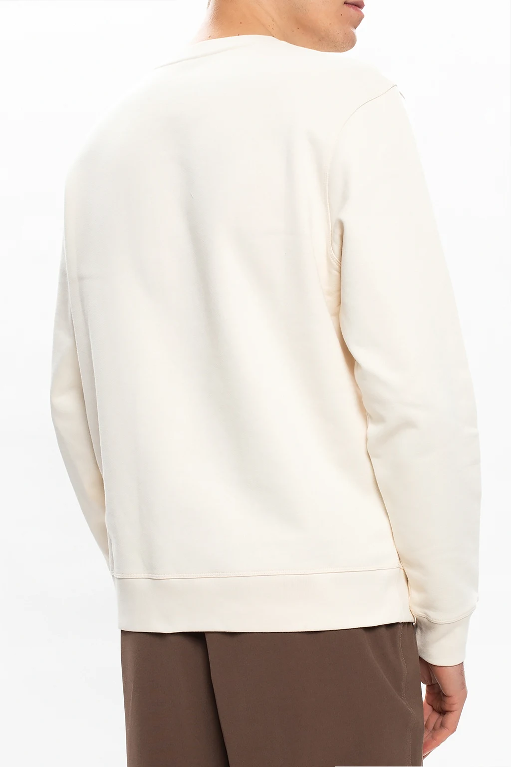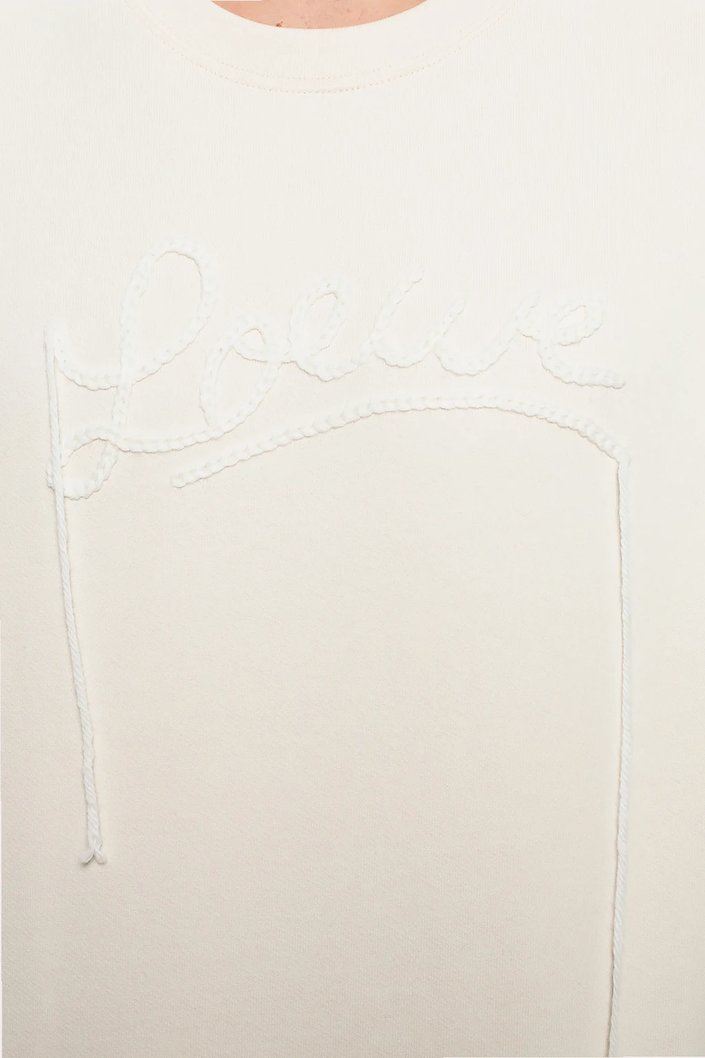 Kremowa, bawełniana bluza Loewe. Z przodu ozdobiona naszytym logo w kolorze białym. Okrągły dekolt. Dół oraz rękawy zakończone ściągaczami.