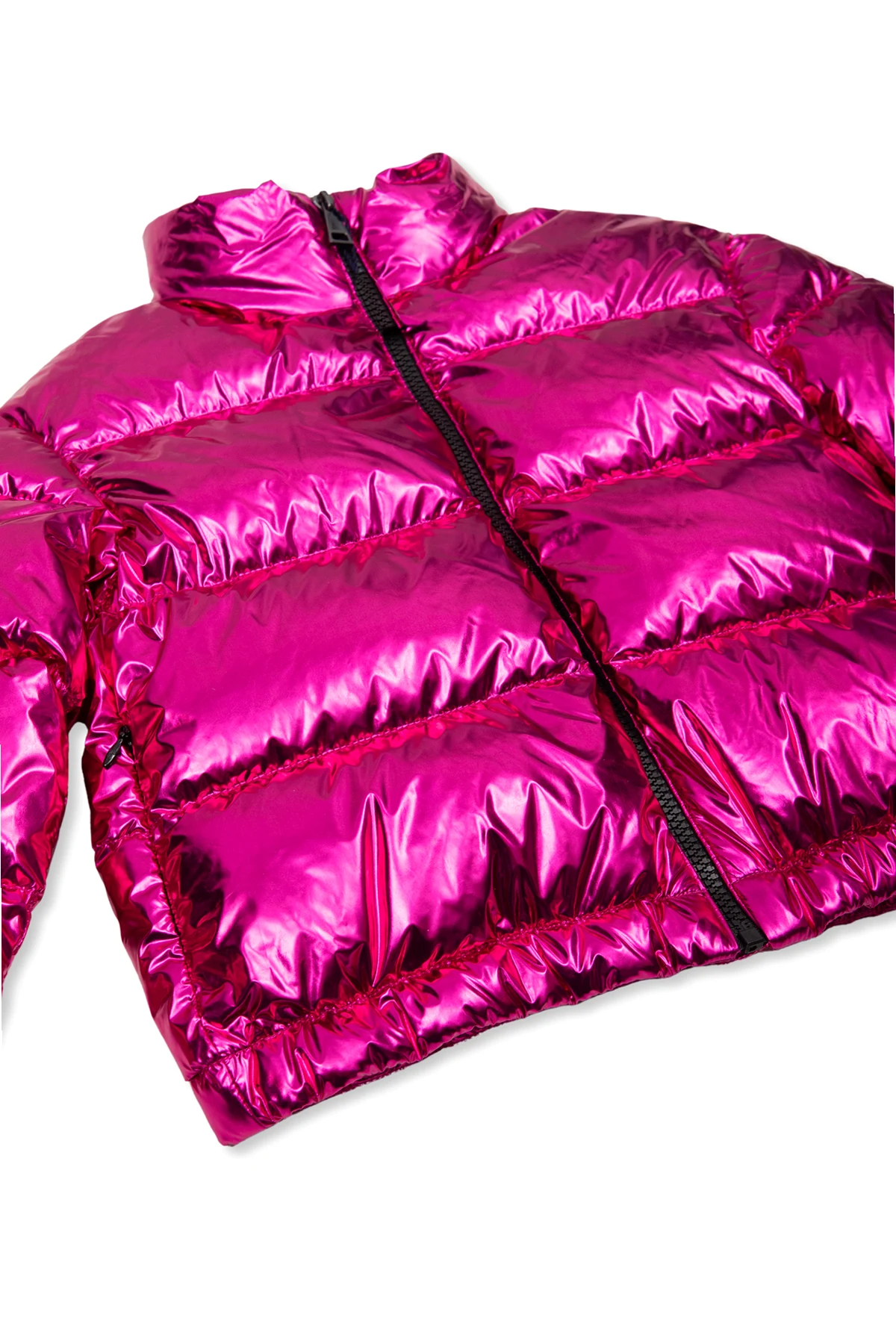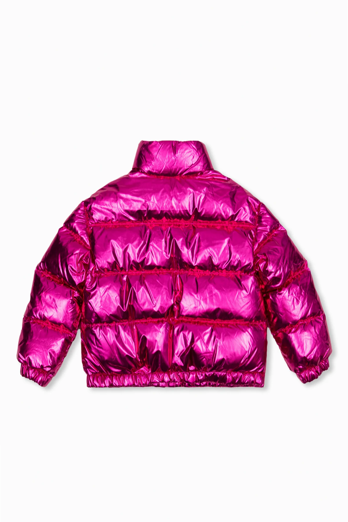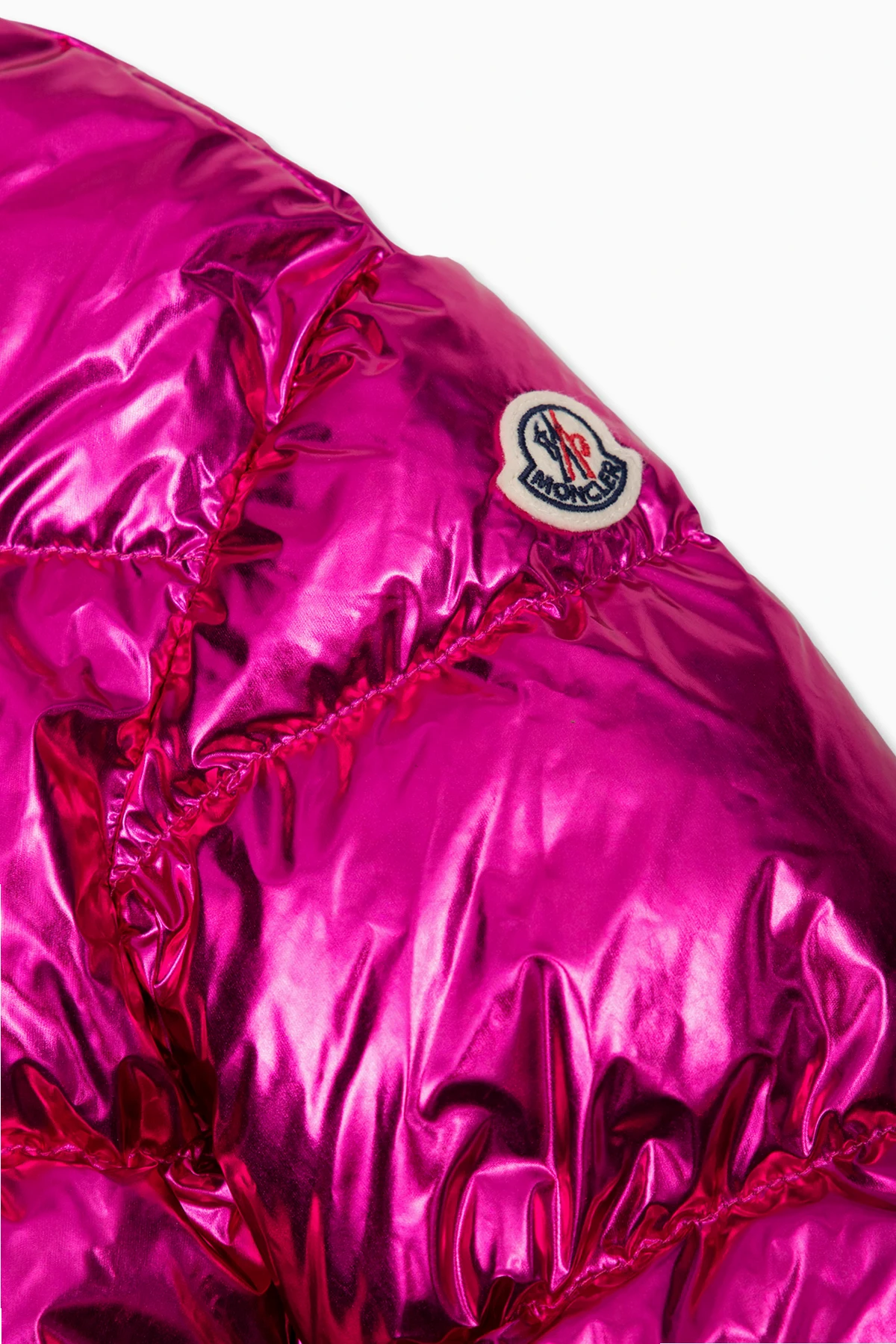 Różowa, pikowana kurtka puchowa, model ‘Miuse’ Moncler Enfant. Wykonana z połyskującego materiału. Zapinana na zamek. Na rękawie naszywka z logo. Dwie kieszenie zapinane na kryty zamek. Długie rękawy i dół zakończone ściągaczem.