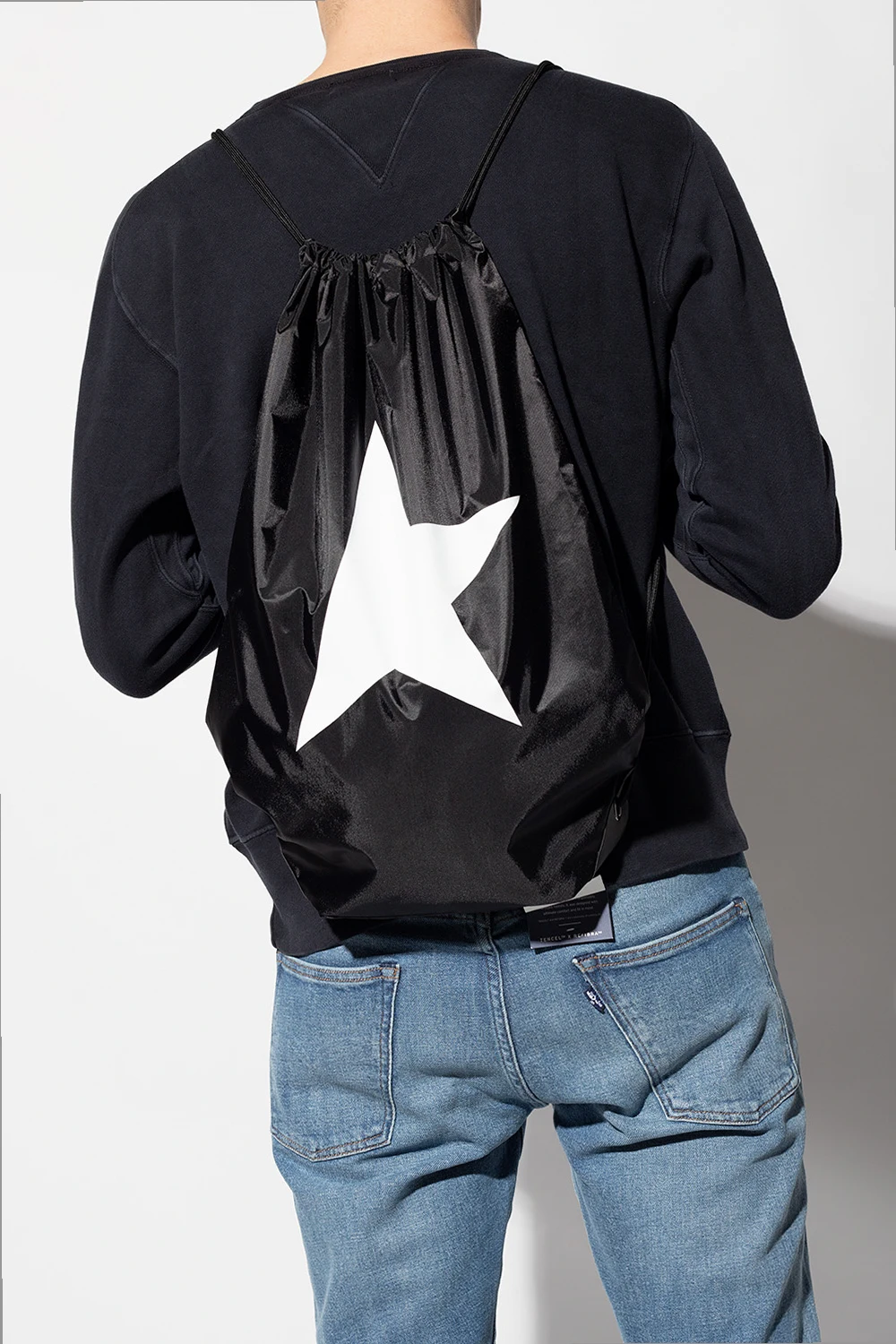 Czarny plecak typu ‘worek’ Golden Goose. Ściągany trokami. Nadrukowane logo w kolorze białym. Podwójne szelki. Wewnątrz komora.