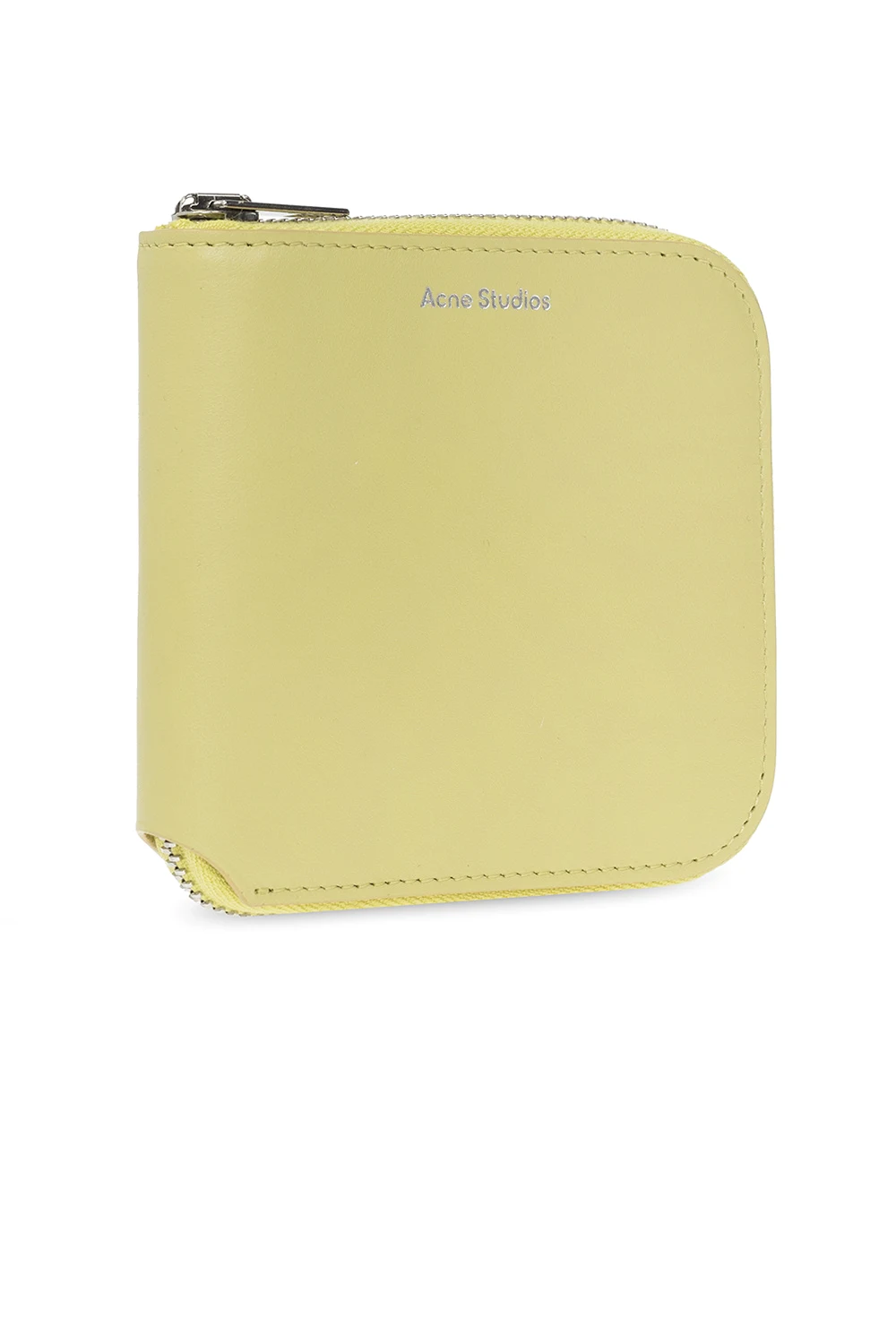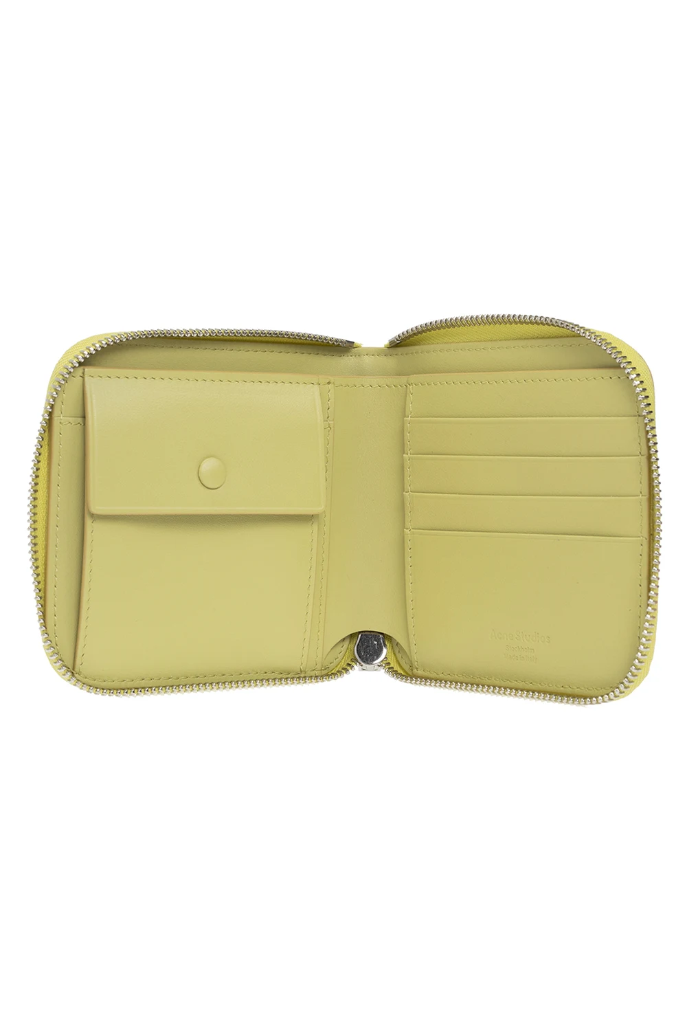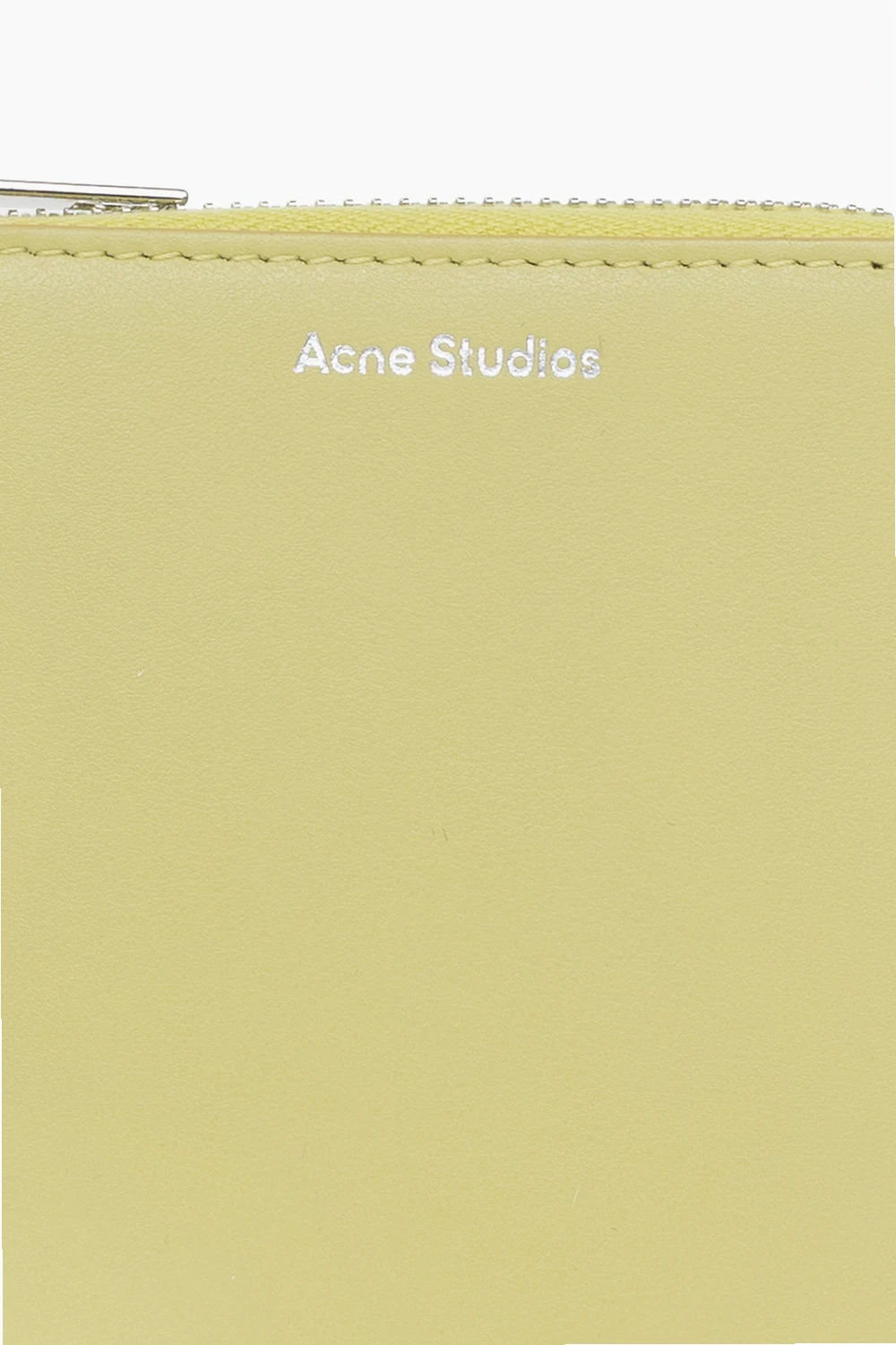 Zielony portfel Acne Studios. Wykonany ze skóry. Zamykany na zamek. Ozdobiony wytłoczonym logo. Wewnątrz cztery miejsca na karty, kieszeń wsuwana na banknoty oraz zapinana na monety. Metalowe wykończenie w kolorze srebrnym.