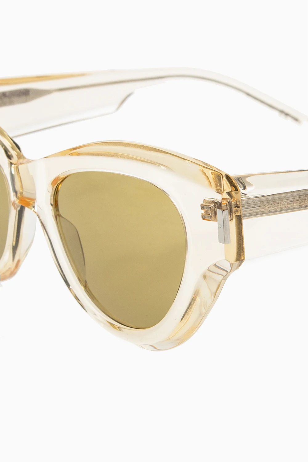 Żółte, transparentne okulary przeciwsłoneczne, model ‘SL 560’ Saint Laurent. Zielone soczewki z filtrem 100% UVA/UVB. Dołączone etui.