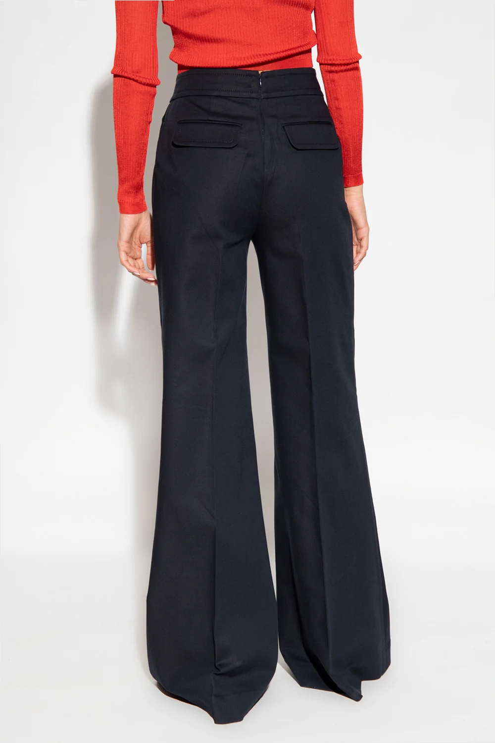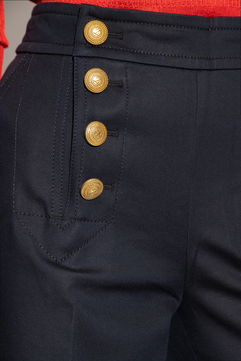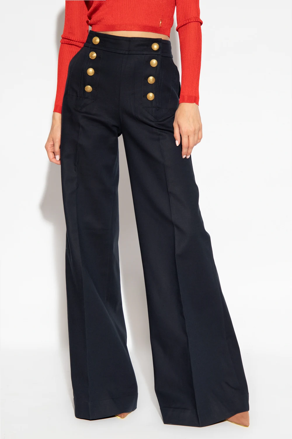Granatowe spodnie Zimmermann. Wysoki stan. Zapinane z tyłu na zamek. Z przodu dwie kieszenie i dekoracyjne guziki w kolorze złotym. Z tyłu dwie dekoracyjne patki. Rozszerzane nogawki w kant.