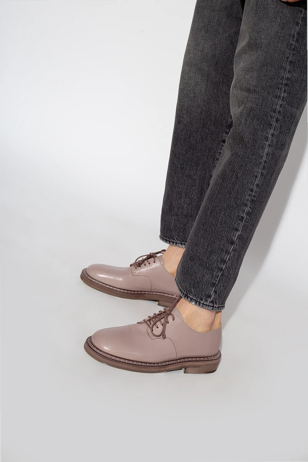 Jasnoróżowe, sznurowane buty typu ‘derby’ Marsll. Wykonane ze skóry. Brązowa, skórzana podeszwa.