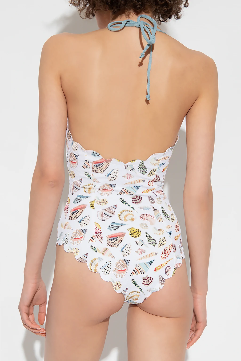 Dwustronny, jednoczęściowy kostium kąpielowy, model ‘Broadway’ Marysia. Wykonany z elastycznej teksturowanej tkaniny. Wiązany na szyi. Charakterystyczne, ręcznie wycinane brzegi. Z przodu dekoracyjne wiązanie. Z jednej strony beżowy. Z drugiej strony biały, ozdobiony kolorowym wzorem.
