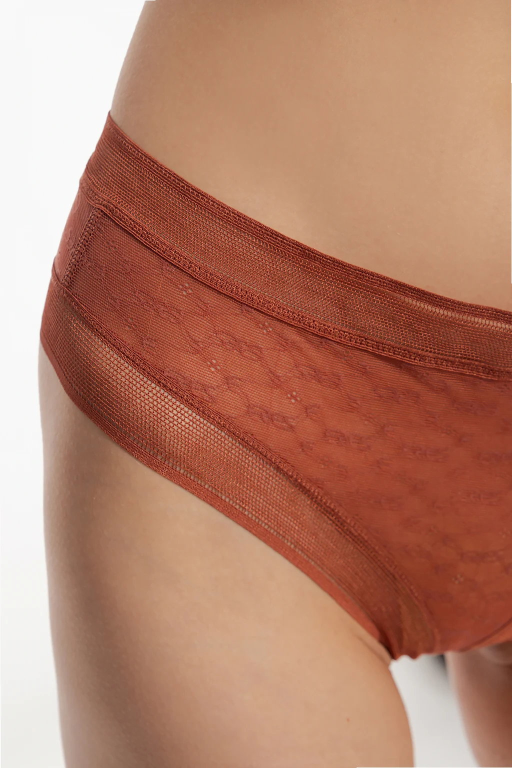 Ciemnobrązowe figi, model ‘Allure’ Eres. Wykonane z żakardowej koronki z monogramem. Przeźroczyste wykończenie.