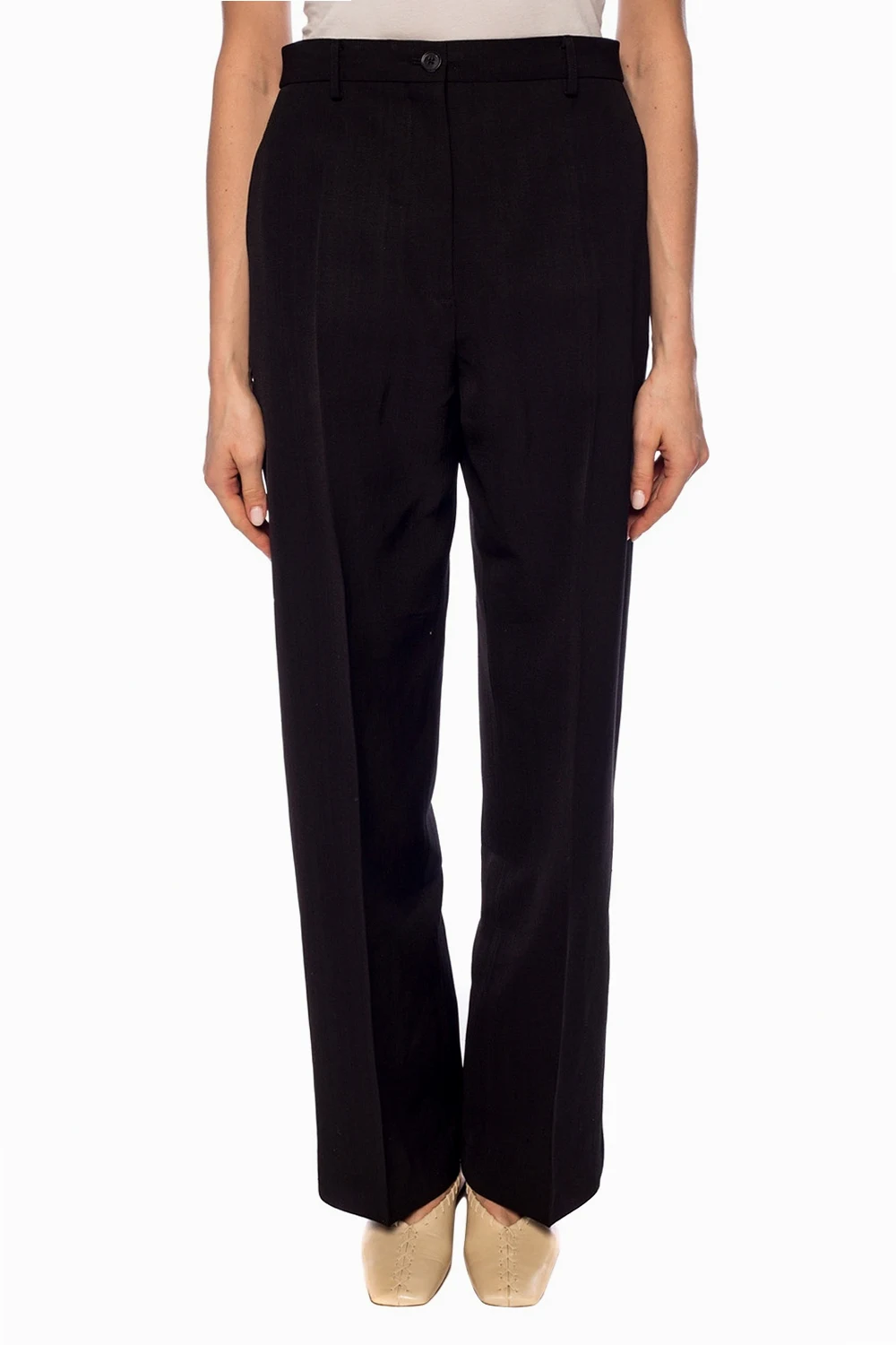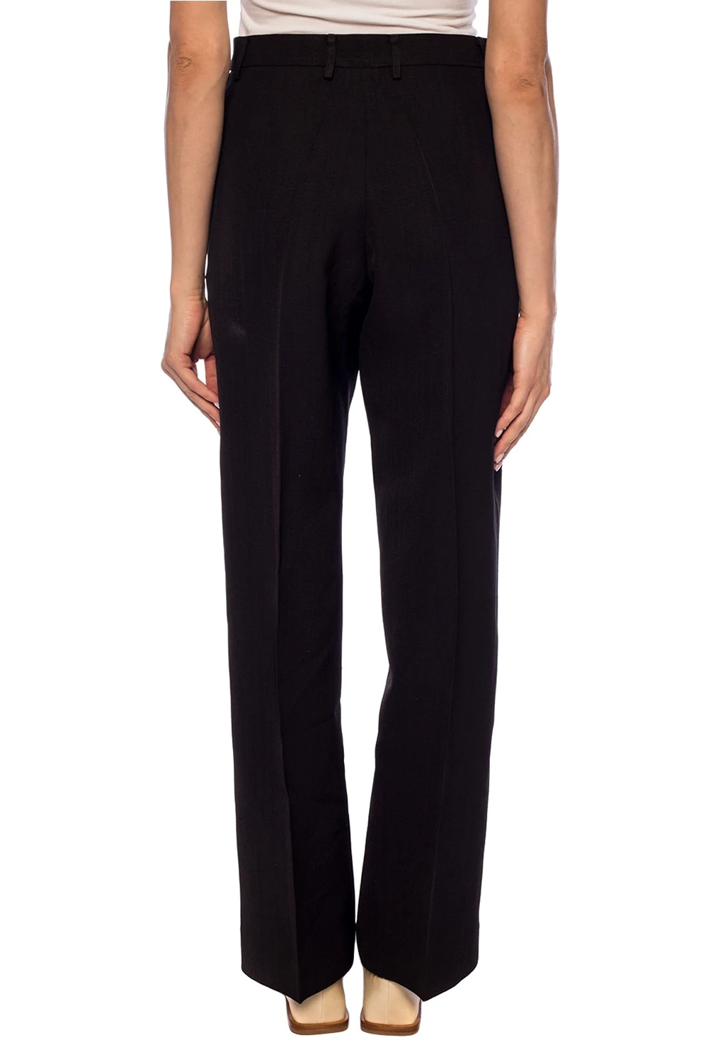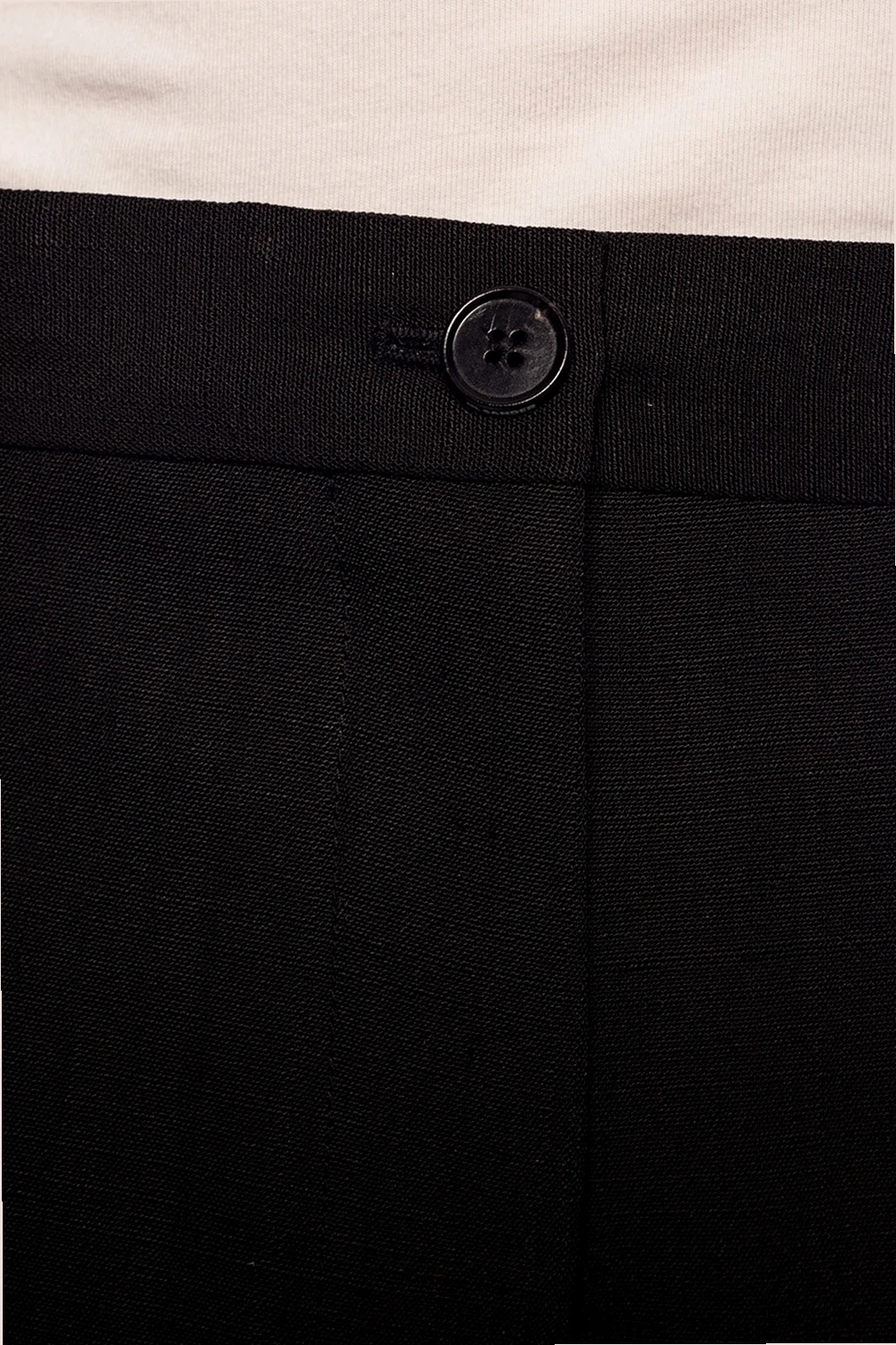 Czarne spodnie w kant Jil Sander. Zapinane na zamek oraz guzik. Z przodu dwie wsuwane kieszenie. Szerokie, proste nogawki.