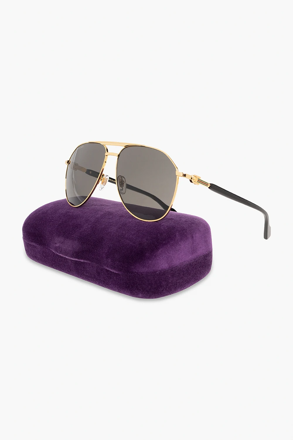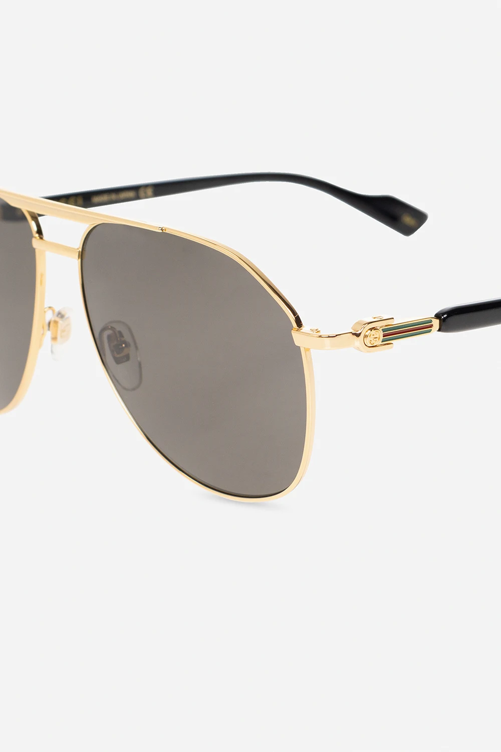 Okulary przeciwsłoneczne w kolorze czarno-złotym Gucci. Oprawki typu ‘aviator’. Zauszniki ozdobione emaliowanym paskiem ‘Web’ w kolorze zielono-czerwono-zielonym oraz logo. Szare, certyfikowane soczewki ze 100% ochroną przed promieniowaniem UVA/UVB. Dołączone etui w losowo wybranym kolorze.