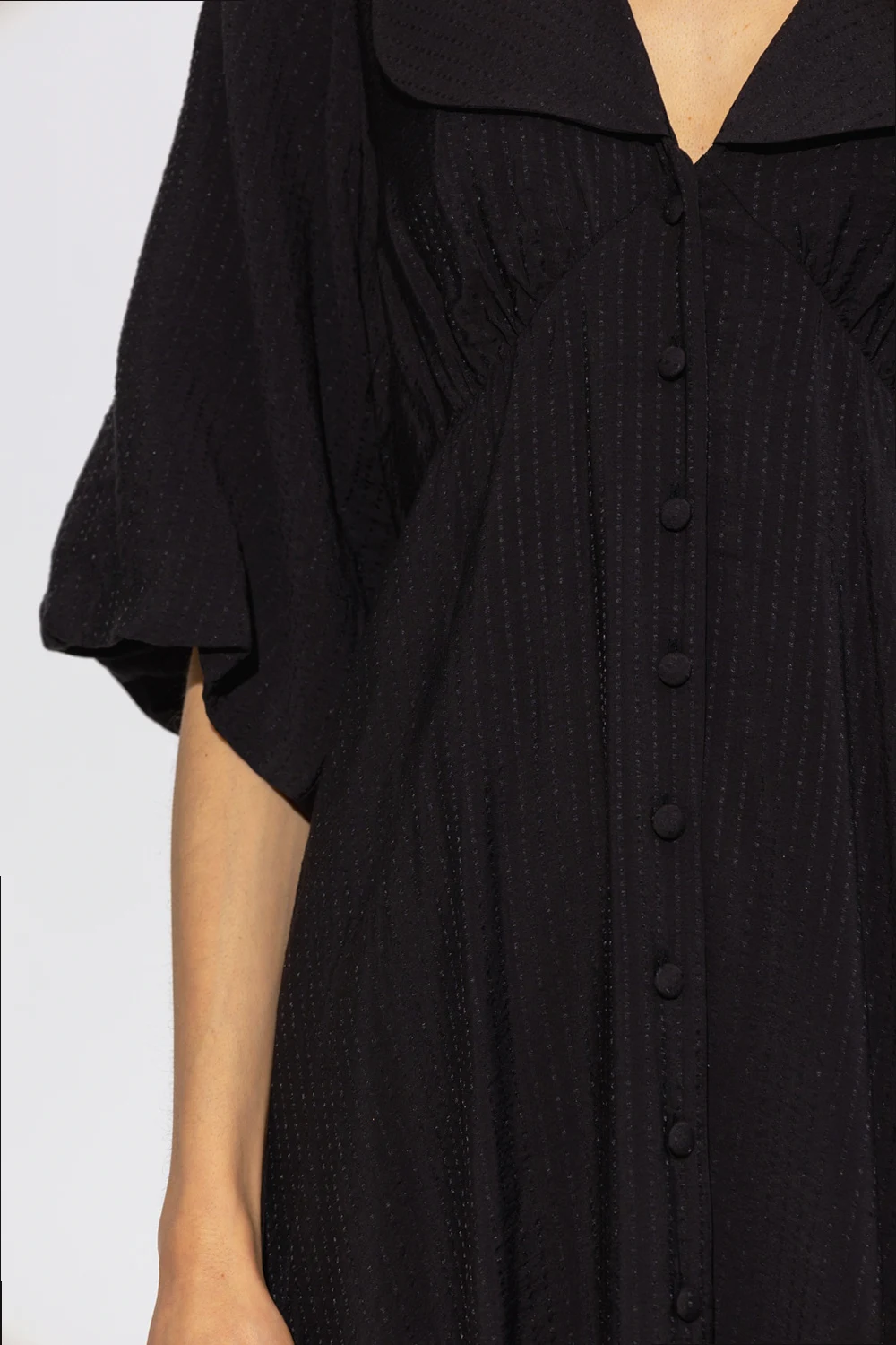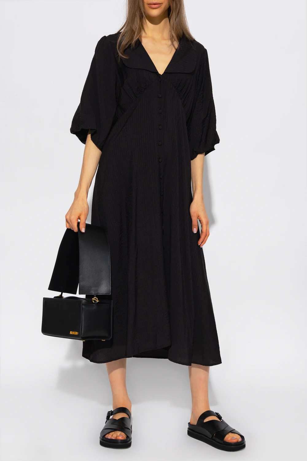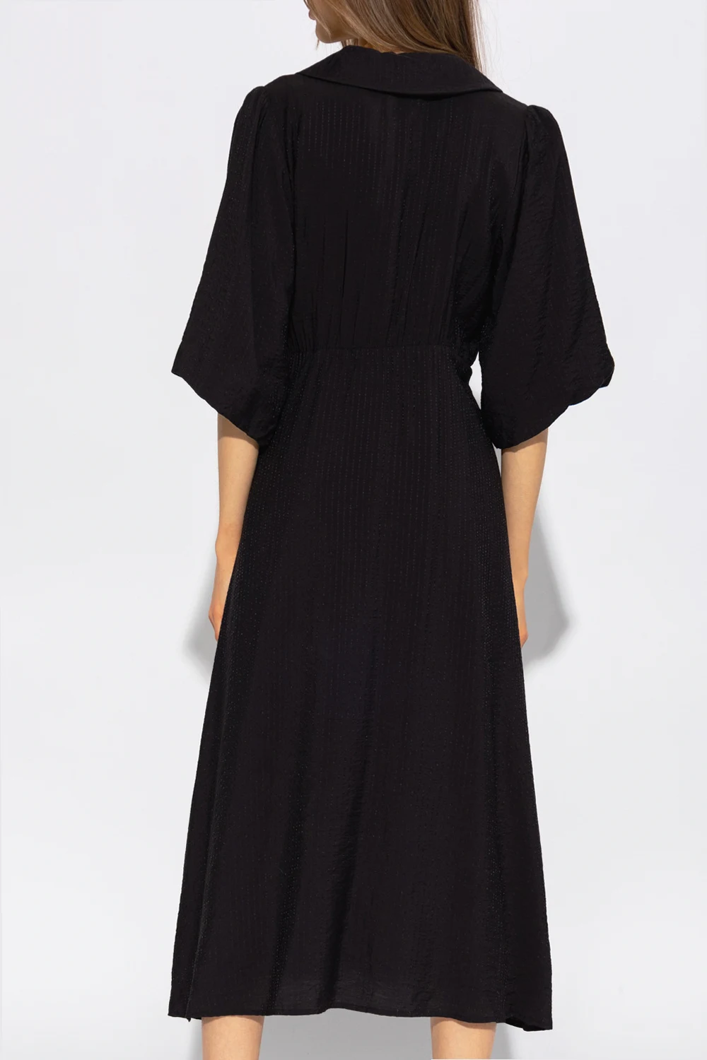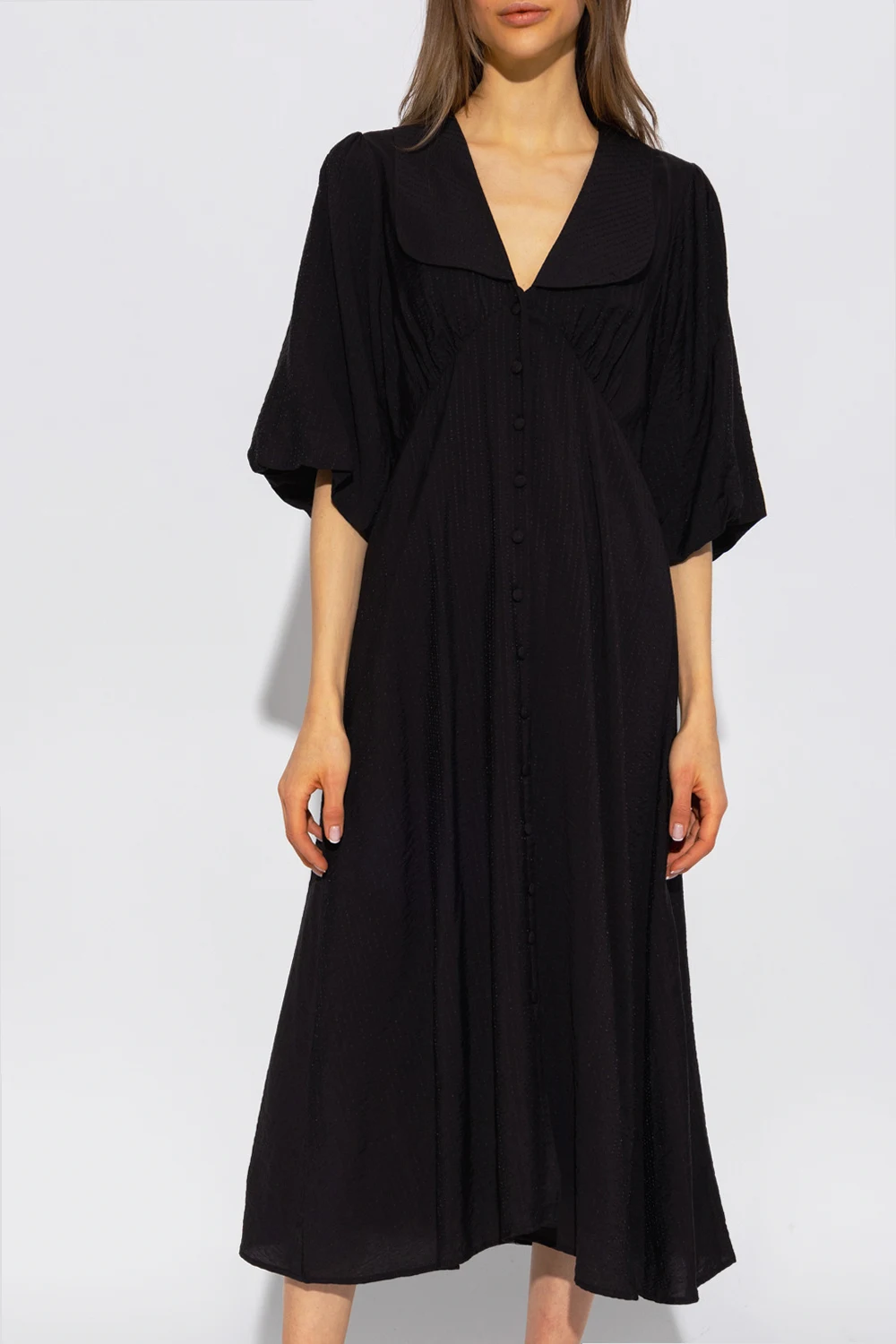 Czarna sukienka, model ‘AnnaliaGZ’ Gestuz. Wykonana z materiału o specjalnej fakturze. Zapinana z przodu na guziki. Krój z okrągłym kołnierzem, odcinany pod biustem, z przodu dekoracyjnie marszczony. Luźne rękawy o długości trzy czwarte, rozszerzany dół o długości midi.