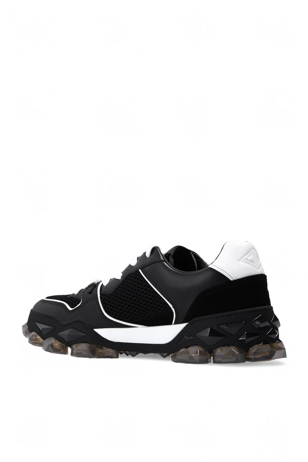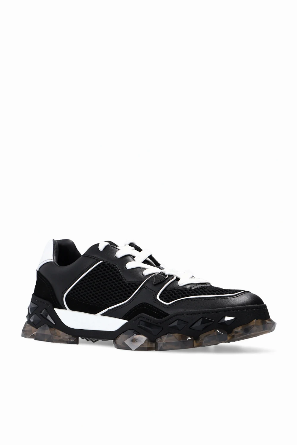 Czarne, sznurowane buty sportowe, model ‘Diamond x Trainer’ Jimmy Choo. Wykonane ze skóry. Wykończone siatką. Z tyłu wytłoczone logo. Ozdobne aplikacje. Czarno-szaro-biała, transparentna, gumowa podeszwa.