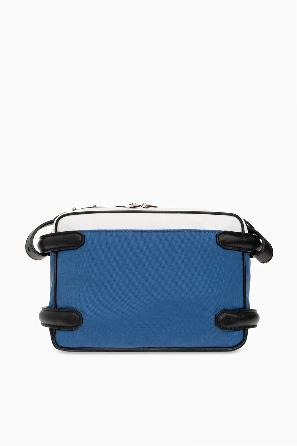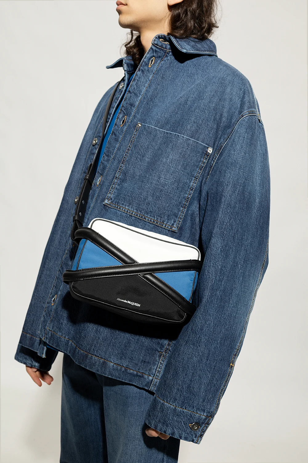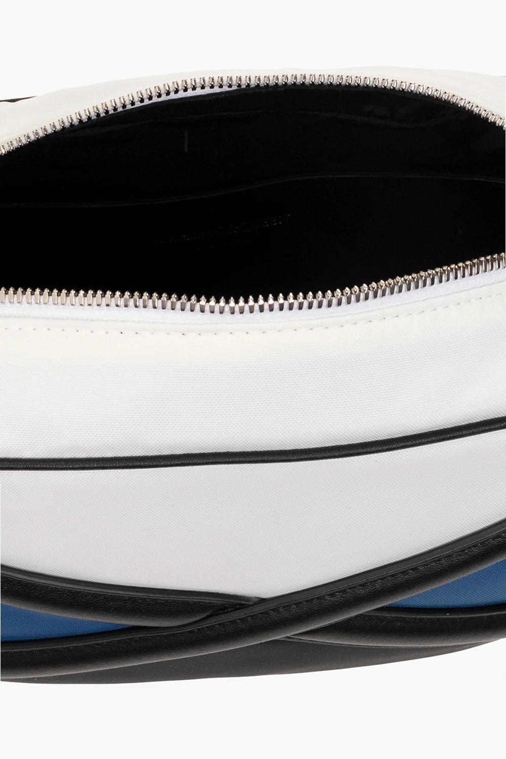 Czarno-niebiesko-biała torba na ramię, model ‘The Harness’ Alexander McQueen. Wykonana z materiału i wykończona jagnięcą skórą. Zamykana na dwubiegunowy zamek. Z przodu dekoracyjne, krzyżujące się paski. Ozdobiona nadrukowanym logo w kolorze srebrnym. Z tyłu wsuwana kieszeń. Odpinany pas na ramię z możliwością regulacji długości. Wewnątrz komora z wsuwaną kieszenią. Metalowe wykończenie w kolorze srebrnym.