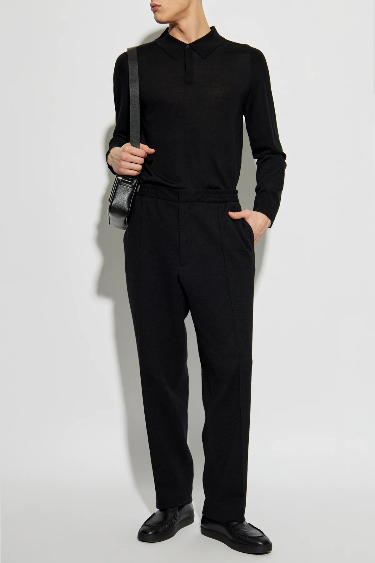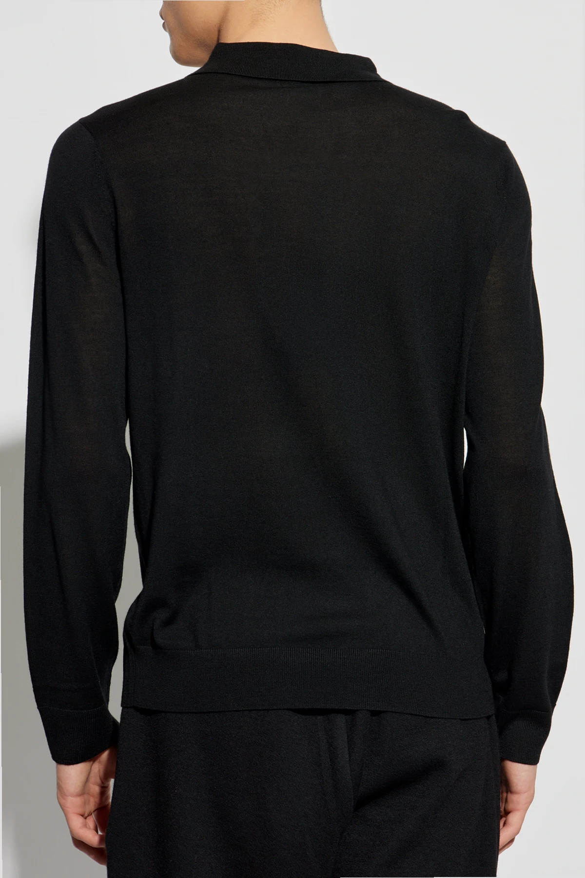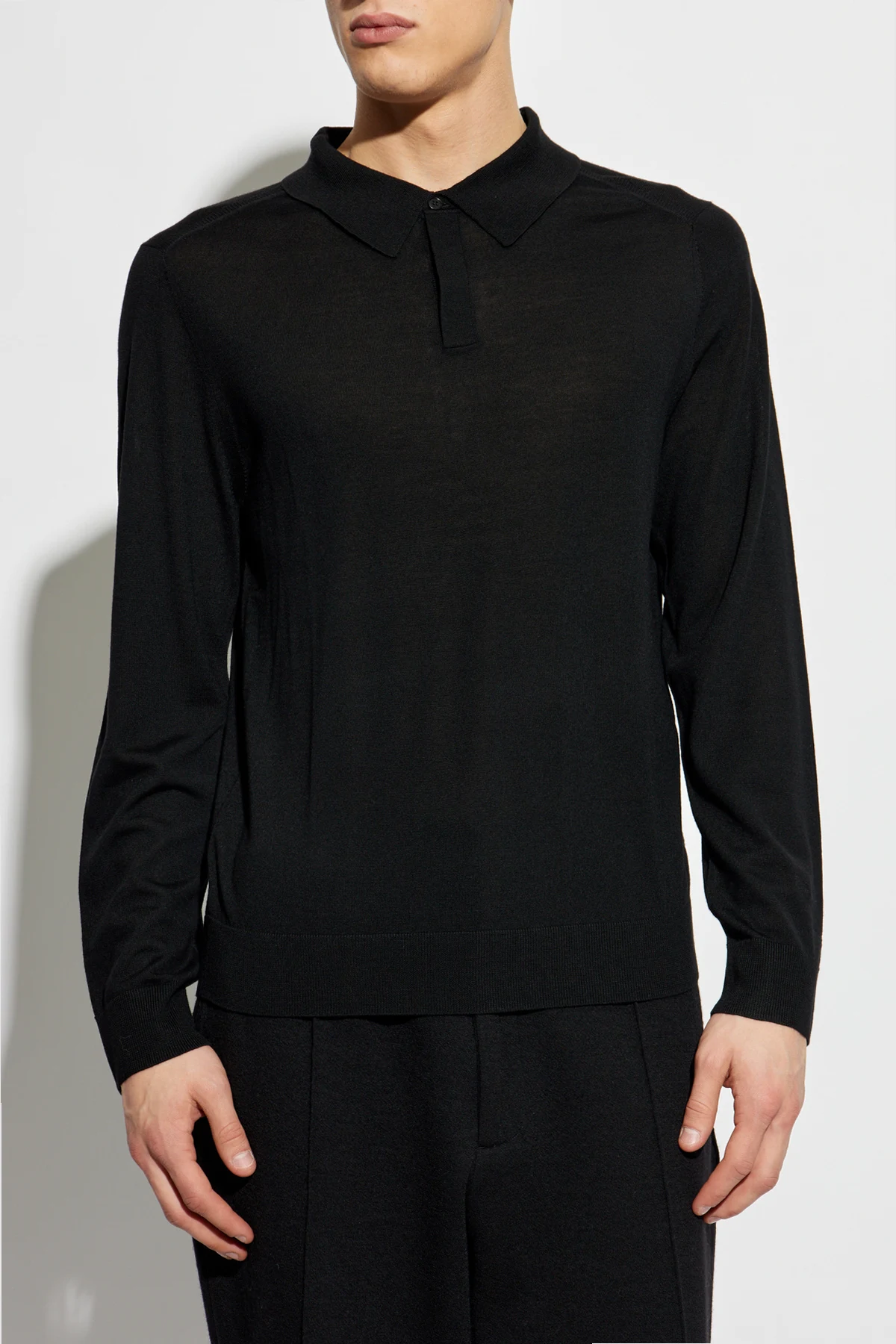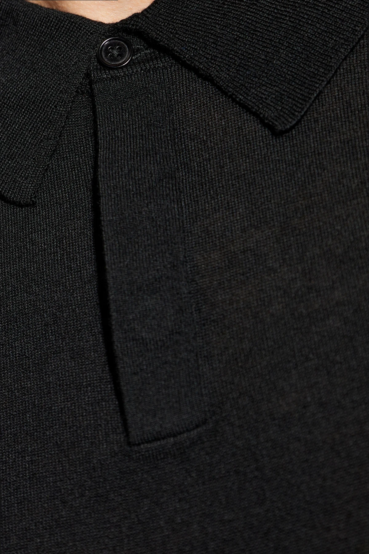 Wykonany z najwyższej jakości wełny , sweter zapewnia nie tylko przyjemne ciepło, ale również niepowtarzalny komfort noszenia. Głęboki czarny kolor oraz charakterystyczny kołnierzyk polo z jednym guzikiem przy dekolcie dodają mu klasy i subtelnej elegancji.