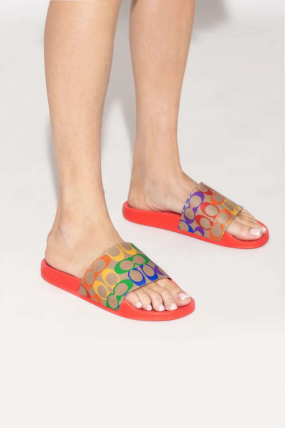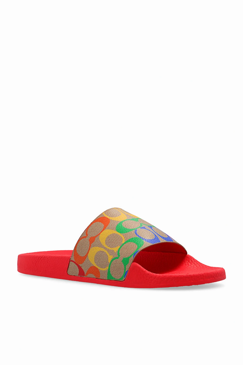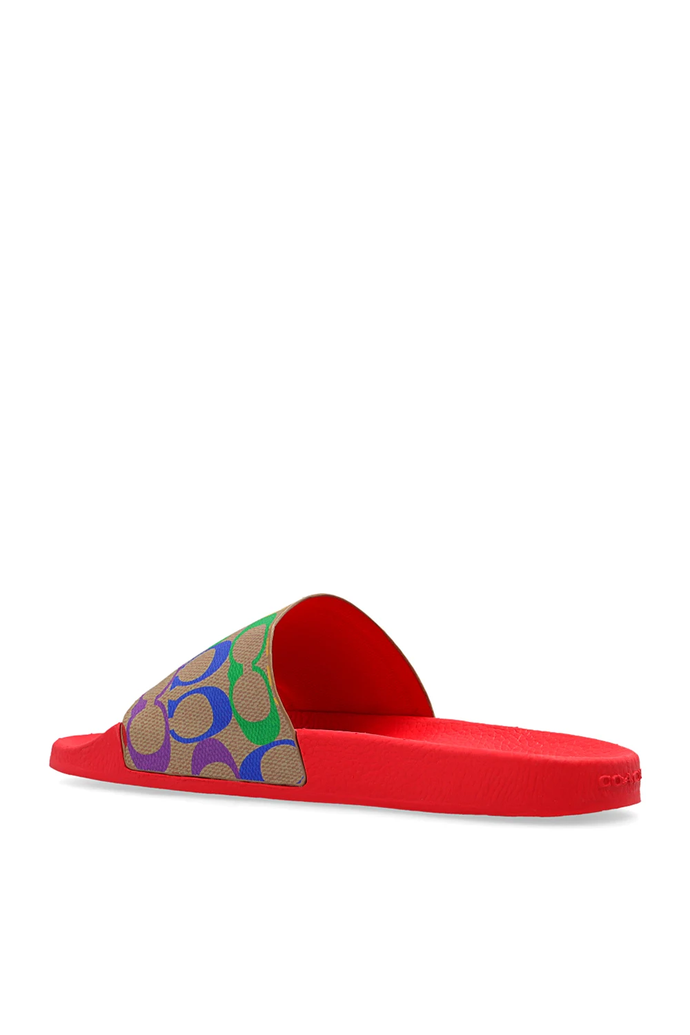 Czerwono-beżowe klapki Coach. Ozdobione kolorowym wzorem z monogramem ‘C’. Czerwona, gumowa podeszwa.