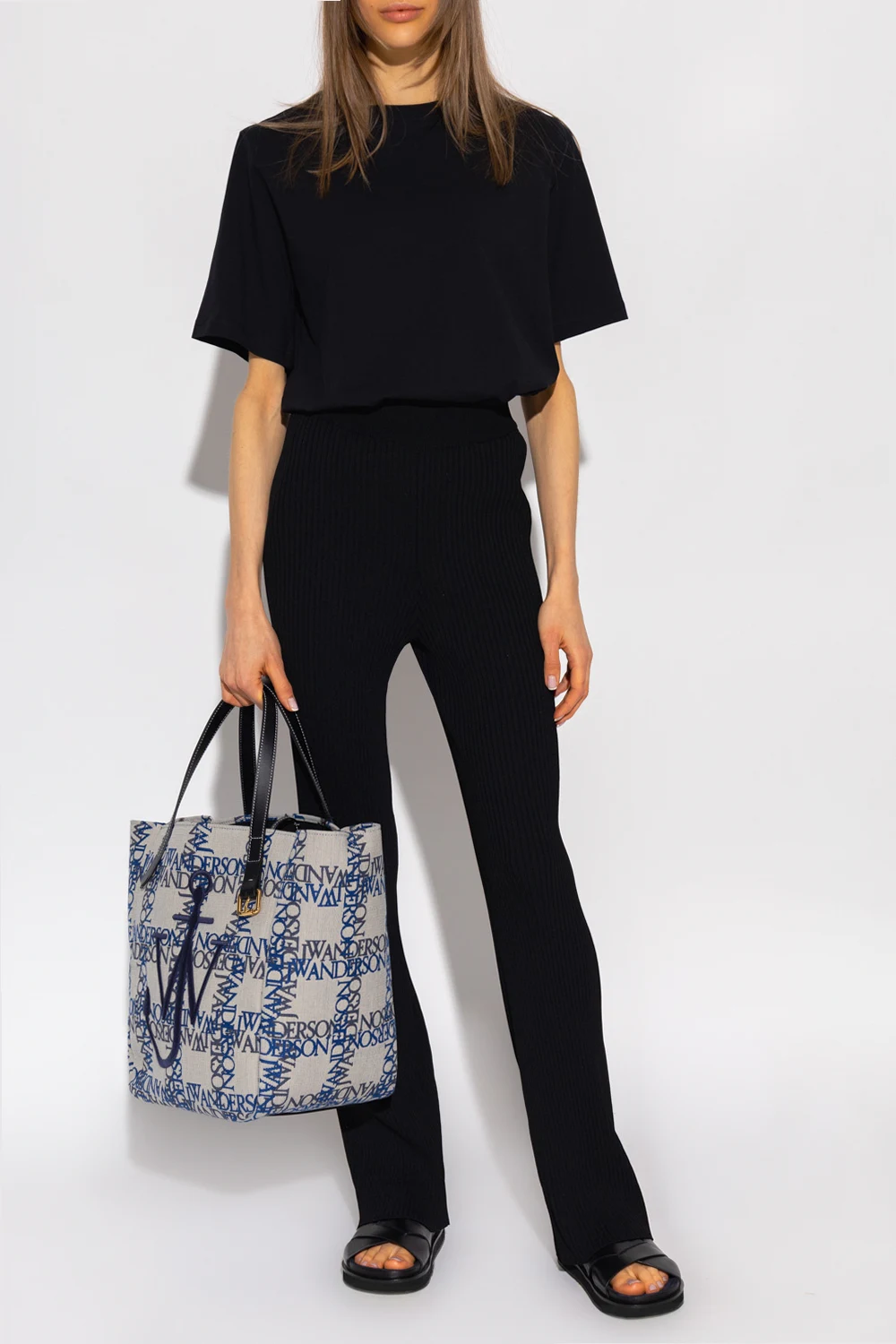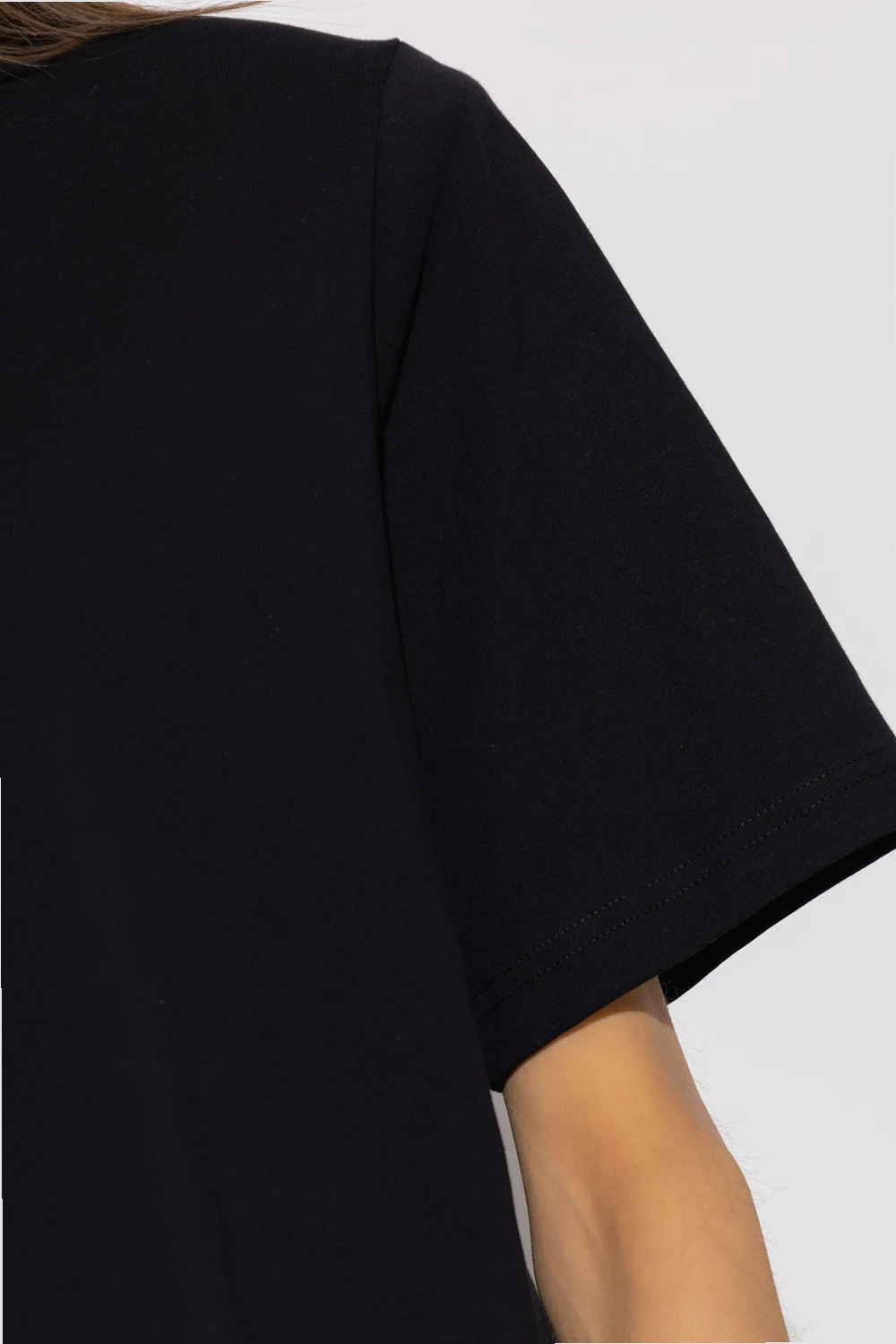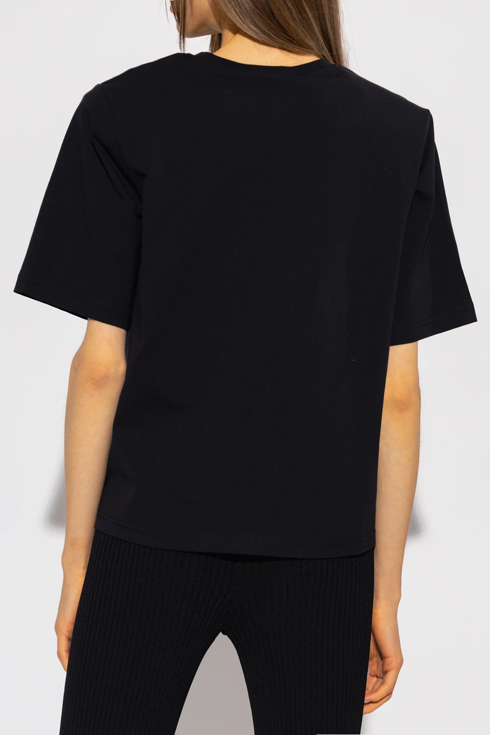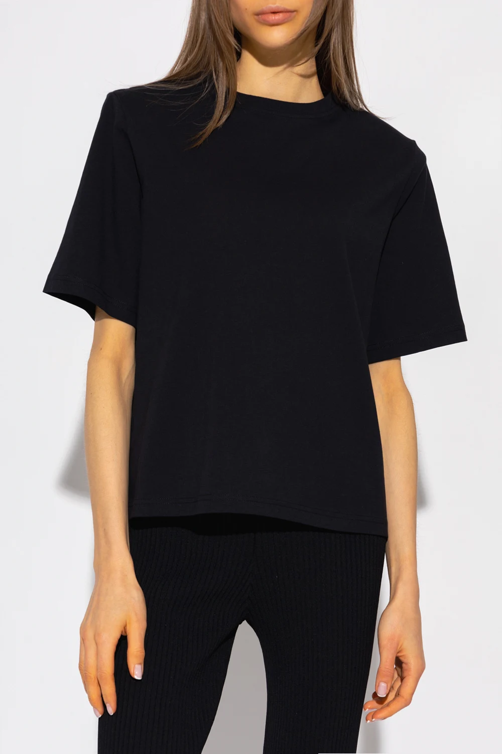 Czarny t-shirt, model ‘Jackson’ Birgitte Herskind. Wykonany z bawełny organicznej. W ramionach wszyte poduszki. Okrągły dekolt wykończony ściągaczem, krótkie rękawy.