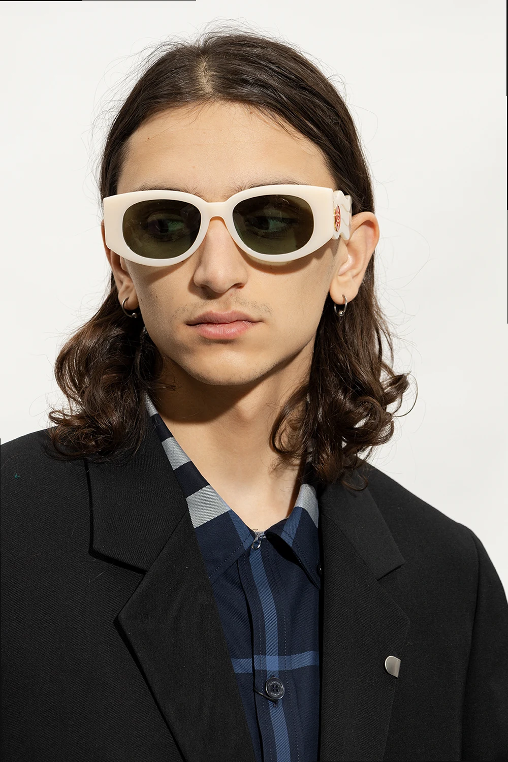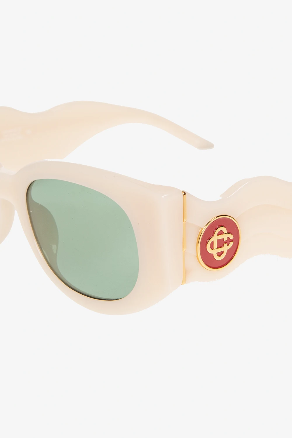 Kremowe okulary przeciwsłoneczne Casablanca. Grube, owalne oprawki z pojedynczym mostkiem wykonane z acetatu. Charakterystyczne dla marki szerokie, falowane zauszniki z wyrzeźbionym wzorem ozdobione czerwoną aplikacją z logo. Zielone, nylonowe szkła z ochroną przed promieniami UV. Dołączone etui.