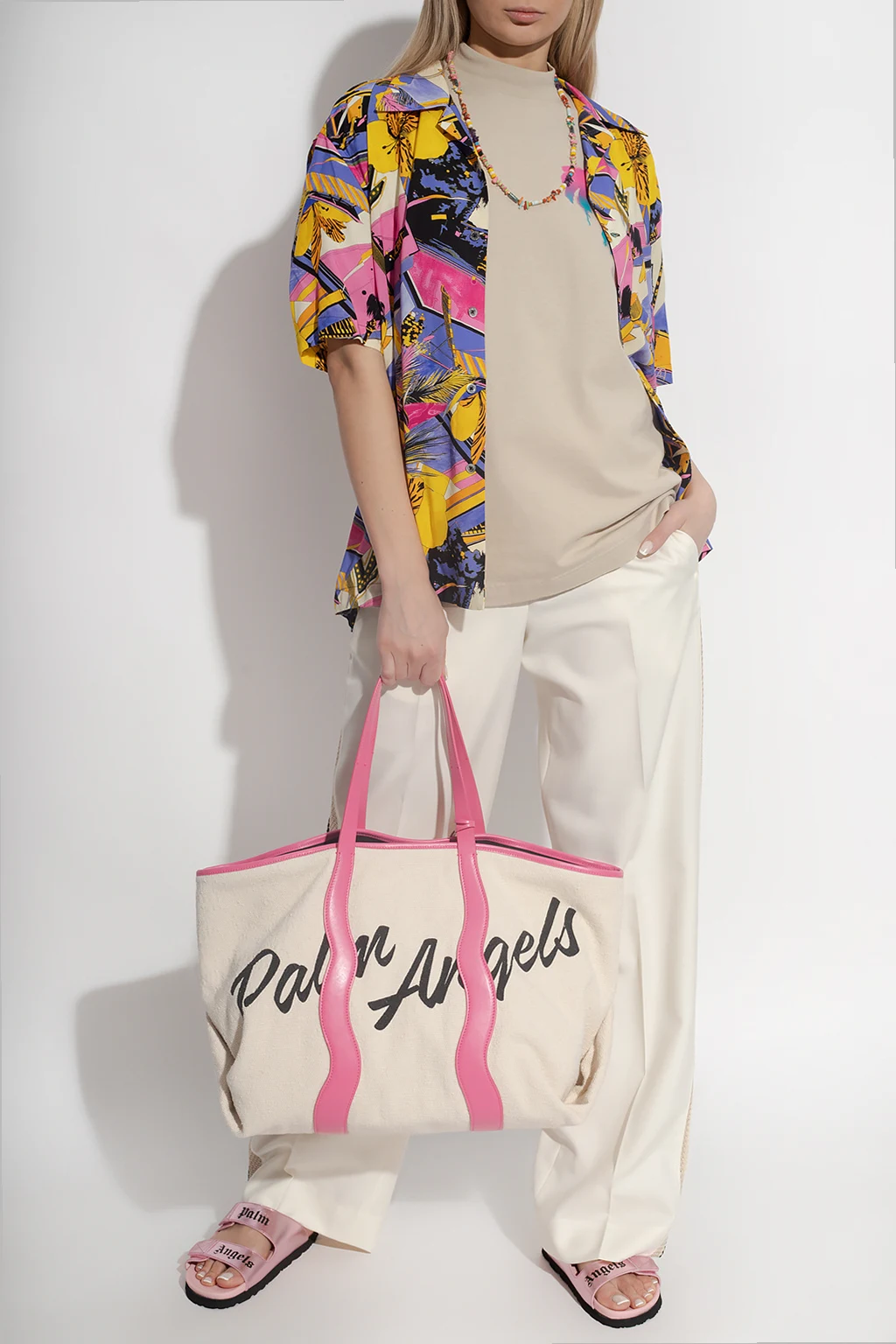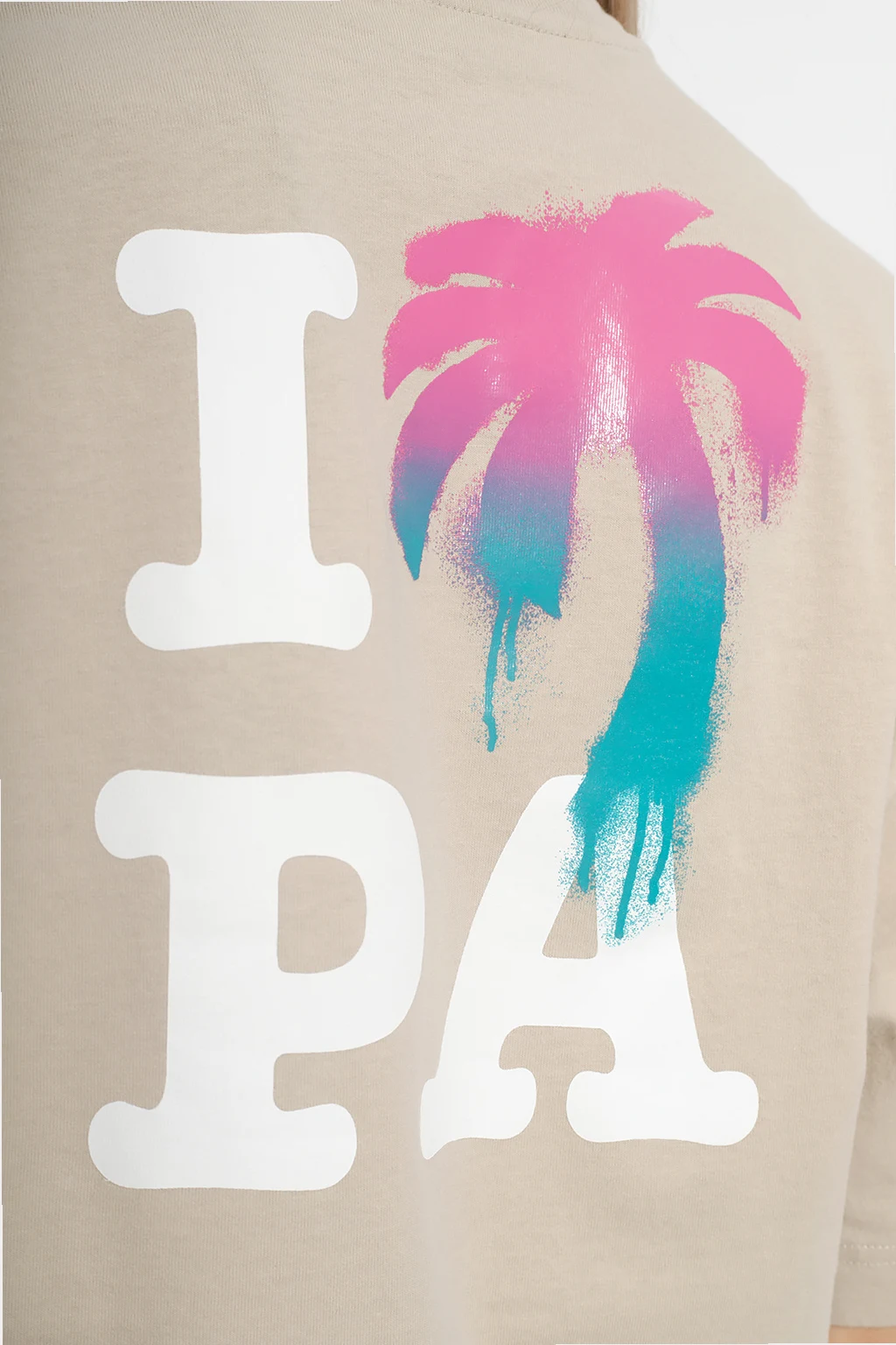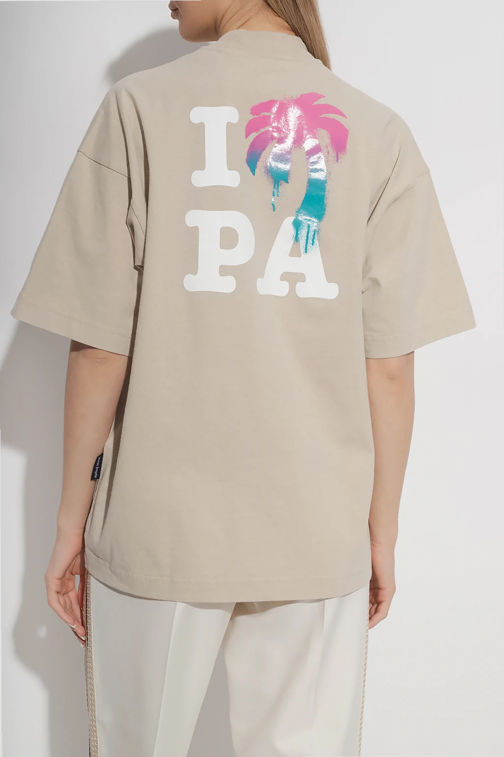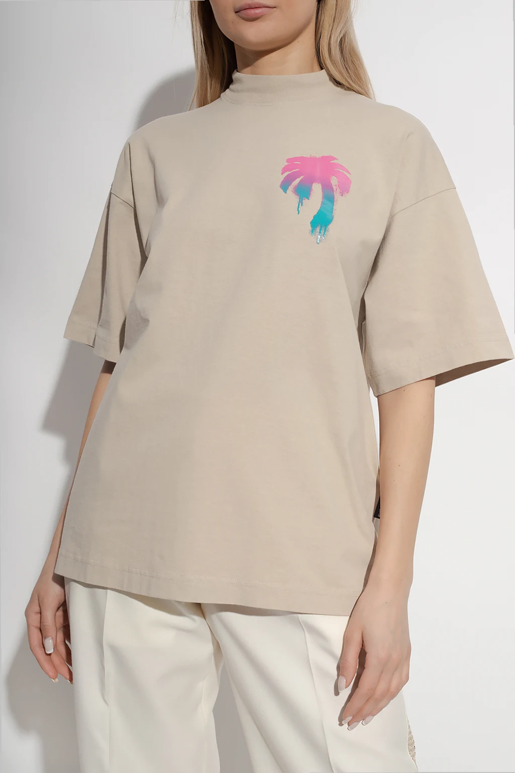 Beżowy, bawełniany t-shirt o luźnym kroju Palm Angels. Ozdobiony kolorowym nadrukiem z charakterystycznym motywem palmy. Dekolt ze stójką. Krótkie rękawy.