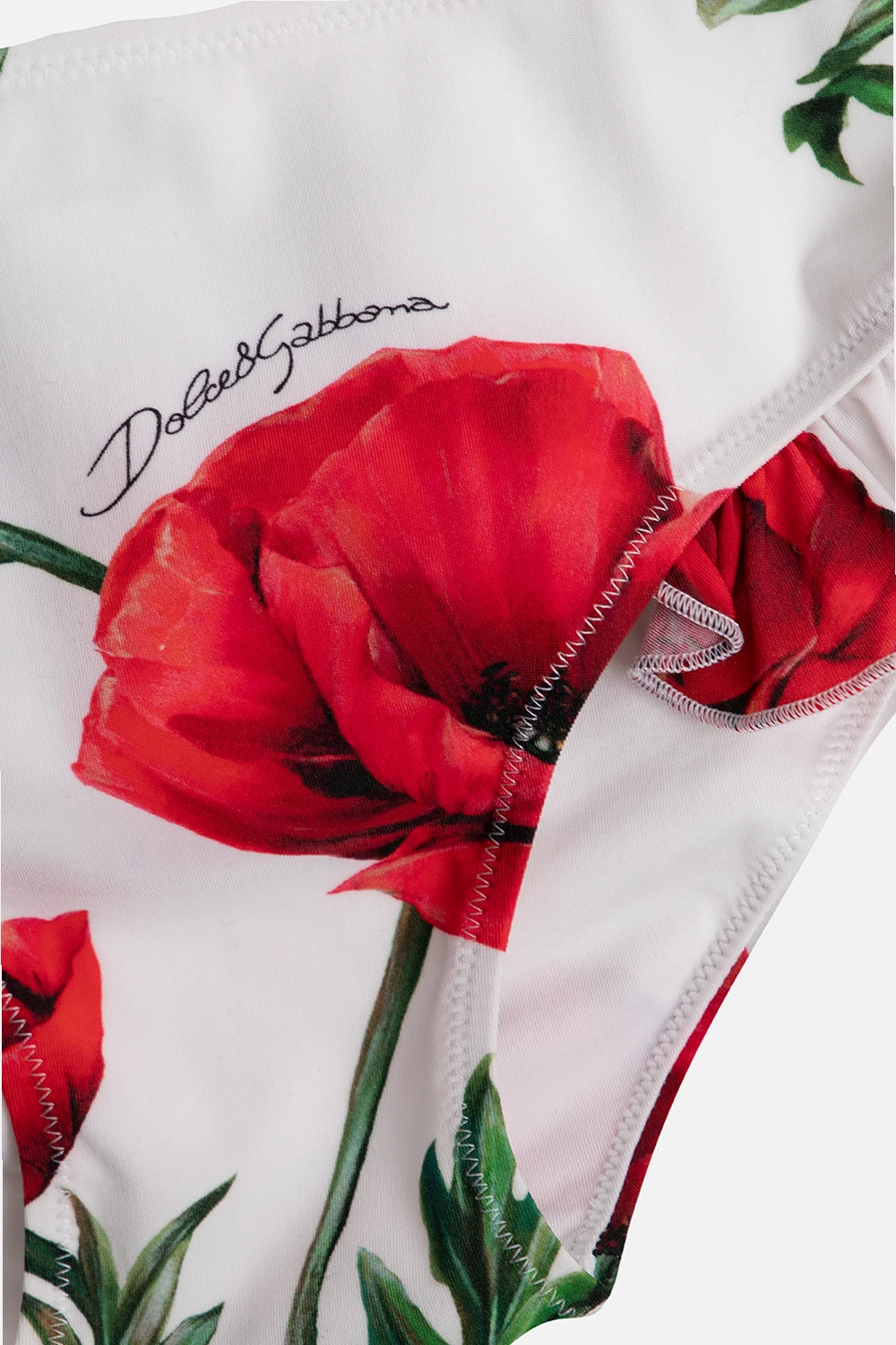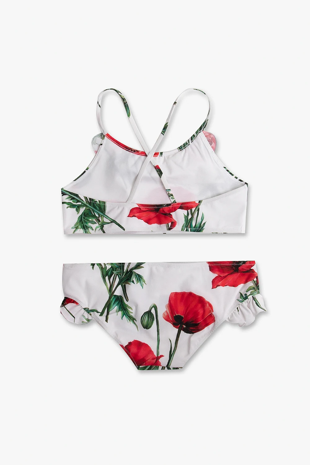 Biały, dwuczęściowy kostium kąpielowy Dolce & Gabbana Kids. Ozdobiony kolorowym nadrukiem z motywem kwiatowym i logo. Dekoracyjne falbany. Góra z krzyżującymi się ramiączkami na plecach.