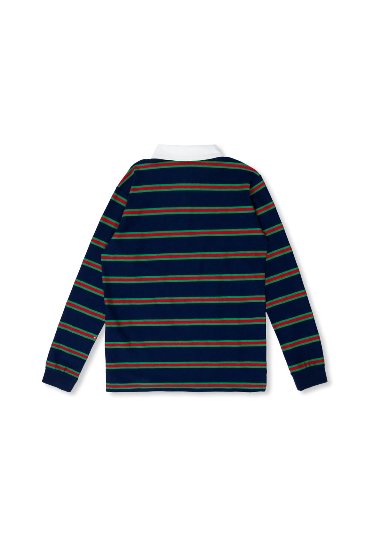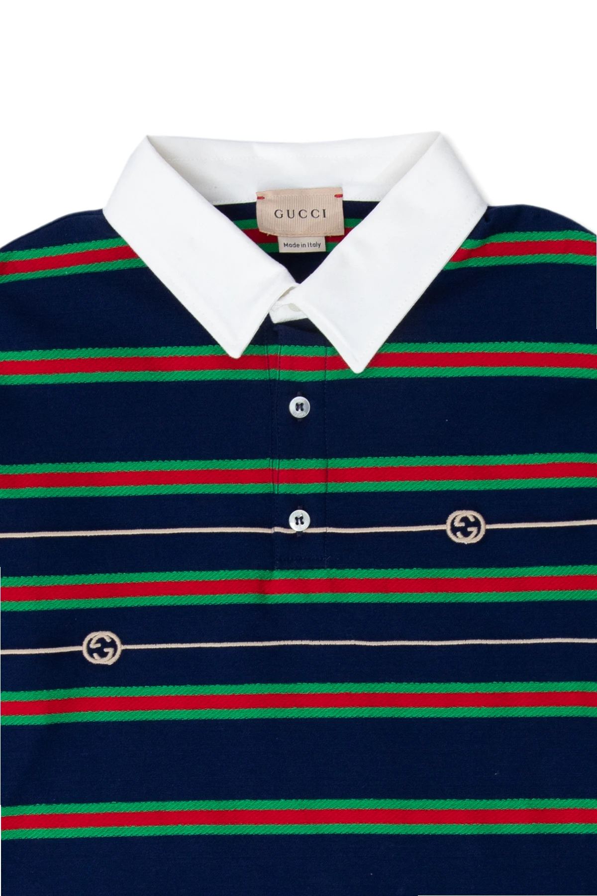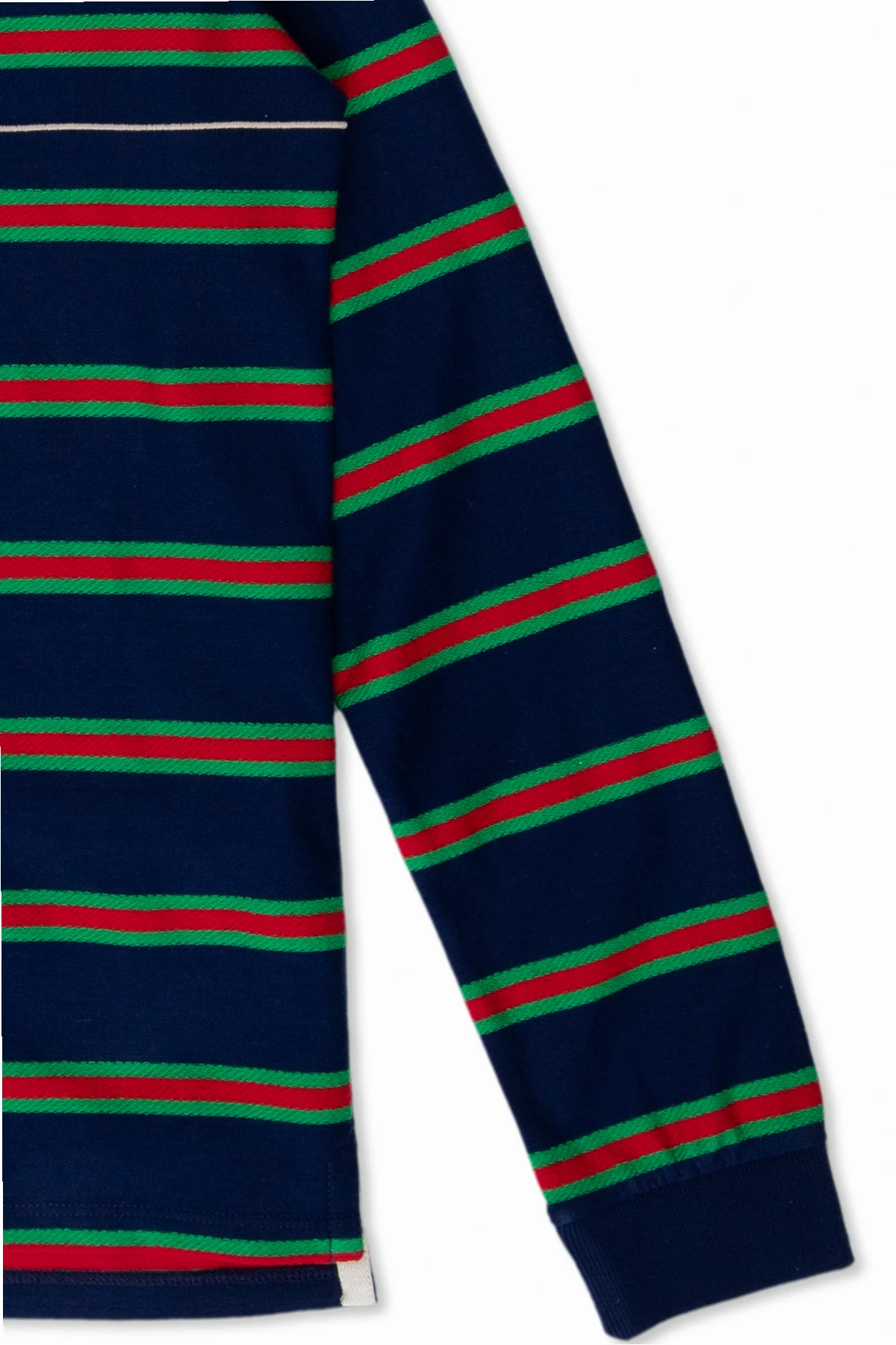 Granatowe polo Gucci Kids. Wykonane z bawełny. Pod szyją zapinane na guziki. Biały kołnierz. Ozdobione wzorem w paski z motywem paska ‘Web’ w kolorze zielono-czerwono-zielonym oraz kremowym, wyszytym logo. Długie rękawy zakończone ściągaczem.