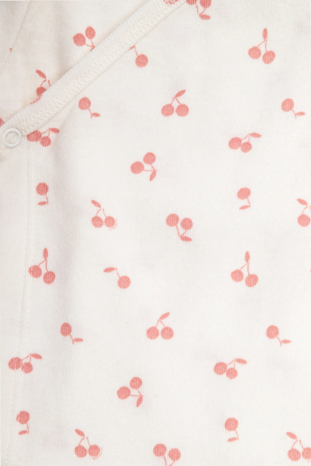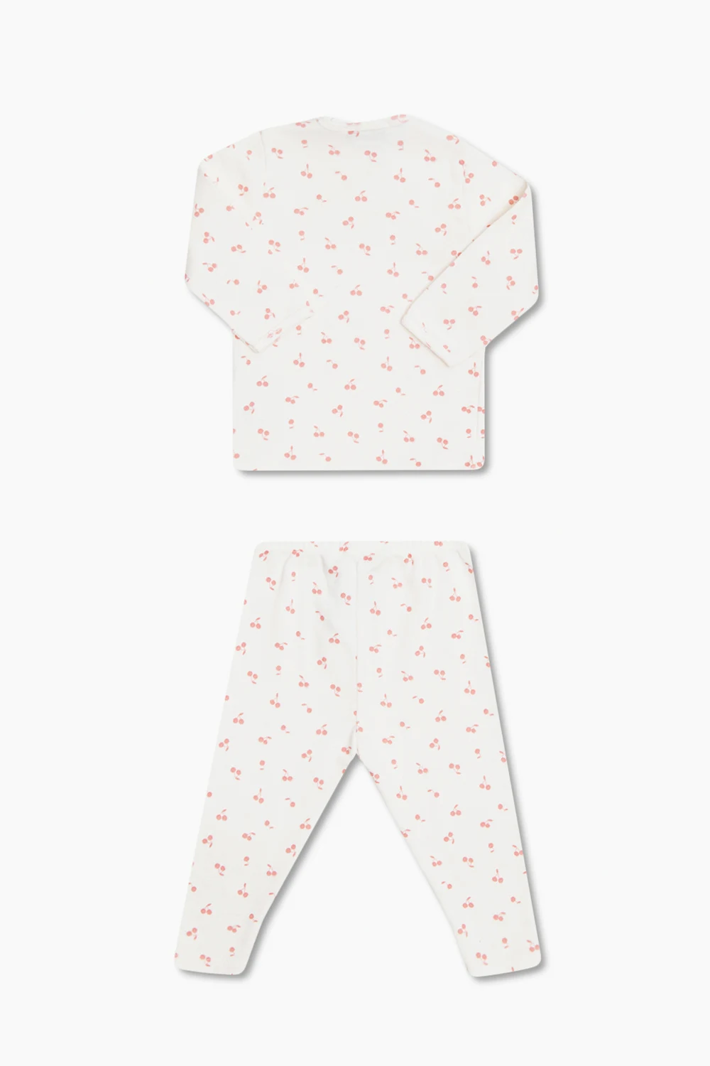 Biały, bawełniany zestaw: top i spodnie Bonpoint. Ozdobiony różowym nadrukiem z charakterystycznym motywem wiśni. Bluzka z kopertowym zapięciem na zatrzaski z przodu. Długie rękawy. Spodnie z wszytą gumą.