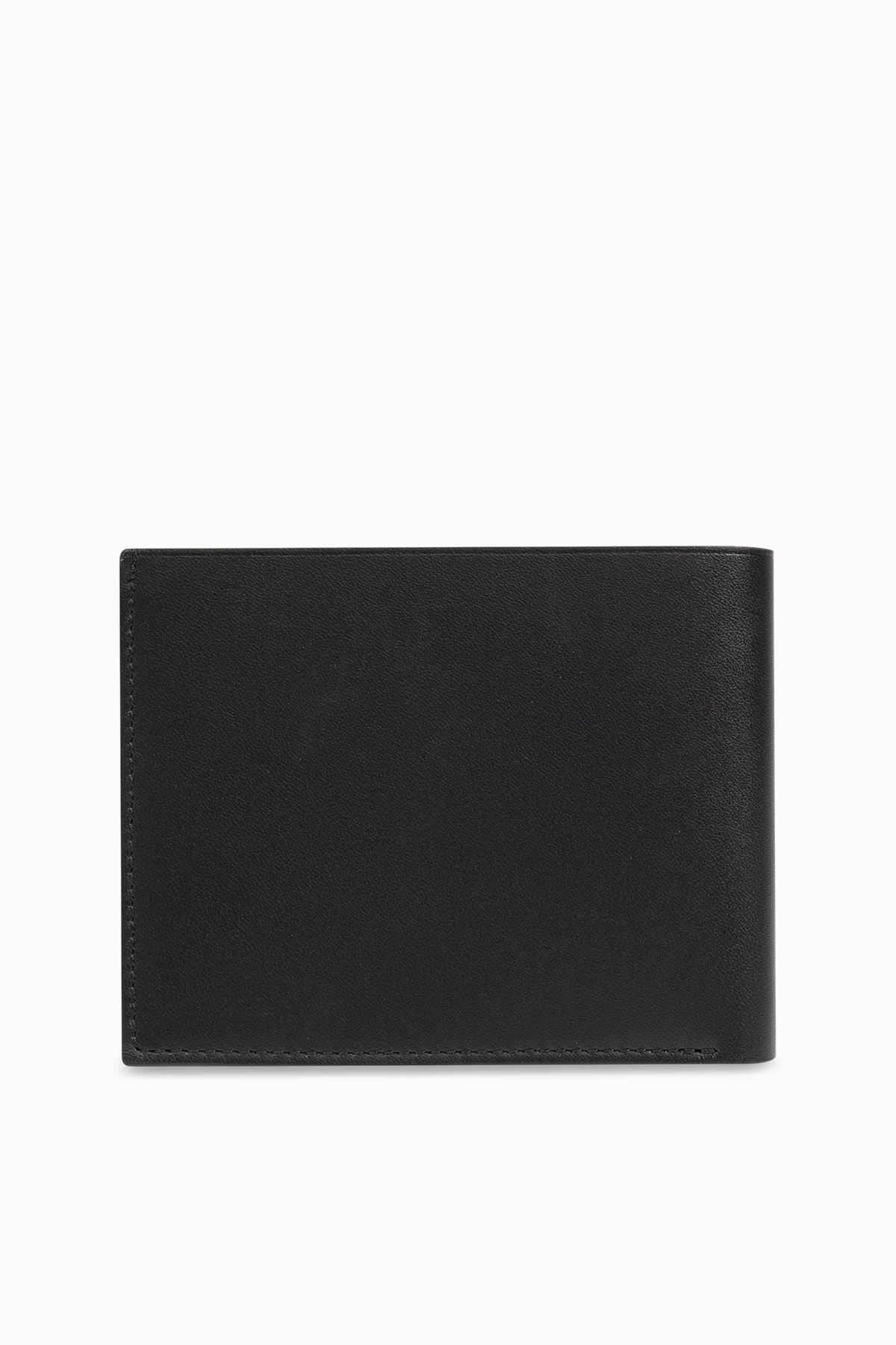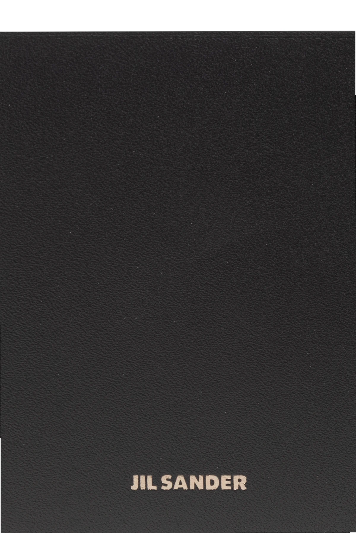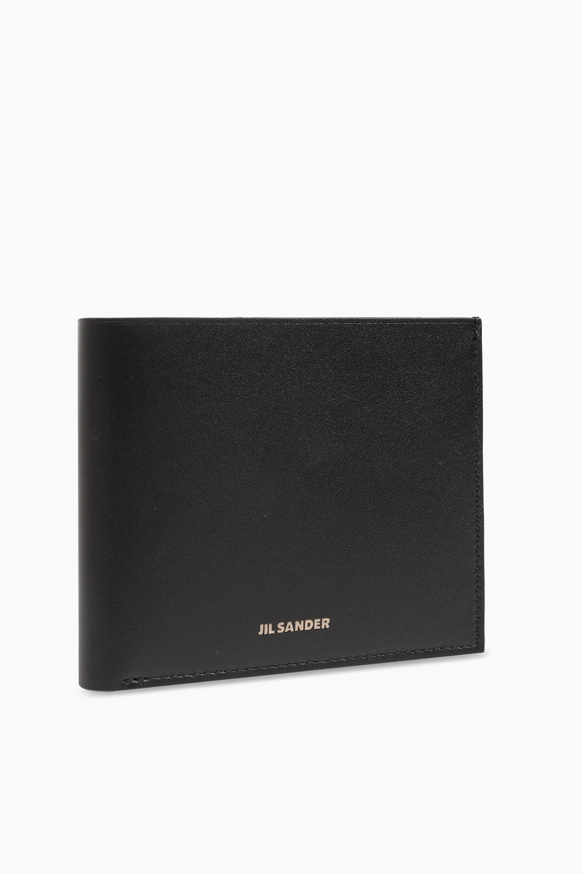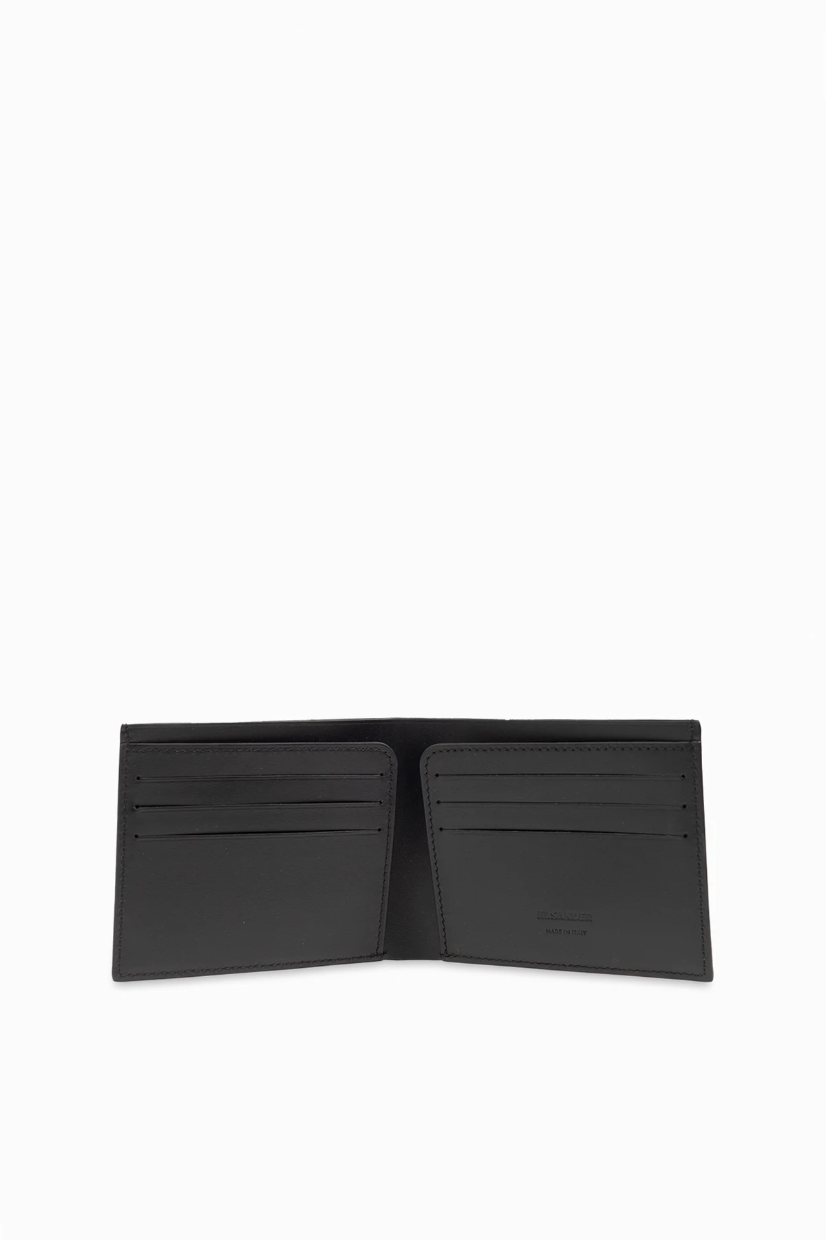 Czarny, składany portfel JIL SANDER. Wykonany ze skóry cielęcej. Z przodu ozdobiony nadrukowanym logo. Wewnątrz przegroda na banknoty, dwie wsuwane kieszenie oraz sześć miejsc na karty.