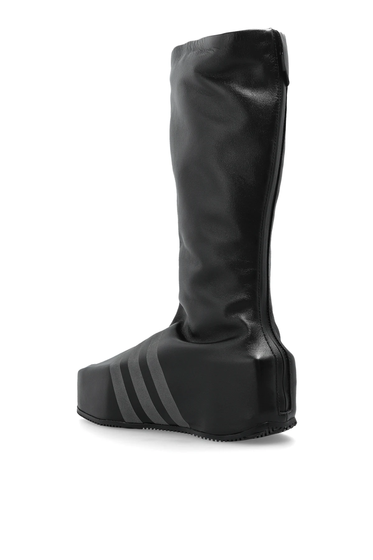 Buty charakteryzują się wysoką cholewką , która sięga do połowy łydki, oraz gładką, jednolitą powierzchnią wykonaną z wodoodpornego materiału syntetycznego, co podkreśla ich funkcjonalność. Na bokach widoczne są trzy poziome paski, a płaska podeszwa zapewnia wygodę noszenia. Dominujący kolor czarny nadaje im uniwersalności i wyrafinowania.