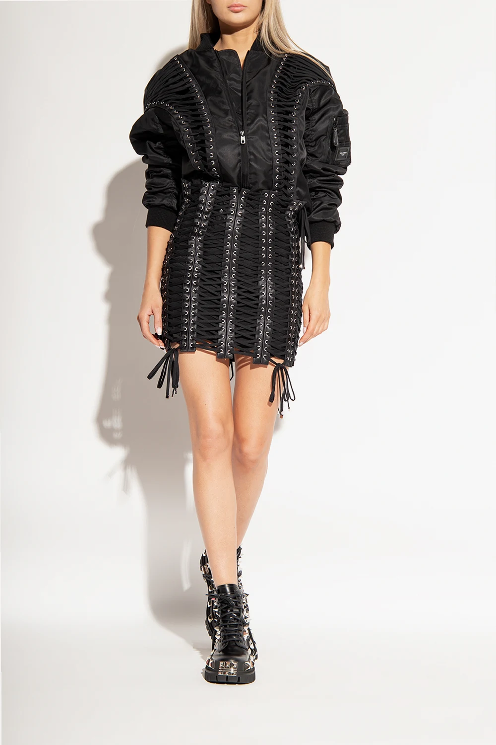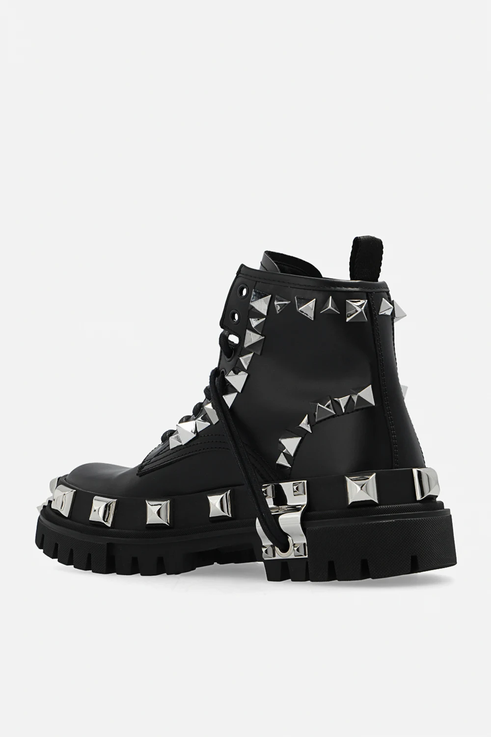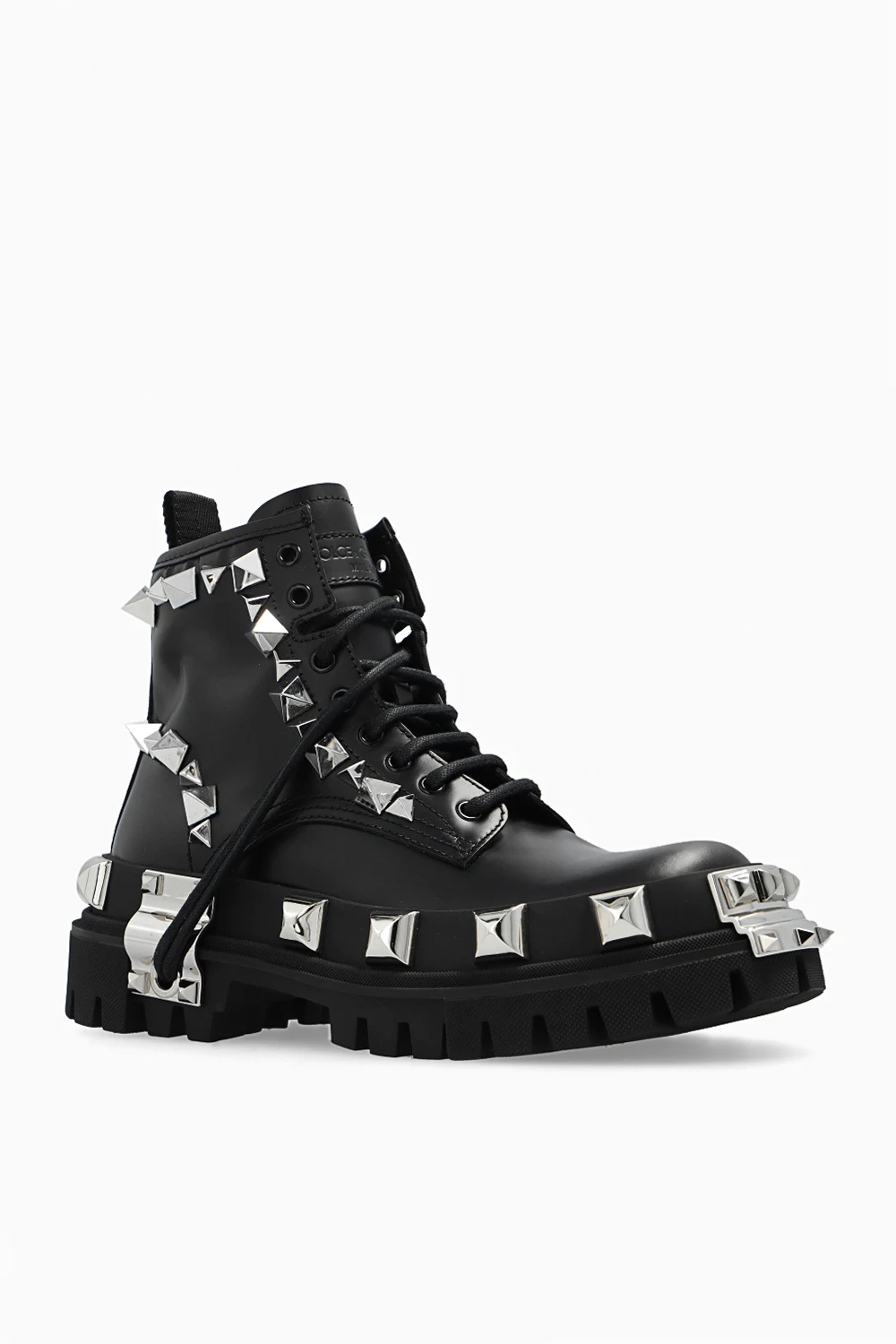 Czarne, sznurowane buty typu ‘combat’ Dolce & Gabbana. Wykonane ze skóry cielęcej. Ozdobione metalowymi ćwiekami o różnych wielkościach. Na języku naszywka z wytłoczonym logo. Czarna, gumowa podeszwa.