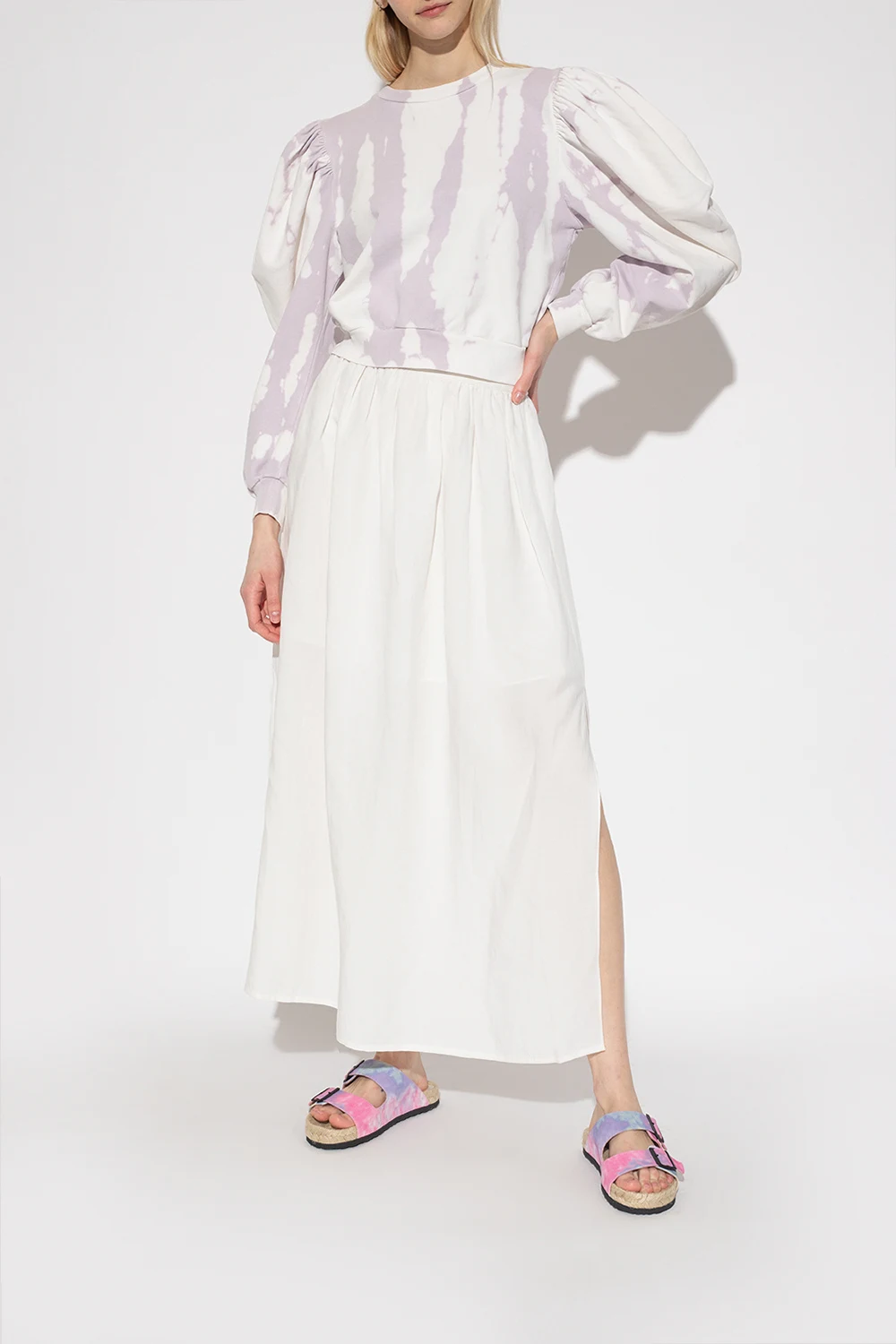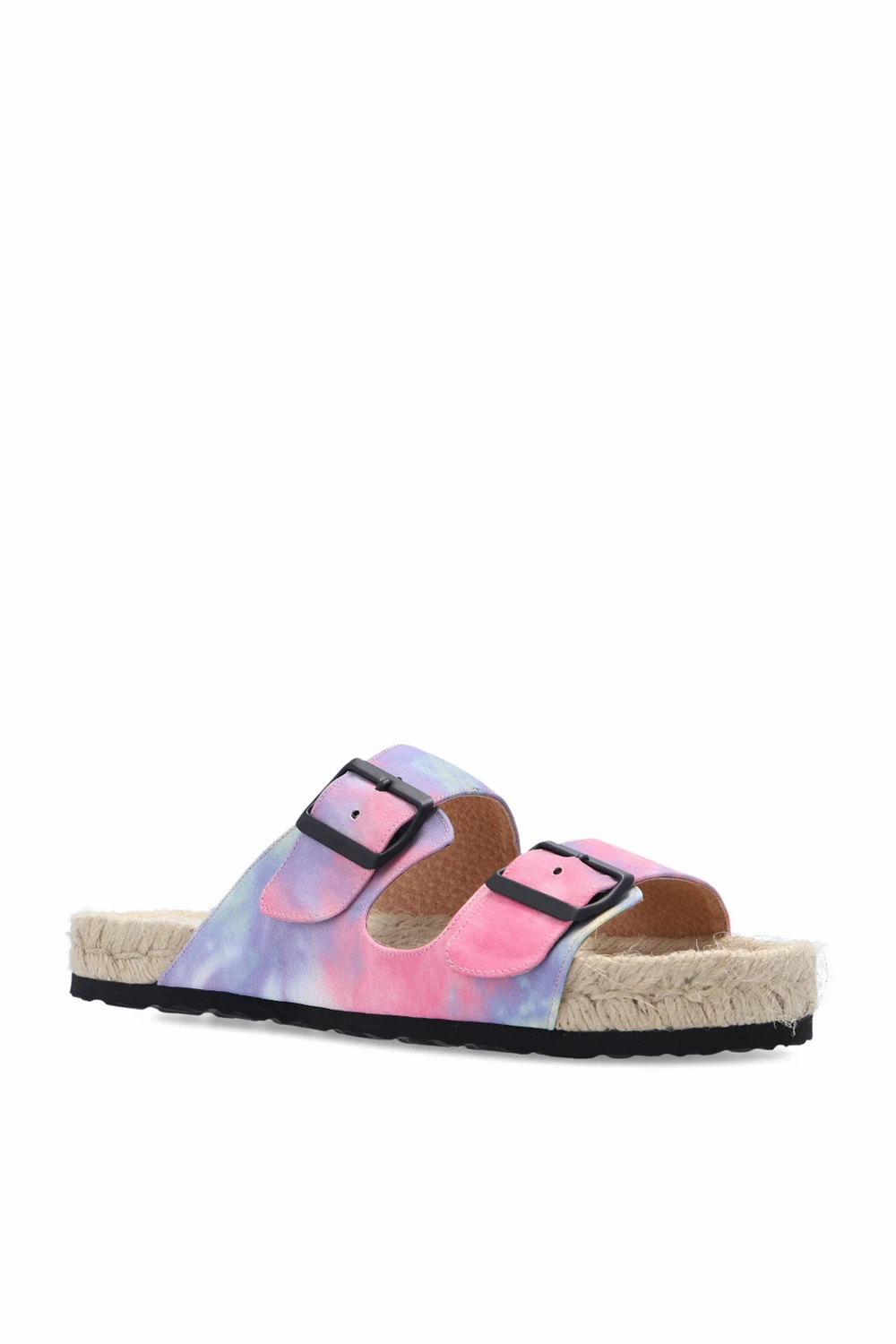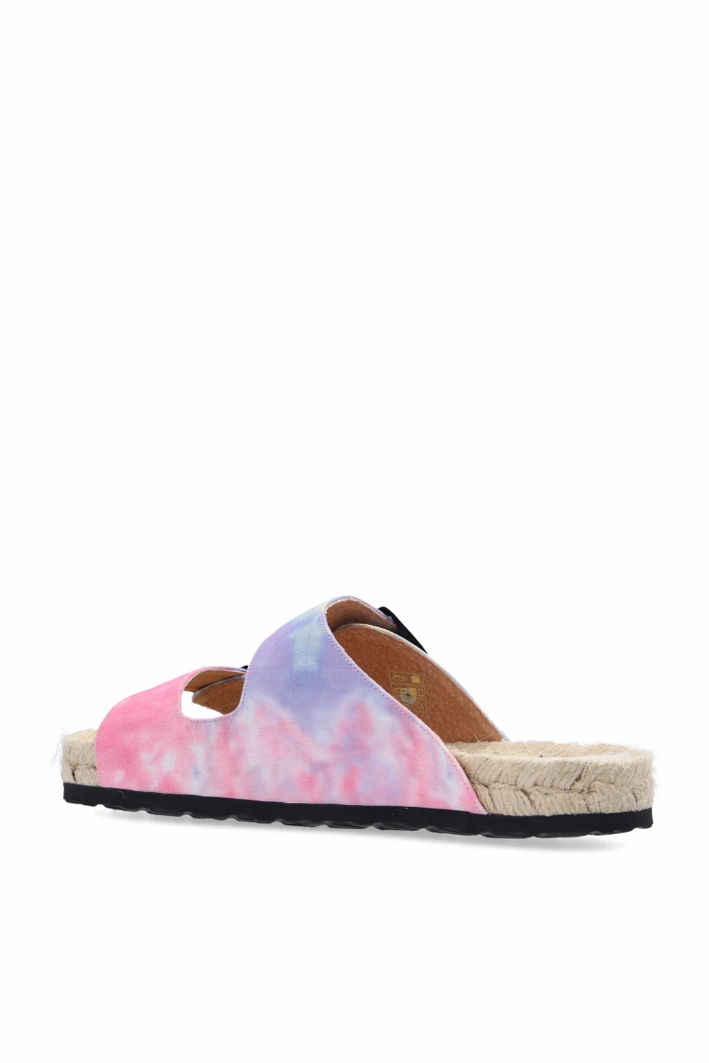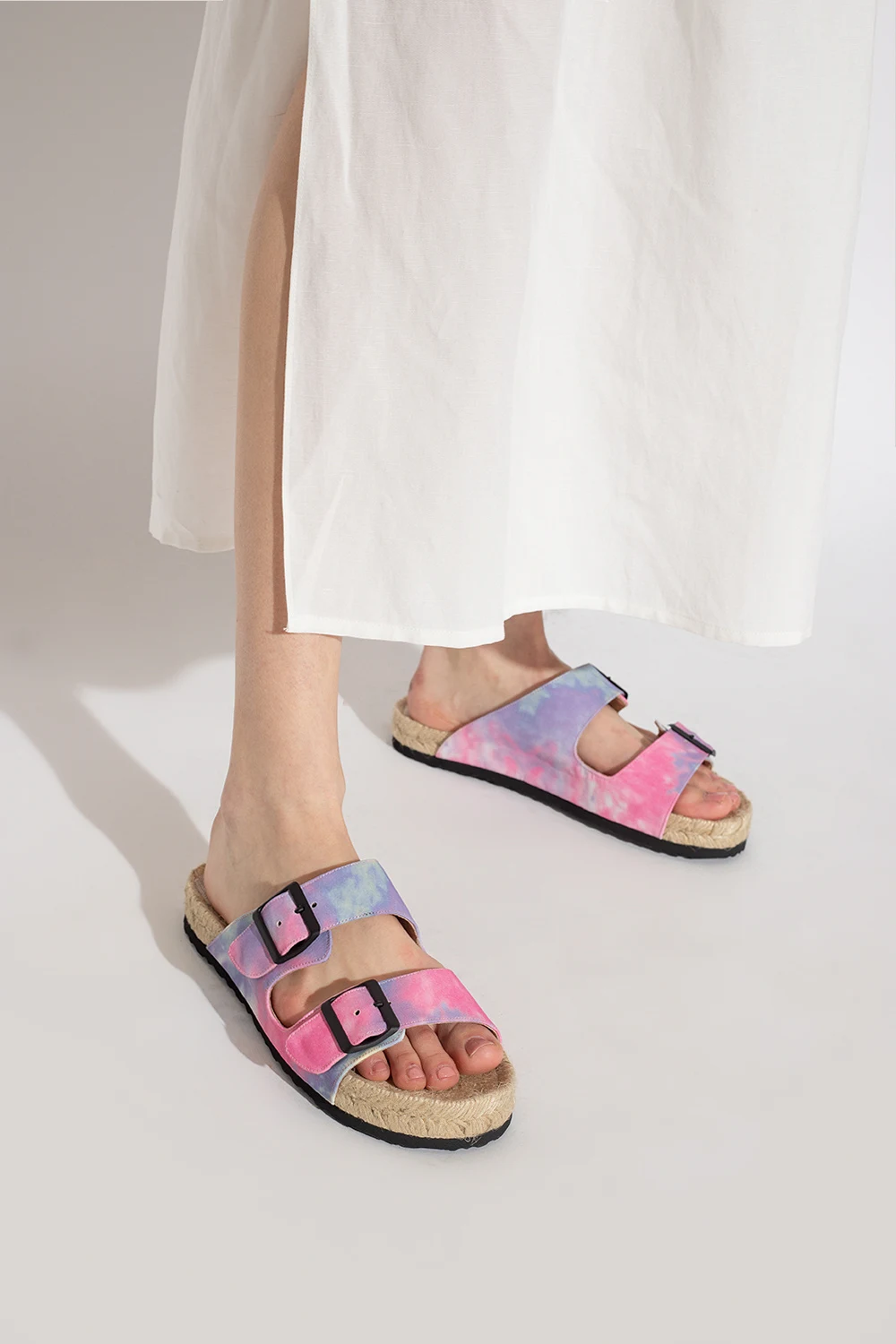 Kolorowe klapki z motywem ‘tie-dye’ Manebi. Wykonane z bawełny. Zapinane na paski z klamrą w kolorze czarnym. Podeszwa wykonana z naturalnej juty wykończonej cienką warstwą kauczuku w kolorze czarnym.