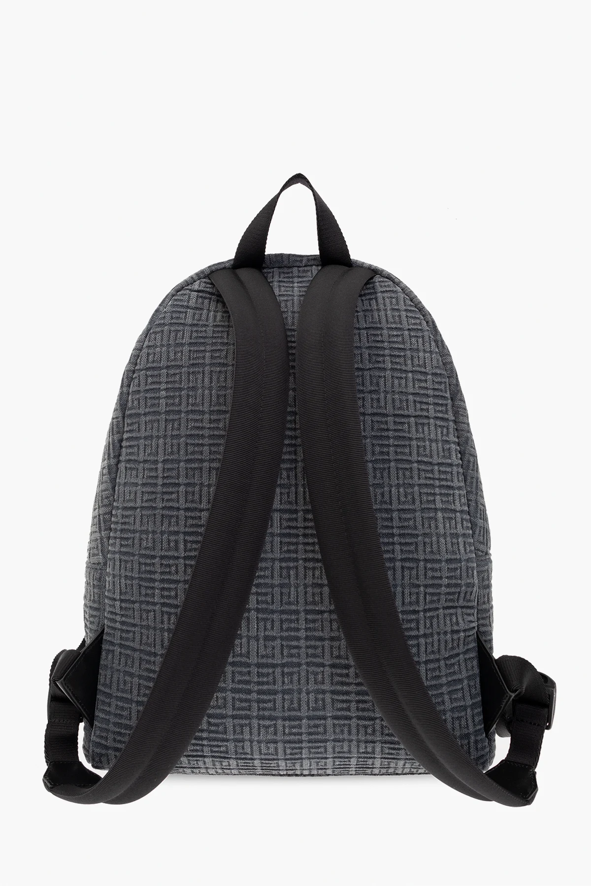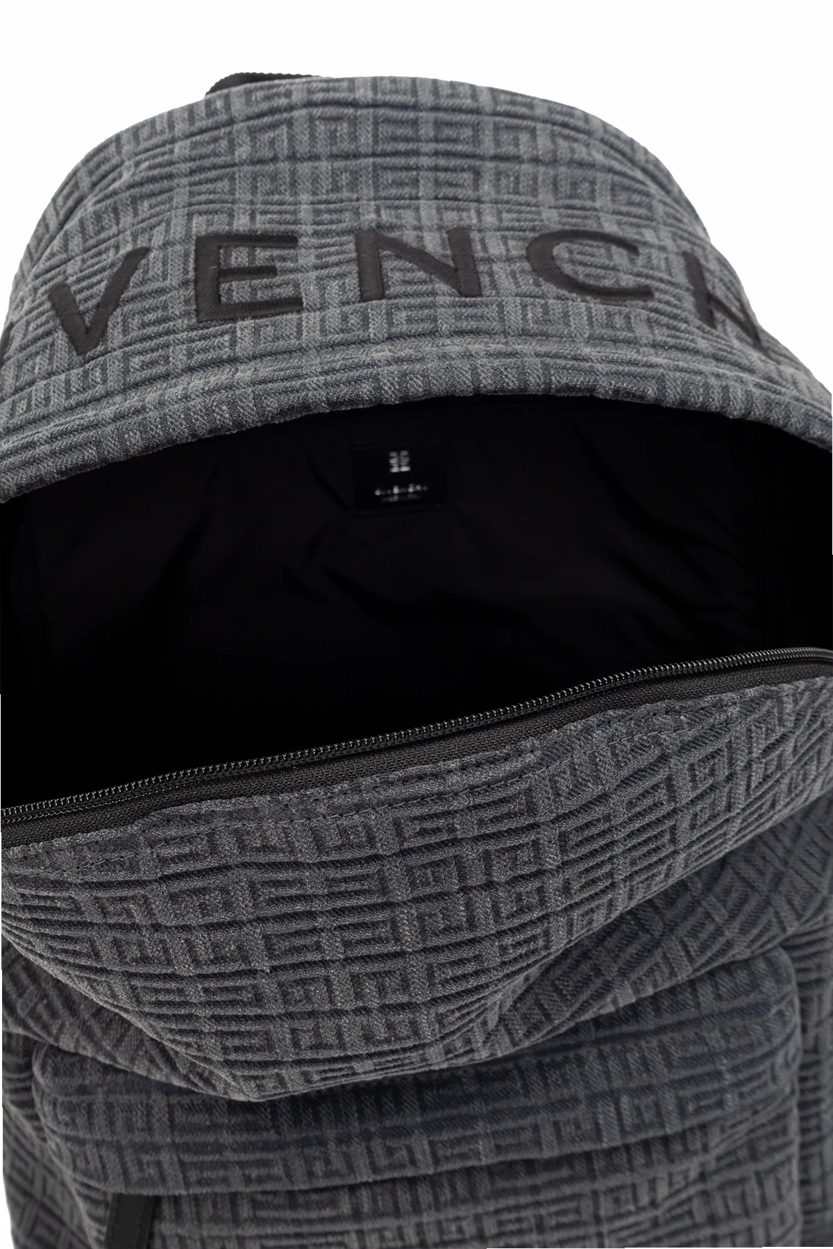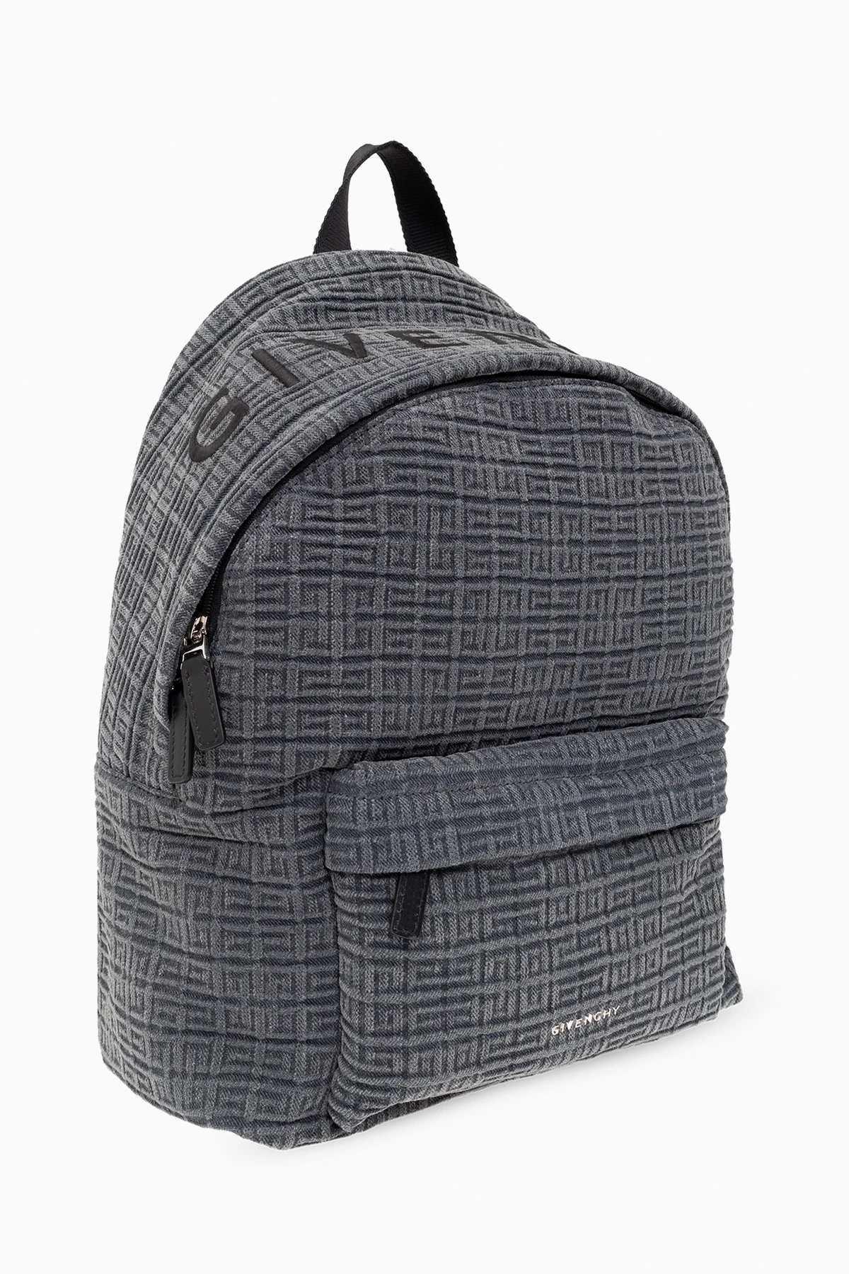 Ciemnoszary, jeansowy plecak, model ‘Essential U’ Givenchy. Zamykany na dwubiegunowy zamek. Ozdobiony żakardowym wzorem z monogramem oraz wyszytym czarną nicią logo. Z przodu kieszeń z zamknięciem na zamek oraz metalowa aplikacja w kolorze srebrnym. Na górze krótki uchwyt, z tyłu regulowane szelki. Wewnątrz komora z wsuwaną kieszenią.