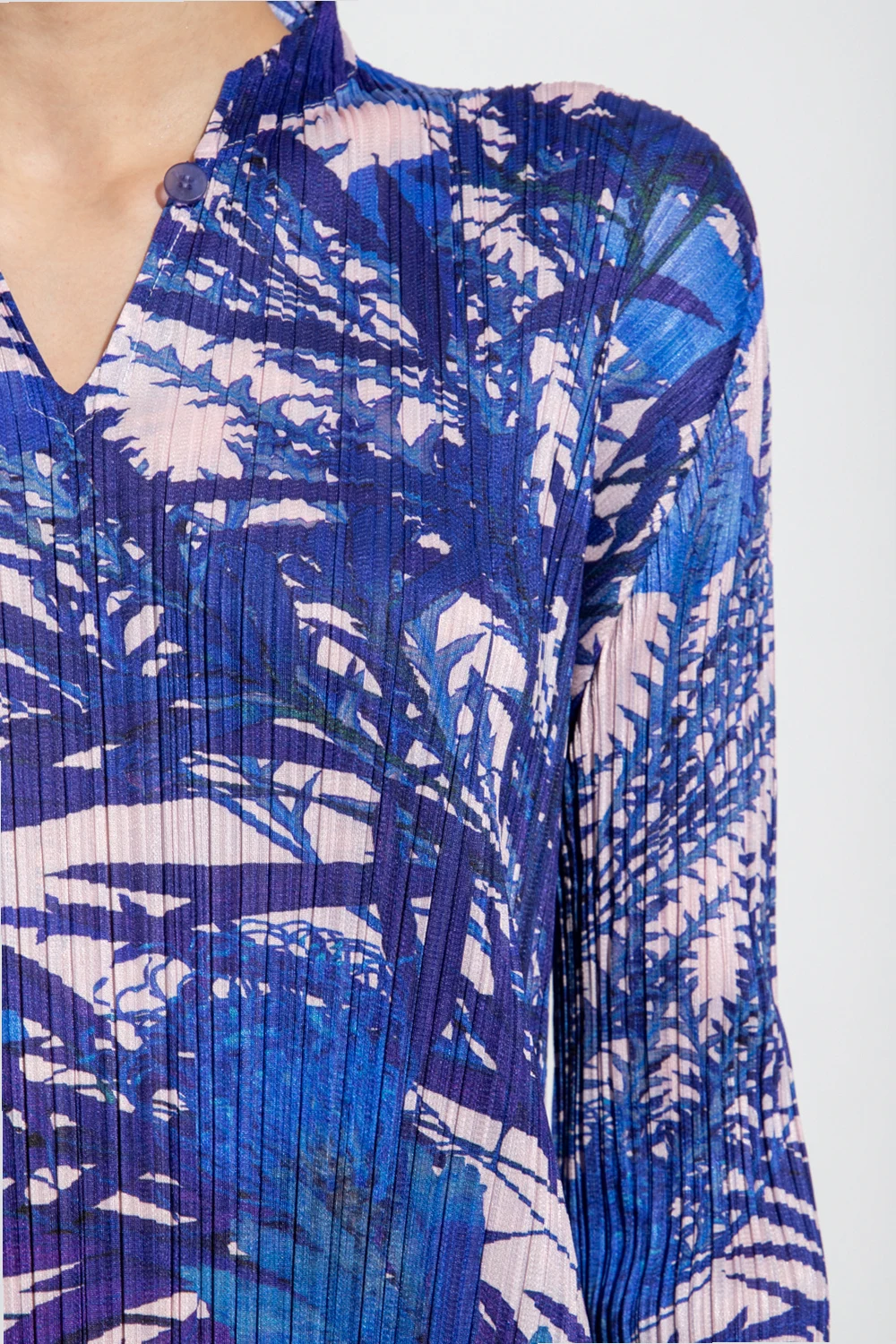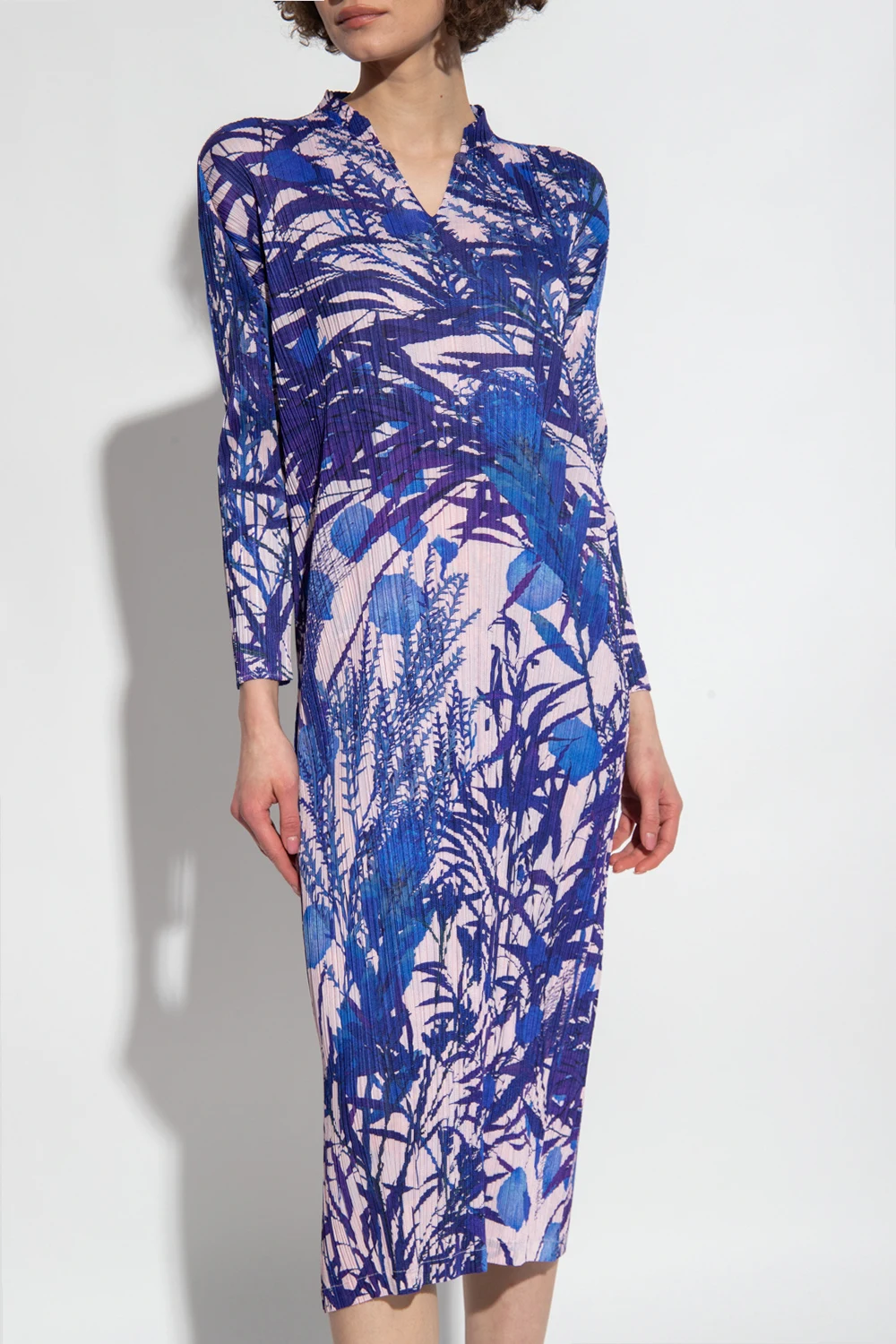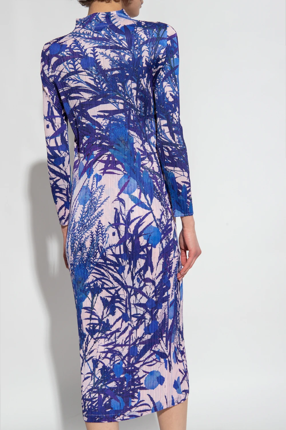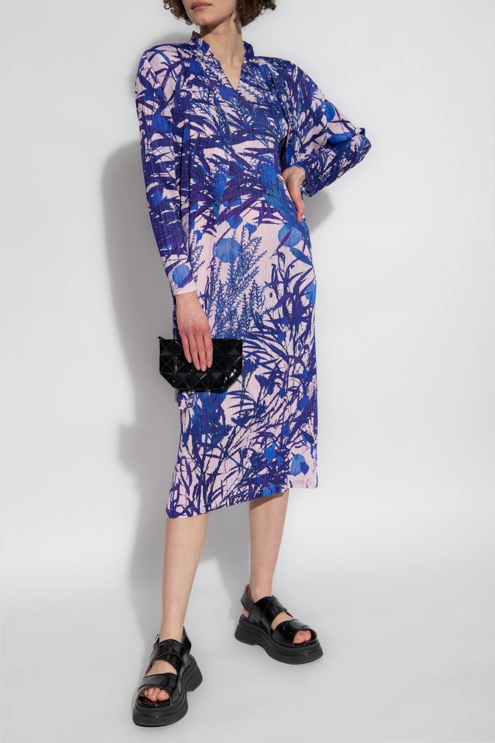 Jasnoróżowa, plisowana sukienka Issey Miyake Pleats Please. Ozdobiona fioletowo-granatowym wzorem z motywem roślinnym. Dekolt w szpic zakończony stójką z zapięciem na guzik. Długie rękawy.